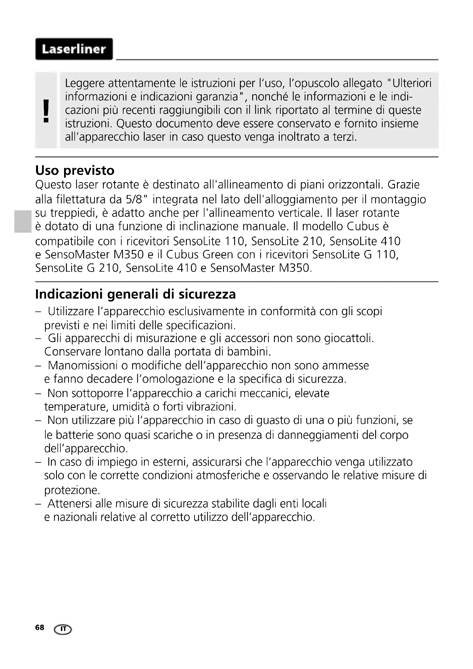 Indicazioni generali di sicurezza – Utilizzare l‘apparecchio esclusivamente in conformità con gli scopi previsti e nei limiti delle specicazioni. – Gli apparecchi di misurazione e gli accessori non sono giocattoli. Conservare lontano dalla portata di bambini. – Manomissioni o modiche dell‘apparecchio non sono ammesse e fanno decadere l‘omologazione e la specica di sicurezza. – Non sottoporre l‘apparecchio a carichi meccanici, elevate temperature, umidità o forti vibrazioni. – Non utilizzare più l‘apparecchio in caso di guasto di una o più funzioni, se le batterie sono quasi scariche o in presenza di danneggiamenti del corpo dell’apparecchio. – In caso di impiego in esterni, assicurarsi che l‘apparecchio venga utilizzato solo con le corrette condizioni atmosferiche e osservando le relative misure di protezione. – Attenersi alle misure di sicurezza stabilite dagli enti locali e nazionali relative al corretto utilizzo dell‘apparecchio. Uso previsto Questo laser rotante è destinato all'allineamento di piani orizzontali. Grazie alla filettatura da 5/8" integrata nel lato dell'alloggiamento per il montaggio su treppiedi, è adatto anche per l'allineamento verticale. Il laser rotante è dotato di una funzione di inclinazione manuale. Il modello Cubus è compatibile con i ricevitori SensoLite 110, SensoLite 210, SensoLite 410 e SensoMaster M350 e il Cubus Green con i ricevitori SensoLite G 110, SensoLite G 210, SensoLite 410 e SensoMaster M350. Leggere attentamente le istruzioni per l‘uso, l’opuscolo allegato "Ulteriori informazioni e indicazioni garanzia", nonché le informazioni e le indi- cazioni più recenti raggiungibili con il link riportato al termine di queste istruzioni. Questo documento deve essere conservato e fornito insieme all‘apparecchio laser in caso questo venga inoltrato a terzi. !Cubus / Cubus Green