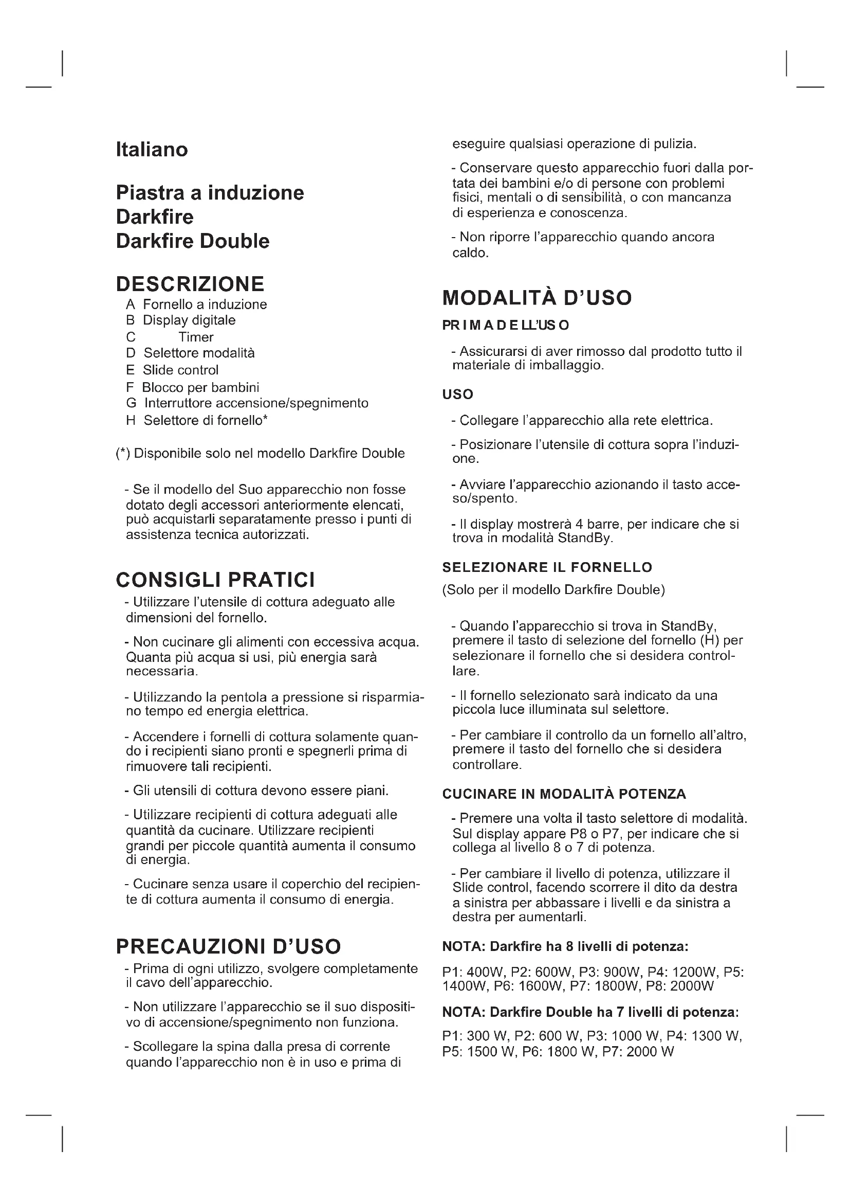 Il display può mostrare vari codici di errore. E0 → Non si rileva un utensile sulla piastra E1 → La piastra non riceve la Tensione su- ciente. E2 → Tensione interna troppo alta. E3 → Termostato aperto E4 → Termostato rotto o non collegato E5 → Termostato della piastra base aperto E6 → Termostato della piastra base rotto o non collegato E7 → Sistema di rilevamento interno della temperatura aperto. E8 → Errore interno non determinato. E9 → Surriscaldamento. Per l’Errore E0, vericare se l’utensile da cucina impiegato è indicato per l’induzione. Per gli errori E1 - E9, portare l’apparato al Servi- zio di Assistenza Tecnica più vicino. PULIZIA - Scollegare la spina dalla rete elettrica e as- pettare che l’apparecchio si rareddi, prima di eseguirne la pulizia. - Pulire il gruppo elettrico con un panno umido,quindi asciugarlo. - Per la pulizia non impiegare solventi o prodotti a pH acido o basico, come la candeggina, né prodotti abrasivi. - Non immergere l’apparecchio in acqua o altri liquidi, né lavarlo con acqua corrente. - Si raccomanda di pulire l’apparecchio periodi- camente e di rimuovere tutti i residui di cibo. - La mancata pulizia periodica dell’apparecchio può provocare il deterioramento delle superci, compromettendone la durata operativa e la sicurezza. MESSAGGI SPECIALIPortuguês Placa de induçao portátil Darkre Darkre Double DESCRIÇÃO A Aquecimento por indução B Ecrã digital C Temporizador D Seletor de modo E Slide Control F Bloqueio infantil G Botão de ligar/desligar H Selector de indução* (*) Apenas disponível no modelo Darkre Double. - Caso o seu modelo de aparelho não disponha dos acessórios descritos anteriormente, pode adquiri-los separadamente nos Serviços de Assistência Técnica.