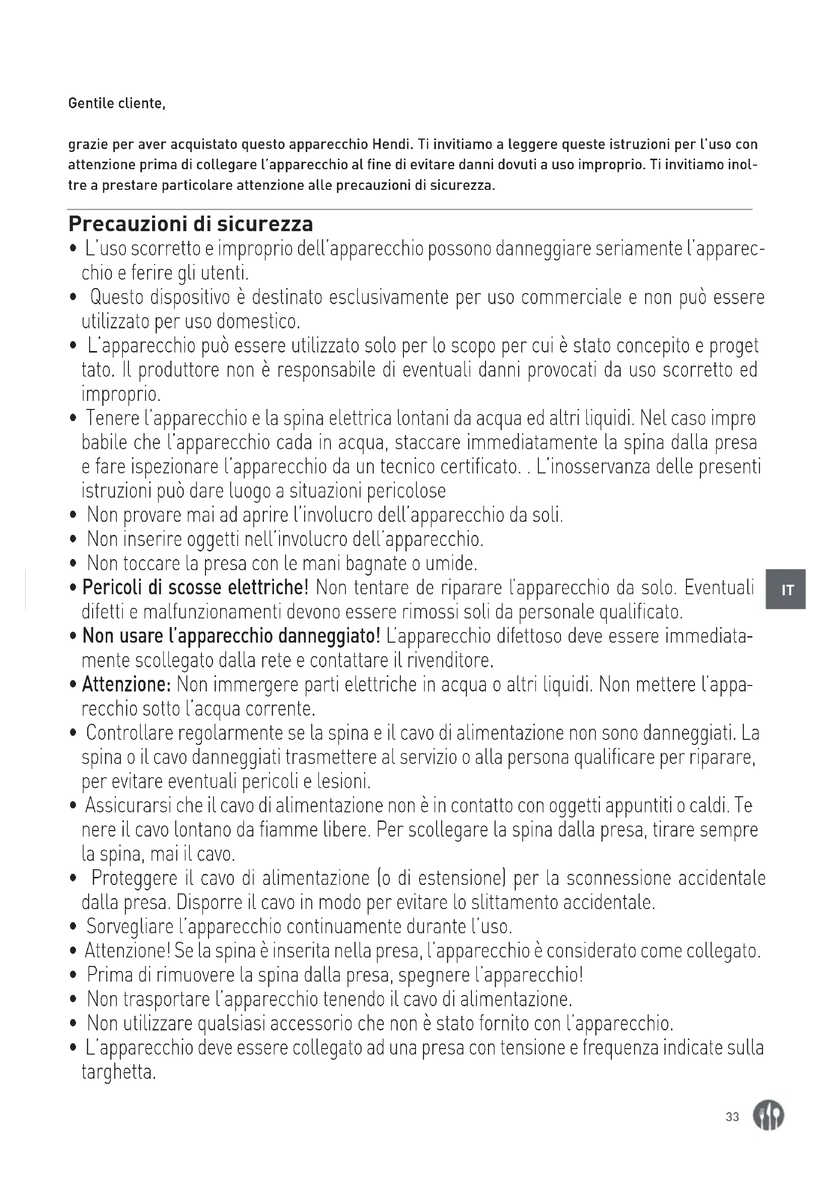 Gentile cliente, grazie per aver acquistato questo apparecchio Hendi. Ti invitiamo a leggere queste istruzioni per l’uso con attenzione prima di collegare l’apparecchio al fine di evitare danni dovuti a uso improprio. Ti invitiamo inol- tre a prestare particolare attenzione alle precauzioni di sicurezza. Precauzioni di sicurezza