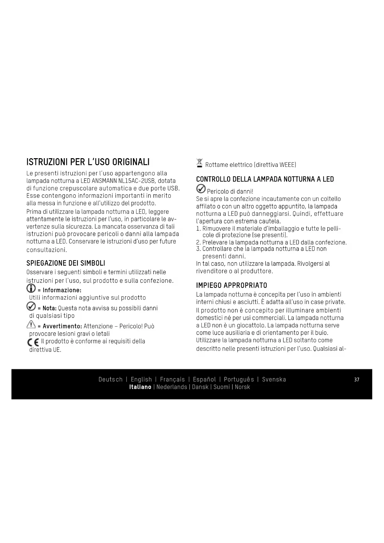 presenti danni. In tal caso, non utilizzare la lampada. Rivolgersi al rivenditore o al produttore. IMPIEGO APPROPRIATO La lampada notturna è concepita per l’uso in ambienti interni chiusi e asciutti. È adatta all’uso in case private. Il prodotto non è concepito per illuminare ambienti domestici né per usi commerciali. La lampada notturna a LED non è un giocattolo. La lampada notturna serve come luce ausiliaria e di orientamento per il buio. Utilizzare la lampada notturna a LED soltanto come descritto nelle presenti istruzioni per l'uso. Qualsiasi al- Deutsch | English | Français | Español | Português | Svenska Italiano | Nederlands | Dansk | Suomi | Norsk38 tro impiego è considerato improprio e può causare danni materiali. Il produttore e il rivenditore non si assumono nessuna responsabilità per eventuali danni provocati dall'uso non appropriato o errato.