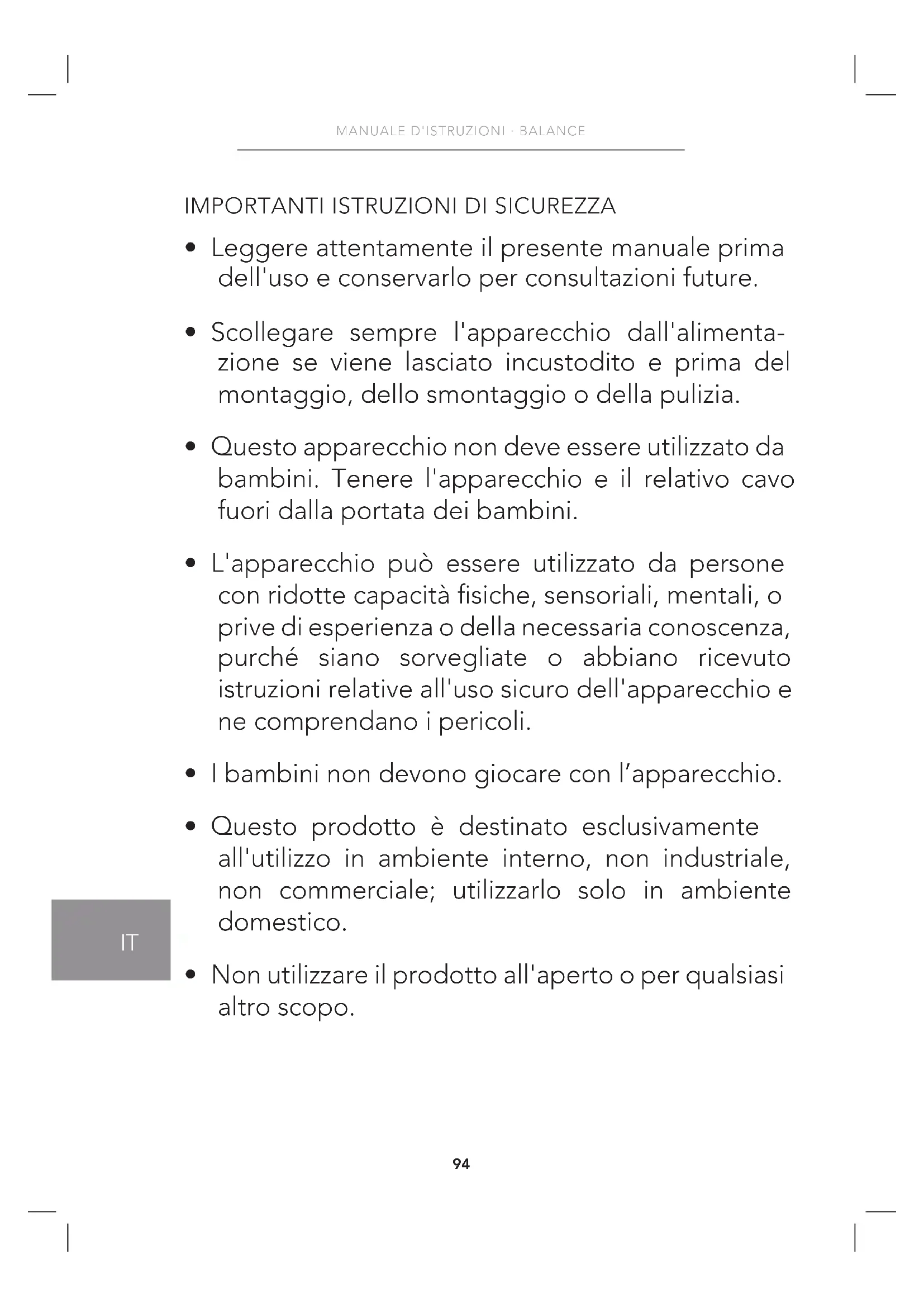 - Non utilizzare il prodotto all'aperto o per qualsiasi altro scopo.95