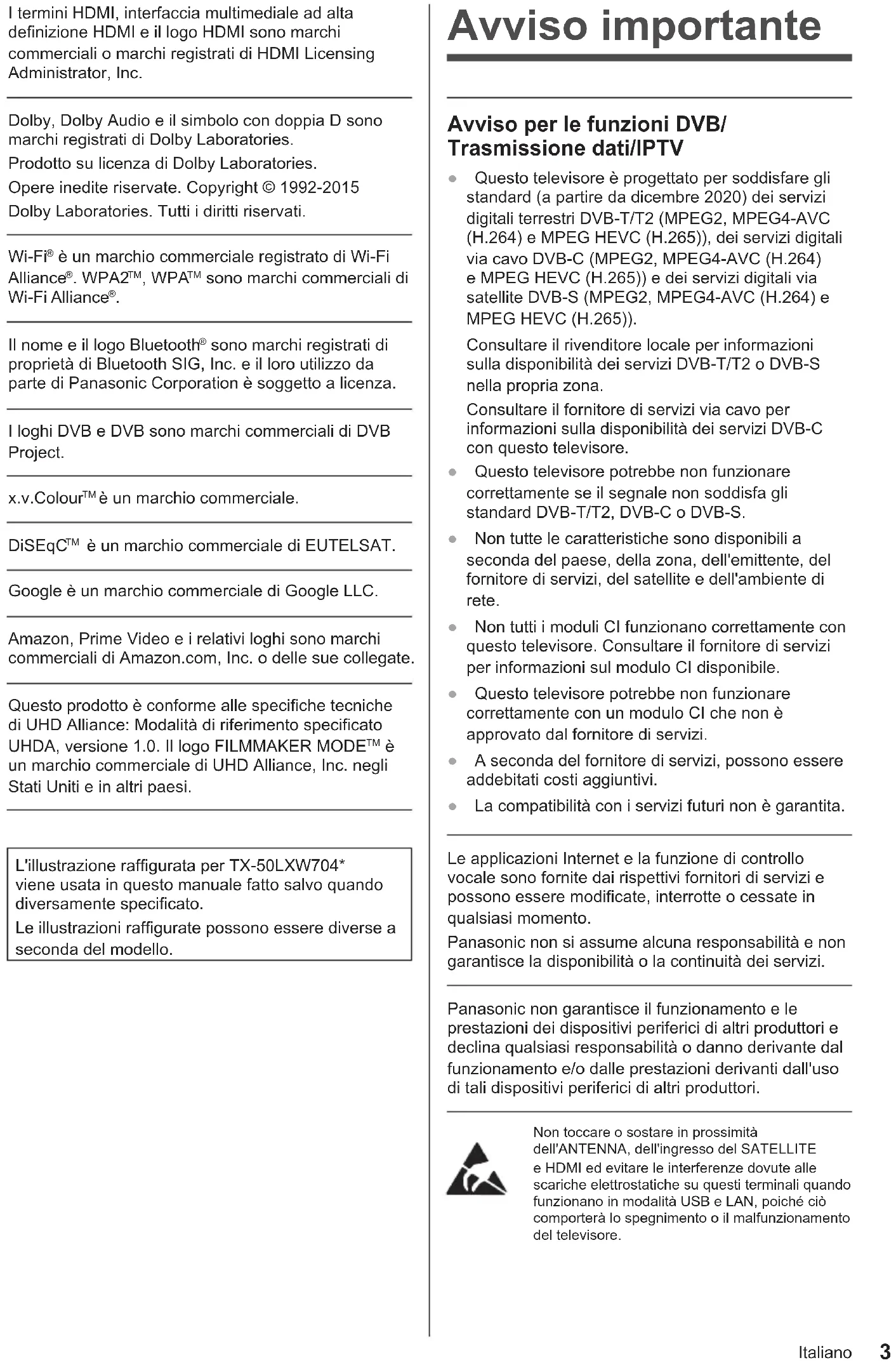 un marchio commerciale di UHD Alliance, Inc. negli Stati Uniti e in altri paesi. L'illustrazione raffigurata per TX-50LXW704* viene usata in questo manuale fatto salvo quando diversamente specificato. Le illustrazioni raffigurate possono essere diverse a seconda del modello. Avviso importante Avviso per le funzioni DVB/ Trasmissione dati/IPTV ● Questo televisore è progettato per soddisfare gli standard (a partire da dicembre 2020) dei servizi digitali terrestri DVB-T/T2 (MPEG2, MPEG4-AVC (H.264) e MPEG HEVC (H.265)), dei servizi digitali via cavo DVB-C (MPEG2, MPEG4-AVC (H.264) e MPEG HEVC (H.265)) e dei servizi digitali via satellite DVB-S (MPEG2, MPEG4-AVC (H.264) e MPEG HEVC (H.265)). Consultare il rivenditore locale per informazioni sulla disponibilità dei servizi DVB-T/T2 o DVB-S nella propria zona. Consultare il fornitore di servizi via cavo per informazioni sulla disponibilità dei servizi DVB-C con questo televisore. ● Questo televisore potrebbe non funzionare correttamente se il segnale non soddisfa gli standard DVB-T/T2, DVB-C o DVB-S. ● Non tutte le caratteristiche sono disponibili a seconda del paese, della zona, dell'emittente, del fornitore di servizi, del satellite e dell'ambiente di rete. ● Non tutti i moduli CI funzionano correttamente con questo televisore. Consultare il fornitore di servizi per informazioni sul modulo CI disponibile. ● Questo televisore potrebbe non funzionare correttamente con un modulo CI che non è approvato dal fornitore di servizi. ● A seconda del fornitore di servizi, possono essere addebitati costi aggiuntivi. ● La compatibilità con i servizi futuri non è garantita. Le applicazioni Internet e la funzione di controllo vocale sono fornite dai rispettivi fornitori di servizi e possono essere modificate, interrotte o cessate in qualsiasi momento. Panasonic non si assume alcuna responsabilità e non garantisce la disponibilità o la continuità dei servizi. Panasonic non garantisce il funzionamento e le prestazioni dei dispositivi periferici di altri produttori e declina qualsiasi responsabilità o danno derivante dal funzionamento e/o dalle prestazioni derivanti dall'uso di tali dispositivi periferici di altri produttori. Non toccare o sostare in prossimità dell'ANTENNA, dell'ingresso del SATELLITE e HDMI ed evitare le interferenze dovute alle scariche elettrostatiche su questi terminali quando funzionano in modalità USB e LAN, poiché ciò comporterà lo spegnimento o il malfunzionamento del televisore.Italiano