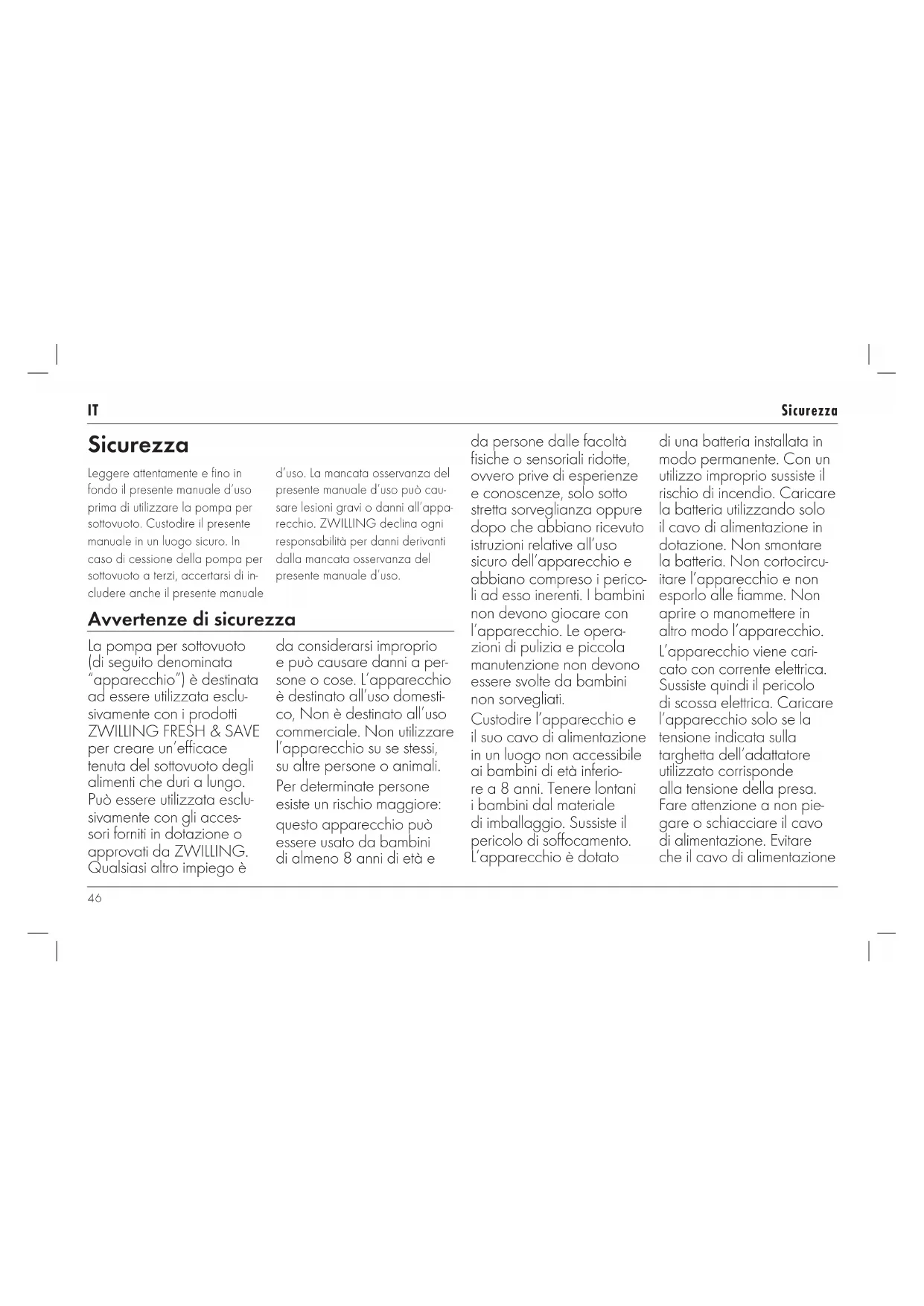 Sicurezza Leggere attentamente e fino in fondo il presente manuale d’uso prima di utilizzare la pompa per sottovuoto. Custodire il presente manuale in un luogo sicuro. In caso di cessione della pompa per sottovuoto a terzi, accertarsi di in- cludere anche il presente manuale d’uso. La mancata osservanza del presente manuale d’uso può cau- sare lesioni gravi o danni all’appa- recchio. ZWILLING declina ogni responsabilità per danni derivanti dalla mancata osservanza del presente manuale d’uso. Avvertenze di sicurezza La pompa per sottovuoto (di seguito denominata “apparecchio”) è destinata ad essere utilizzata esclu- sivamente con i prodotti