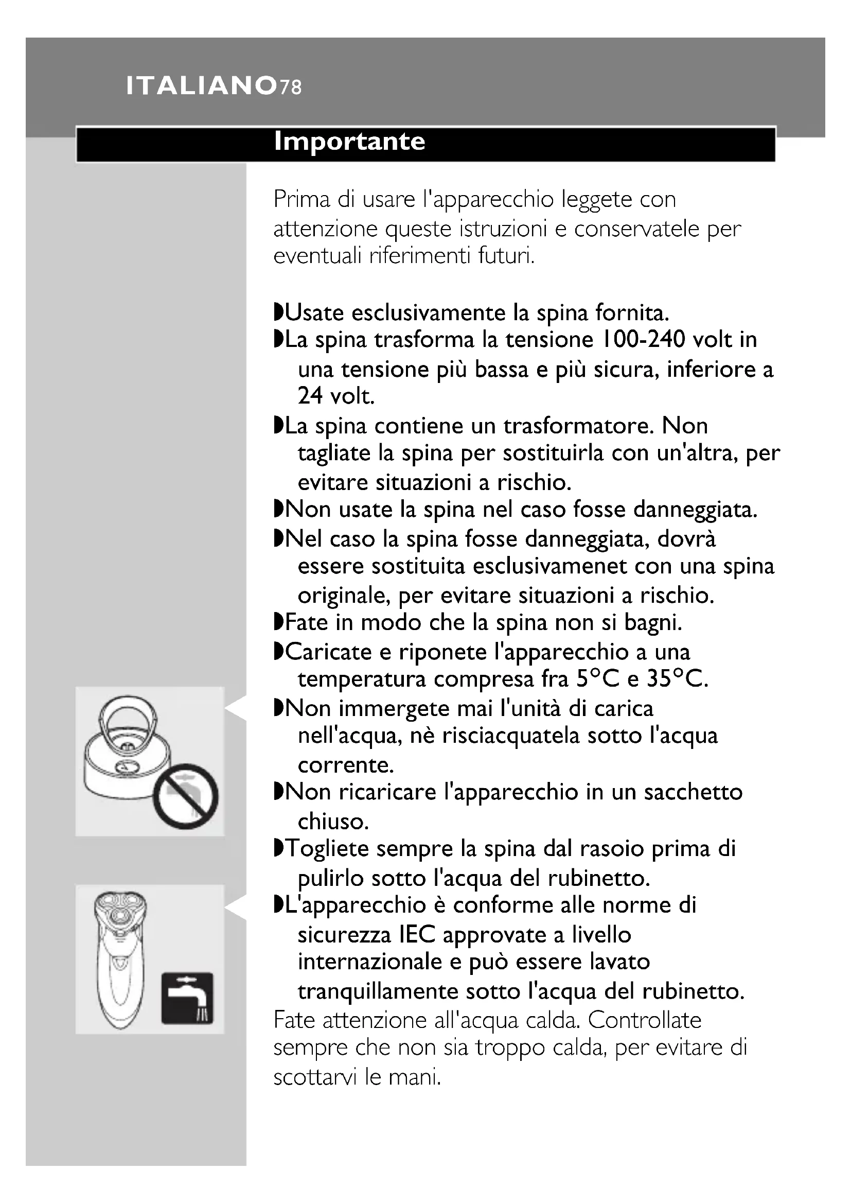 Causa: la unidad afeitadora no se ha colocado correctamente. ◗ Si la unidad afeitadora se suelta de la afeitadora, puede volver a encajarla fácilmente (oirá un clic). ESPAÑOL 77Importante Prima di usare l'apparecchio leggete con attenzione queste istruzioni e conservatele per eventuali riferimenti futuri. ◗ Usate esclusivamente la spina fornita. ◗ La spina trasforma la tensione 100-240 volt in una tensione più bassa e più sicura, inferiore a 24 volt. ◗ La spina contiene un trasformatore. Non tagliate la spina per sostituirla con un'altra, per evitare situazioni a rischio. ◗ Non usate la spina nel caso fosse danneggiata. ◗ Nel caso la spina fosse danneggiata, dovrà essere sostituita esclusivamenet con una spina originale, per evitare situazioni a rischio. ◗ Fate in modo che la spina non si bagni. ◗ Caricate e riponete l'apparecchio a una temperatura compresa fra 5cC e 35cC.