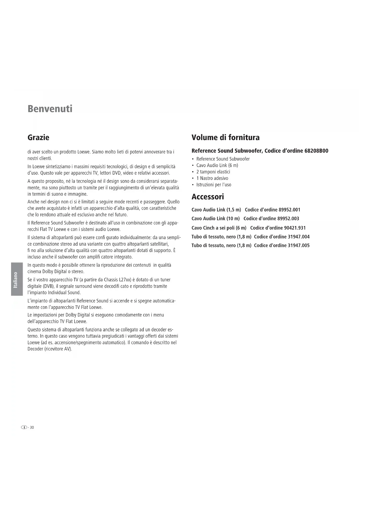 - Istruzioni per l‘uso Accessori Cavo Audio Link (1,5 m) Codice d’ordine 89952.001 Cavo Audio Link (10 m) Codice d’ordine 89952.003 Cavo Cinch a sei poli (6 m) Codice d’ordine 90421.931 Tubo di tessuto, nero (1,8 m) Codice d’ordine 31947.004 Tubo di tessuto, nero (1,8 m) Codice d’ordine 31947.00531 - Italiano Smaltimento Imballo e scatola Avete scelto un prodotto tecnicamente superiore e duraturo. Per lo smaltimento dell‘imballaggio abbiamo devoluto un sussidio all‘azienda che ritira l‘imballaggio dal rivenditore, in conformità alle disposizioni nazionali. Tuttavia, consigliamo di conservare bene il cartone originale e il materiale d‘imballaggio, di modo che l‘apparecchio possa essere trasportato con una protezione ottimale in caso di necessità. L‘apparecchio INFORMAZIONE AGLI UTENTI: ai sensi dell’art. 13 del Decreto Legislativo 25 luglio 2005, n. 151 “Attuazione delle Direttive 2002/95/CE, 2002/96/CE e 2003/108/CE, relative alla riduzione dell‘uso di sostanze pericolose nelle apparecchiature elettriche ed elettroniche, nonché allo smaltimento dei rifiuti” il simbolo del cassonetto barrato riportato sull’apparecchiatura o sulla sua confezione indica che il prodotto alla fine della propria vita utile deve essere raccolto separatamente dagli altri rifiuti. L’utente dovrà, pertanto, conferire l’apparecchiatura giunta a fine vita agli idonei centri di raccolta differenziata dei rifiuti elettronici ed elettrotecnici, oppure riconsegnarla al rivenditore al momento dell’acquisto di una nuova apparecchiatura di tipo equivalente, in ragione di uno a uno. L’adeguata raccolta differenziata per l’avvio successivo dell’apparecchiatura dismessa al riciclaggio, al trattamento e allo smaltimento ambientalmente compatibile contribuisce ad evitare possibili effetti negativi sull’ambiente e sulla salute e favorisce il reimpiego e/o riciclo dei materiali di cui è composta l’apparecchiatura. Lo smaltimento abusivo del prodotto da parte dell’utente comporta l’applicazione delle sanzioni amministrative previste dalla normativa vigente. Pulizia Pulire il sistema di altoparlanti Reference utilizzando unicamente un panno umido, morbido e pulito (senza detergenti aggressivi). Per la vostra sicurezza Per la vostra sicurezza e per evitare inutili danni all‘apparecchio, leggere e rispettare le seguenti norme di sicurezza.