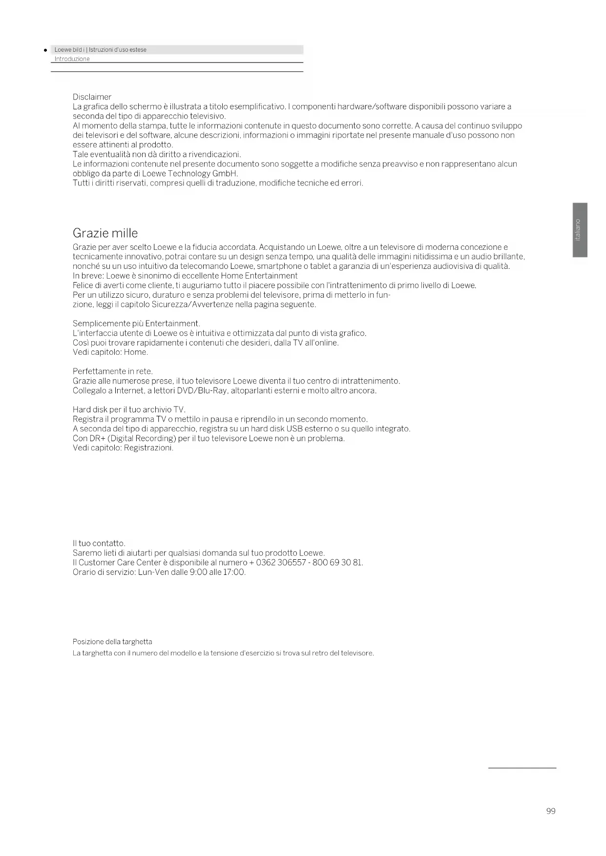 Loewe bild i | Istruzioni d'uso estese italiano Disclaimer La grafica dello schermo è illustrata a titolo esemplificativo. I componenti hardware/software disponibili possono variare a seconda del tipo di apparecchio televisivo. Al momento della stampa, tutte le informazioni contenute in questo documento sono corrette. A causa del continuo sviluppo dei televisori e del software, alcune descrizioni, informazioni o immagini riportate nel presente manuale d'uso possono non essere attinenti al prodotto. Tale eventualità non dà diritto a rivendicazioni. Le informazioni contenute nel presente documento sono soggette a modifiche senza preavviso e non rappresentano alcun obbligo da parte di Loewe Technology GmbH. Tutti i diritti riservati, compresi quelli di traduzione, modifiche tecniche ed errori. Grazie mille Grazie per aver scelto Loewe e la fiducia accordata. Acquistando un Loewe, oltre a un televisore di moderna concezione e tecnicamente innovativo, potrai contare su un design senza tempo, una qualità delle immagini nitidissima e un audio brillante, nonché su un uso intuitivo da telecomando Loewe, smartphone o tablet a garanzia di un'esperienza audiovisiva di qualità. In breve: Loewe è sinonimo di eccellente Home Entertainment Felice di averti come cliente, ti auguriamo tutto il piacere possibile con l'intrattenimento di primo livello di Loewe. Per un utilizzo sicuro, duraturo e senza problemi del televisore, prima di metterlo in fun- zione, leggi il capitolo Sicurezza/Avvertenze nella pagina seguente. Semplicemente più Entertainment. L'interfaccia utente di Loewe os è intuitiva e ottimizzata dal punto di vista grafico. Così puoi trovare rapidamente i contenuti che desideri, dalla TV all'online. Vedi capitolo: Home. Perfettamente in rete. Grazie alle numerose prese, il tuo televisore Loewe diventa il tuo centro di intrattenimento. Collegalo a Internet, a lettori DVD/Blu-Ray, altoparlanti esterni e molto altro ancora. Hard disk per il tuo archivio TV. Registra il programma TV o mettilo in pausa e riprendilo in un secondo momento. A seconda del tipo di apparecchio, registra su un hard disk USB esterno o su quello integrato. Con DR+ (Digital Recording) per il tuo televisore Loewe non è un problema. Vedi capitolo: Registrazioni. Il tuo contatto. Saremo lieti di aiutarti per qualsiasi domanda sul tuo prodotto Loewe. Il Customer Care Center è disponibile al numero + 0362 306557 - 800 69 30 81. Orario di servizio: Lun-Ven dalle 9:00 alle 17:00. Posizione della targhetta La targhetta con il numero del modello e la tensione d'esercizio si trova sul retro del televisore. Introduzione100