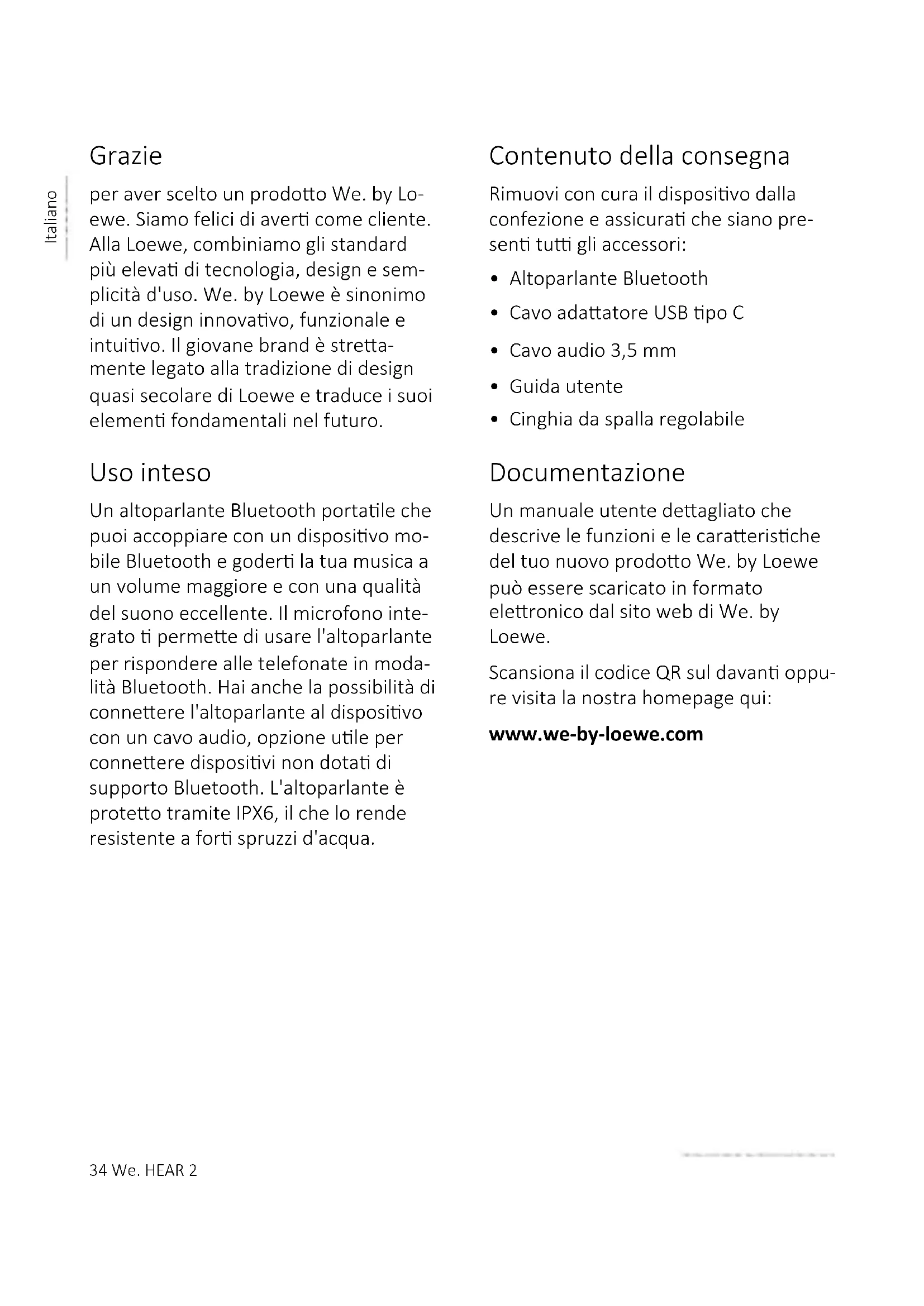 luce della spia si spegnerà. 9 Protezione dall'acqua IPX6 Questo disposivo è dotato di prote- zione IPX6, che signica che eventuali spruzzi d'acqua for non avranno ee dannosi su di esso. Perché questa protezione sia ecace, non devono essere connessi disposivi esterni all'altoparlante tramite cavi (ad esempio, telefoni tramite cavo audio o caricabaerie tramite cavo USB) e lo scomparmento dei conneori deve essere chiuso in maniera salda.40 We. HEAR 2 Italiano Risoluzione dei problemi In caso di un malfunzionamento del disposivo, consigliamo di controllare l'elenco di seguito prima di chiamare il servizio di assistenza. Problema Causa possibile Soluzione/note Non riesco ad accendere l'altoparlante. Il livello della baeria potrebbe essere molto basso. Ricarica l'altoparlante. L'altoparlante ci mee troppo tempo a ricaricarsi. Il tuo caricabaerie USB forni- sce una corrente troppo bassa. Usa un caricabaerie USB da 5V/2A. Non c'è suono dall'altoparlante. a. Il livello del volume è impo- stato troppo basso oppure è stato disavato. b. Non c'è nessun disposivo accoppiato con l'alto- parlante. a. Premi il pulsante volume (+) diverse volte o aumenta il volume nel tuo disposivo. b. Accoppa e conne il tuo disposivo Bluetooth. Il suono è distorto. a. Il tuo disposivo Bluetooth è troppo distante dall'alto- parlante. b. C'è un'interferenza wireless. a. Avvicina il disposivo all'altoparlante. b. Allontana l'altoparlante da altri disposivi wireless. Da tecnici Tipo di dispositivo We. by Loewe: We. HEAR 2 Numero parte: 60702x10 Tipo di batteria: Batteria integrata agli ioni di litio 7,4V/4000mAh Corrente per la ricarica: 5V/2A Tempo di riproduzione 15 – 17 ore Tempo di ricarica 4-5 ore Unità altoparlante 2x 15 W RMS Protezione contro l'acqua IPX6 Versione Bluetooth V5.0 Intervallo potenza/frequenza Bluetooth: Potenza massima <10 mW a 2402 - 2480 MHz Protocolli Bluetooth: A2DP, AVRCP Dimensioni dispositivo (L x A x P) 118 x 290 x 112 mm Peso dispositivo: 2 kg Temperatura ambientale 0° C – 40° C Umidità relativa (non condensata): 20 – 70%We. HEAR 2 41 Italiano42 We. HEAR 2 español Gracias por elegir un producto We. by Loewe. Nos alegra tenerle como cliente. En Loewe combinamos los estándares más altos de tecnología, diseño y sencillez de uso. We. by Loewe es sinónimo de diseño innovador, funcional e intuivo de productos. Esta joven marca está es- trechamente ligada a los casi 100 años de tradición de diseño de Loewe y traduce sus elementos fundamentales en el futuro. Uso previsto Un altavoz Bluetooth portál que puede emparejar con un disposivo móvil Bluetooth y disfrutar de música a un volumen más alto y con la exce- lente calidad de sonido. El micrófono integrado le permite ulizar el altavoz para responder llamadas de teléfono en modo Bluetooth. También puede conectar el altavoz al aparato con un ca- ble de audio, para conectar disposivos sin compabilidad Bluetooth. El altavoz ene protección de categoría IPX6, lo que le convierte en resistente a los chorros de agua. Paquete de entrega Desembale con cuidado el aparato y asegúrese de que se incluyen todos los accesorios: