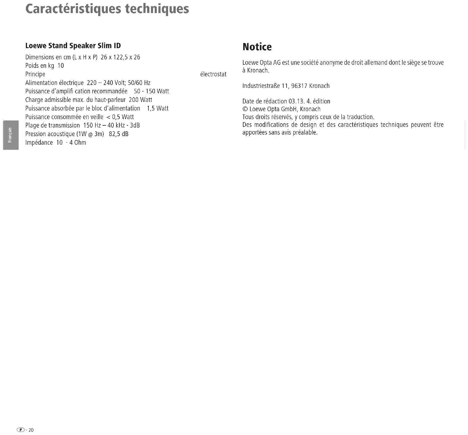 Subw Right Rear FrontOFF ON Auto Manu.Front Rear Loewe Stand Speaker Slim ID Fiche secteurFiche secteur Avant gauche Avant droit Rear gauche Rear droit Fiche secteur Câble du haut- parleur- 20 Français Caractéristiques techniques Loewe Stand Speaker Slim ID Dimensions en cm (L x H x P) 26 x 122,5 x 26 Poids en kg 10 Principe électrostat Alimentation électrique 220 – 240 Volt; 50/60 Hz Puissance d’amplifi cation recommandée 50 - 150 Watt Charge admissible max. du haut-parleur 200 Watt Puissance absorbée par le bloc d‘alimentation 1,5 Watt Puissance consommée en veille < 0,5 Watt Plage de transmission 150 Hz – 40 kHz - 3dB Pression acoustique (1W @ 3m) 82,5 dB Impédance 10 - 4 Ohm Notice Loewe Opta AG est une société anonyme de droit allemand dont le siège se trouve à Kronach. Industriestraße 11, 96317 Kronach Date de rédaction 03.13. 4. édition © Loewe Opta GmbH, Kronach Tous droits réservés, y compris ceux de la traduction. Des modifications de design et des caractéristiques techniques peuvent être apportées sans avis préalable.21 - Italiano Benvenuti Grazie di aver scelto un prodotto Loewe. Siamo molto lieti di potervi annoverare tra i nostri clienti. In Loewe sintetizziamo i massimi requisiti tecnologici, di design e di semplicità d‘uso. Questo vale per apparecchi TV, lettori DVD, video e relativi accessori. A questo proposito, né la tecnologia né il design sono da considerarsi separata- mente, ma sono piuttosto un tramite per il raggiungimento di un‘elevata qualità in termini di suono e immagine. Anche nel design non ci si è limitati a seguire mode recenti e passeggere. Quello che avete acquistato è infatti un apparecchio d’alta qualità, con caratteristiche che lo rendono attuale ed esclusivo anche nel futuro. Il Loewe Stand Speaker Slim ID è destinato all‘uso in combinazione con gli apparecchi Flat TV Loewe e con i sistemi audio Loewe. È possibile comporre il sistema audio in modo personalizzato, da una semplice combinazione stereo fi no alle più esclusive soluzioni Surround Sound, dotate di quattro Loewe Stand Speaker Slim ID e Subwoofer Highline Loewe. Il Loewe Stand Speaker Slim ID offre un‘elevata qualità del suono e la massima accuratezza della riproduzione musicale, che viene assicurata da una speciale tecnologia a membrana con pellicole ultraleggere. Volume di fornitura Loewe Stand Speaker Slim ID, Codice d’ordine 69204B10, 69204L10, 69204U10.