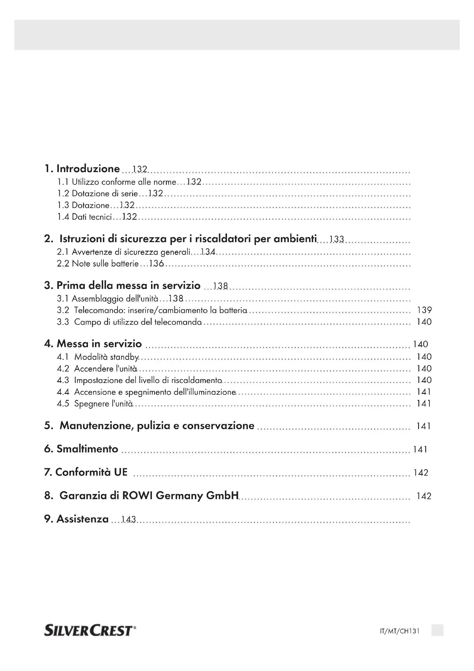 Leggere tutte le avvertenze e le istruzioni di sicurezza. Il mancato rispetto delle avvertenze e delle istruzioni di sicu- rezza comporta il rischio di lesioni e/o di danni gravi. Conservare tutte le avvertenze e le istruzioni di sicurezza per il futuro! ATTENZIONE! Non coprire! Non coprire l’apparecchio di riscaldamento per evitare il surriscaldamento. Il riscaldatore deve essere installato ad almeno 1,8 m dal pavimento. Il riscaldatore non deve essere collocato direttamente sotto o sop- ra una presa di corrente. Non utilizzare questo riscaldatore con un interruttore di programma, un timer, un sistema di controllo remoto separato o qualsiasi altro dispositivo che accende automaticamente il riscaldatore, poiché esiste il rischio di incendio se il riscaldatore è coperto o posizionato in modo errato. Questo riscaldatore non deve essere usato se l'elemento riscaldante è danneggiato. La griglia di protezione di questo riscaldatore è progettata per impedire l'accesso diretto agli elementi di riscaldamento e deve essere in posizione quando il riscaldatore è in uso. La griglia di protezione non fornisce una protezione sufficiente per i bambini piccoli e le persone inferme. Non utilizzare mai l’apparecchio di riscaldamento nelle immediate vicinanze di una vasca da bagno, una doccia o una piscina. Non mettere in funzione un apparecchio caduto a terra.IT/MT/CH134 Non utilizzare il prodotto se si notano danni visibili. Il riscaldatore deve essere montato su una superficie solida e piana sul soffitto. Se il cavo di alimentazione di questo apparecchio è danneggiato, deve essere sostituito dal fabbricante o dal suo servizio post-vendita o da una persona altrettanto qualificata per evitare rischi. Non è necessario alcun intervento da parte dell'utente per impostare il prodotto a 220 o 240 V. Il prodotto si regola automaticamente sulla tensione corretta. ATTENZIONE! Il riscaldatore non deve essere utilizzato se nelle sue vicinanze ci sono persone che non possono lasciare il luogo in modo indipendente, a meno che non sia garantita una costante supervisione. ATTENZIONE! Pericolo di incendio! Per ridurre il rischio di incen- dio, tenere tessuti, tende e altri materiali combustibili ad almeno 1 m di distanza dall'apparecchio.
