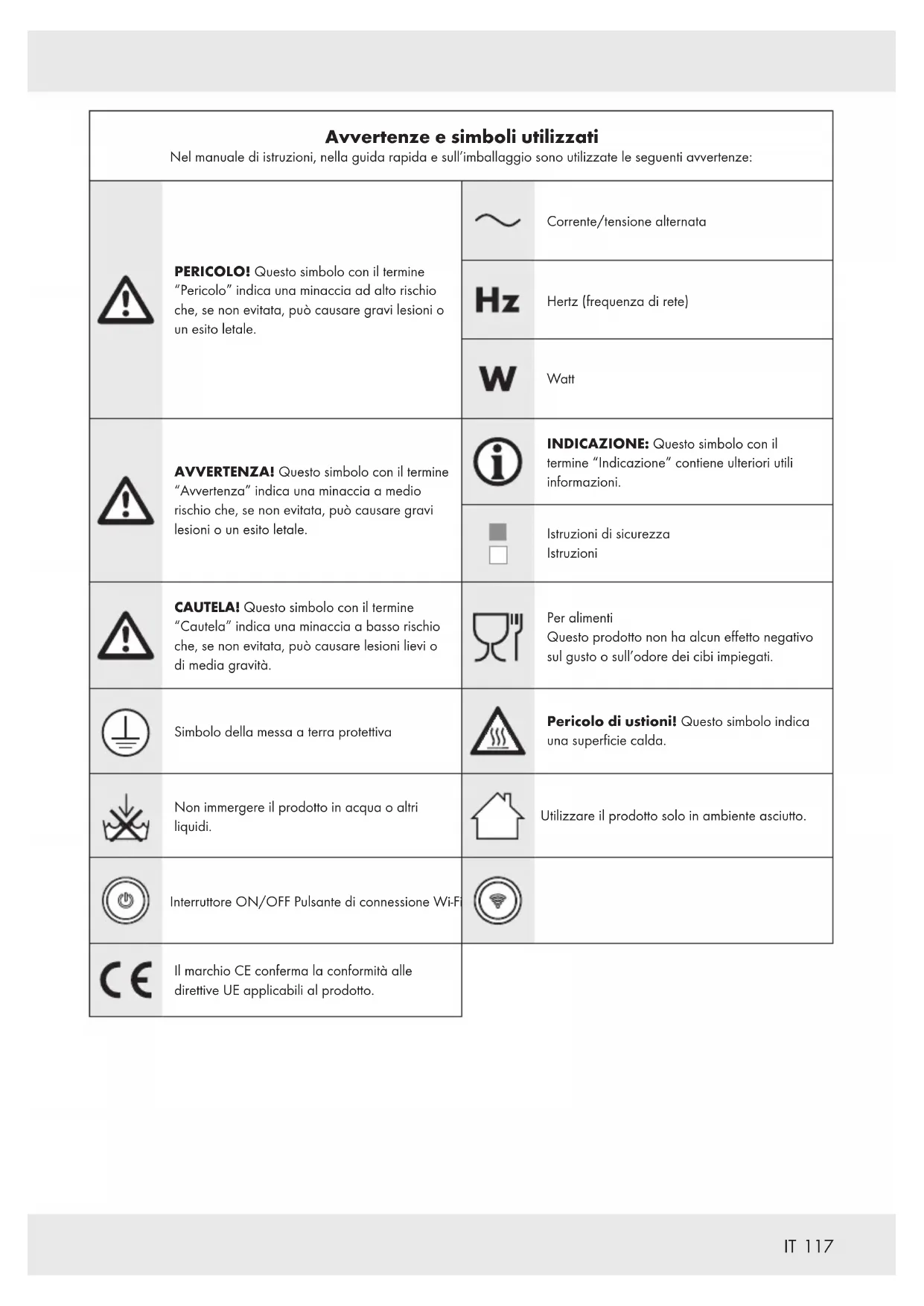 Avvertenze e simboli utilizzati Nel manuale di istruzioni, nella guida rapida e sull’imballaggio sono utilizzate le seguenti avvertenze: PERICOLO! Questo simbolo con il termine “Pericolo” indica una minaccia ad alto rischio che, se non evitata, può causare gravi lesioni o un esito letale. Corrente/tensione alternata Hertz (frequenza di rete) Watt AVVERTENZA! Questo simbolo con il termine “Avvertenza” indica una minaccia a medio rischio che, se non evitata, può causare gravi lesioni o un esito letale. INDICAZIONE: Questo simbolo con il termine “Indicazione” contiene ulteriori utili informazioni. Istruzioni di sicurezza Istruzioni CAUTELA! Questo simbolo con il termine “Cautela” indica una minaccia a basso rischio che, se non evitata, può causare lesioni lievi o di media gravità. Per alimenti Questo prodotto non ha alcun effetto negativo sul gusto o sull’odore dei cibi impiegati. Simbolo della messa a terra protettiva Pericolo di ustioni! Questo simbolo indica una superficie calda. Non immergere il prodotto in acqua o altri liquidi. Utilizzare il prodotto solo in ambiente asciutto. Interruttore ON/OFF Pulsante di connessione Wi-Fi Il marchio CE conferma la conformità alle direttive UE applicabili al prodotto.118