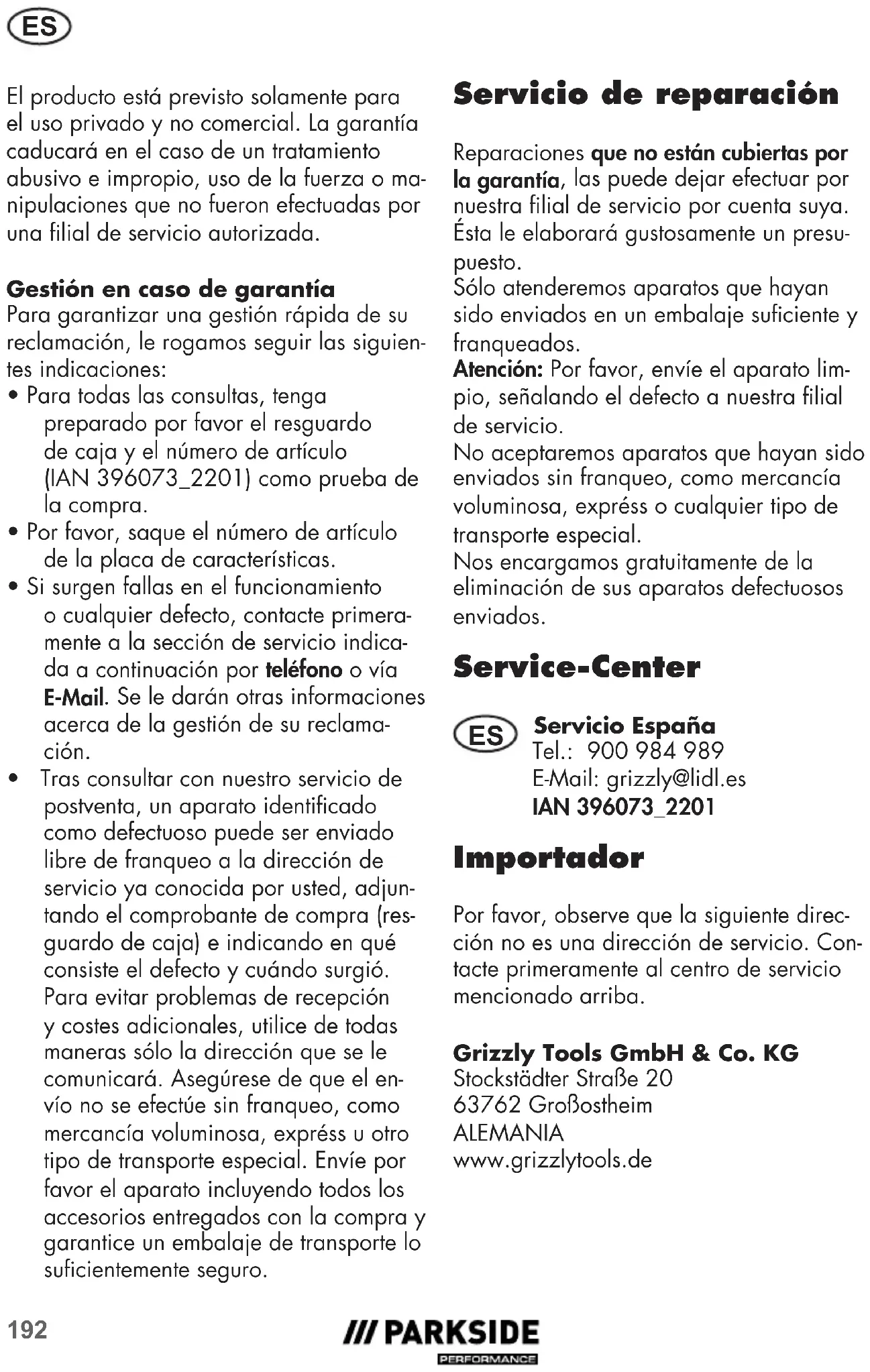 Assistenza Malta Tel.:80062230 E-Mail:grizzly@lidl.com.mt IAN 396073_2201 Importatore Non dimenticare che il seguente indirizzo nonèunindirizzodiassistenzatecnica. Contattareprimadituttoilcentrodiassi- stenza tecnica sopra nominato. Grizzly Tools GmbH & Co. KG StockstädterStraße20 63762 Großostheim GERMANIA www.grizzlytools.deHU