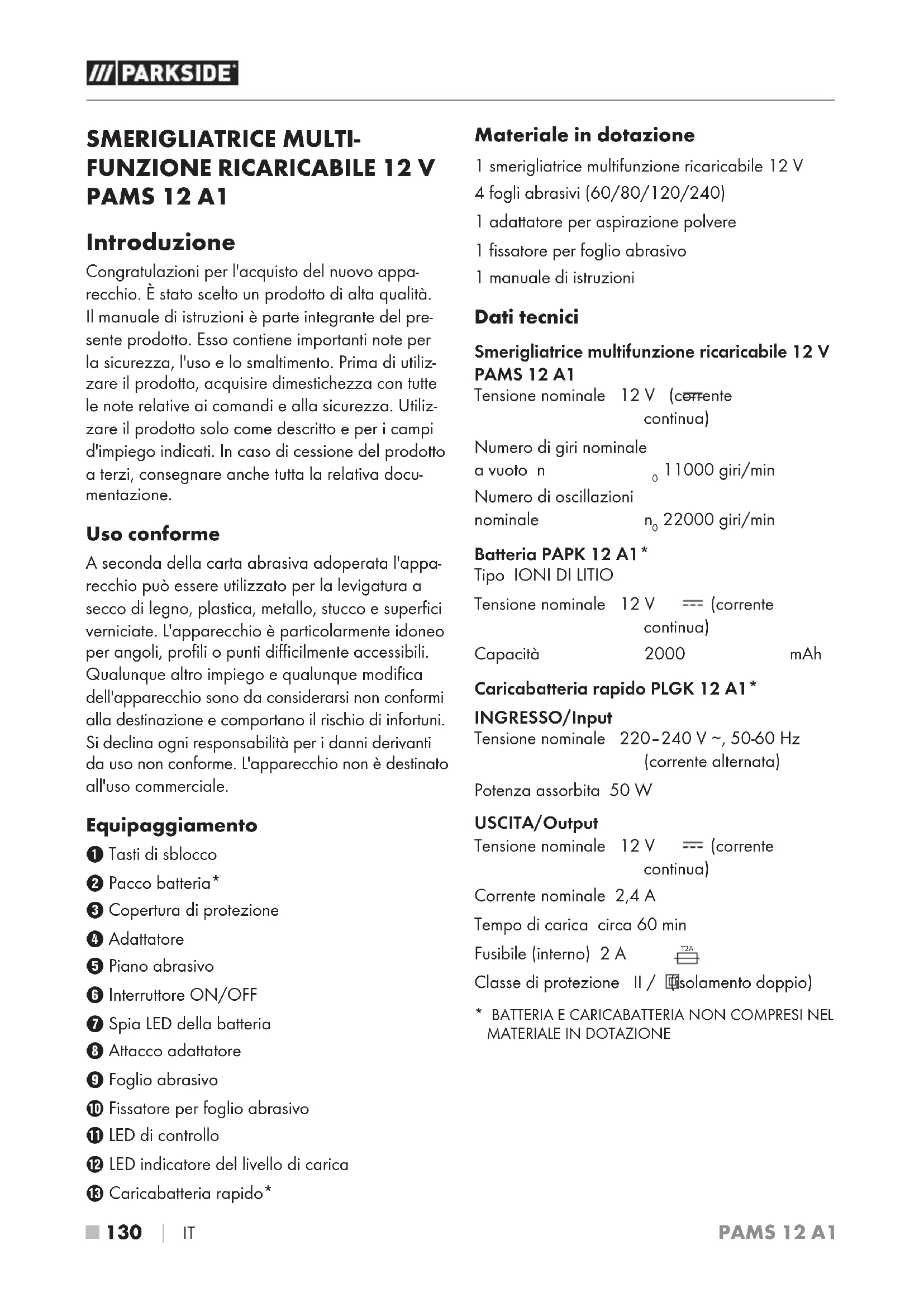 PAMS 12 A1 Introduzione Congratulazioni per l'acquisto del nuovo appa- recchio. È stato scelto un prodotto di alta qualità. Il manuale di istruzioni è parte integrante del pre- sente prodotto. Esso contiene importanti note per la sicurezza, l'uso e lo smaltimento. Prima di utiliz- zare il prodotto, acquisire dimestichezza con tutte le note relative ai comandi e alla sicurezza. Utiliz- zare il prodotto solo come descritto e per i campi d'impiego indicati. In caso di cessione del prodotto a terzi, consegnare anche tutta la relativa docu- mentazione. Uso conforme A seconda della carta abrasiva adoperata l'appa- recchio può essere utilizzato per la levigatura a secco di legno, plastica, metallo, stucco e superfici verniciate. L'apparecchio è particolarmente idoneo per angoli, profili o punti difficilmente accessibili. Qualunque altro impiego e qualunque modifica dell'apparecchio sono da considerarsi non conformi alla destinazione e comportano il rischio di infortuni. Si declina ogni responsabilità per i danni derivanti da uso non conforme. L'apparecchio non è destinato all'uso commerciale. Equipaggiamento 1 Tasti di sblocco 2 Pacco batteria* 3 Copertura di protezione 4 Adattatore 5 Piano abrasivo 6 Interruttore ON/OFF 7 Spia LED della batteria 8 Attacco adattatore 9 Foglio abrasivo 0 Fissatore per foglio abrasivo q LED di controllo w LED indicatore del livello di carica e Caricabatteria rapido* Materiale in dotazione 1 smerigliatrice multifunzione ricaricabile 12 V 4 fogli abrasivi (60/80/120/240) 1 adattatore per aspirazione polvere 1 fissatore per foglio abrasivo 1 manuale di istruzioni Dati tecnici Smerigliatrice multifunzione ricaricabile 12 V PAMS 12 A1 Tensione nominale 12 V (corrente continua) Numero di giri nominale a vuoto n