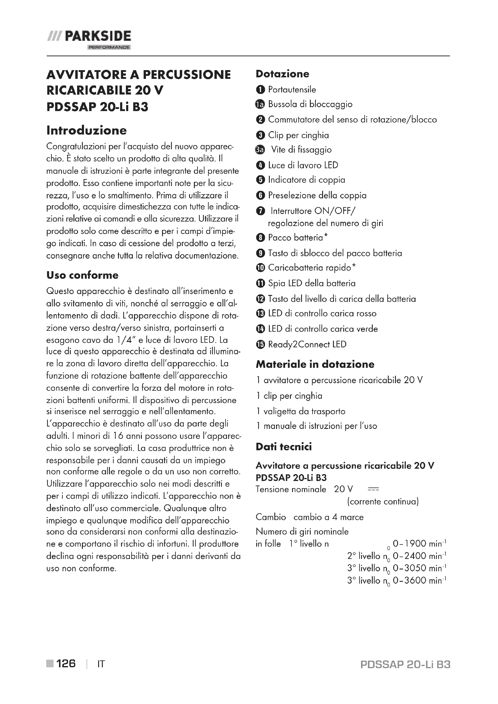 RICARICABILE 20 V PDSSAP 20-Li B3 Introduzione Congratulazioni per l’acquisto del nuovo apparec- chio. È stato scelto un prodotto di alta qualità. Il manuale di istruzioni è parte integrante del presente prodotto. Esso contiene importanti note per la sicu- rezza, l’uso e lo smaltimento. Prima di utilizzare il prodotto, acquisire dimestichezza con tutte le indica- zioni relative ai comandi e alla sicurezza. Utilizzare il prodotto solo come descritto e per i campi d’impie- go indicati. In caso di cessione del prodotto a terzi, consegnare anche tutta la relativa documentazione. Uso conforme Questo apparecchio è destinato all’inserimento e allo svitamento di viti, nonché al serraggio e all’al- lentamento di dadi. L’apparecchio dispone di rota- zione verso destra/verso sinistra, portainserti a esagono cavo da 1/4” e luce di lavoro LED. La luce di questo apparecchio è destinata ad illumina- re la zona di lavoro diretta dell’apparecchio. La funzione di rotazione battente dell’apparecchio consente di convertire la forza del motore in rota- zioni battenti uniformi. Il dispositivo di percussione si inserisce nel serraggio e nell’allentamento. L’apparecchio è destinato all’uso da parte degli adulti. I minori di 16 anni possono usare l’apparec- chio solo se sorvegliati. La casa produttrice non è responsabile per i danni causati da un impiego non conforme alle regole o da un uso non corretto. Utilizzare l’apparecchio solo nei modi descritti e per i campi di utilizzo indicati. L’apparecchio non è destinato all’uso commerciale. Qualunque altro impiego e qualunque modifica dell’apparecchio sono da considerarsi non conformi alla destinazio- ne e comportano il rischio di infortuni. Il produttore declina ogni responsabilità per i danni derivanti da uso non conforme. Dotazione 1 Portautensile