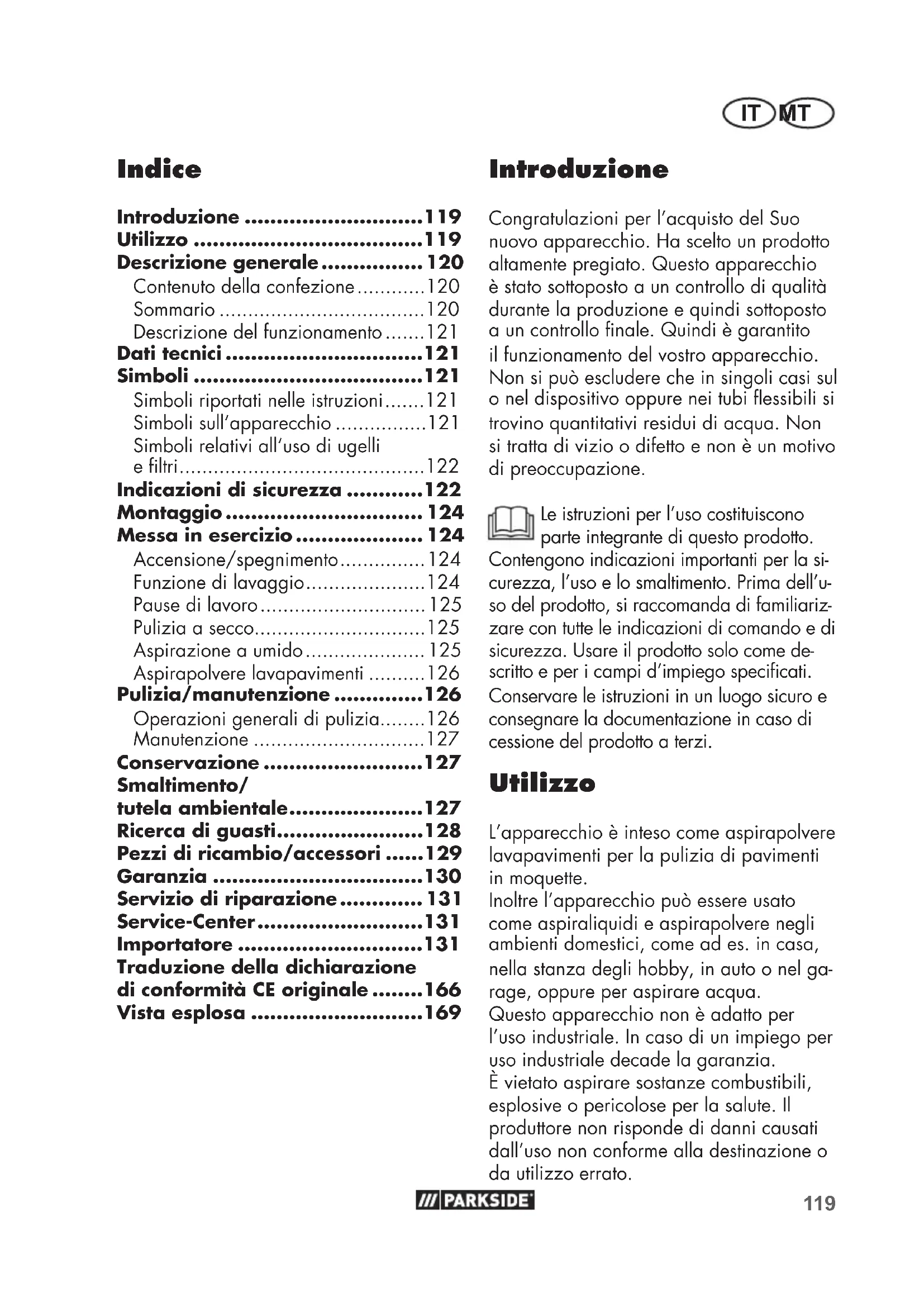 - Introduzione Congratulazioni per l’acquisto del Suo nuovo apparecchio. Ha scelto un prodotto altamente pregiato. Questo apparecchio è stato sottoposto a un controllo di qualità durante la produzione e quindi sottoposto a un controllo nale. Quindi è garantito il funzionamento del vostro apparecchio. Non si può escludere che in singoli casi sul o nel dispositivo oppure nei tubi essibili si trovino quantitativi residui di acqua. Non si tratta di vizio o difetto e non è un motivo di preoccupazione. Le istruzioni per l’uso costituiscono parte integrante di questo prodotto. Contengono indicazioni importanti per la si- curezza, l’uso e lo smaltimento. Prima dell’u- so del prodotto, si raccomanda di familiariz- zare con tutte le indicazioni di comando e di sicurezza. Usare il prodotto solo come de- scritto e per i campi d’impiego specicati. Conservare le istruzioni in un luogo sicuro e consegnare la documentazione in caso di cessione del prodotto a terzi. Utilizzo L’apparecchio è inteso come aspirapolvere lavapavimenti per la pulizia di pavimenti in moquette. Inoltre l’apparecchio può essere usato come aspiraliquidi e aspirapolvere negli ambienti domestici, come ad es.in casa, nella stanza degli hobby, in auto o nel ga- rage, oppure per aspirare acqua. Questo apparecchio non è adatto per l’uso industriale. In caso di un impiego per uso industriale decade la garanzia. È vietato aspirare sostanze combustibili, esplosive o pericolose per la salute. Il produttore non risponde di danni causati dall’uso non conforme alla destinazione o da utilizzo errato. Traduzione della dichiarazione di conformità CE originale p. 166