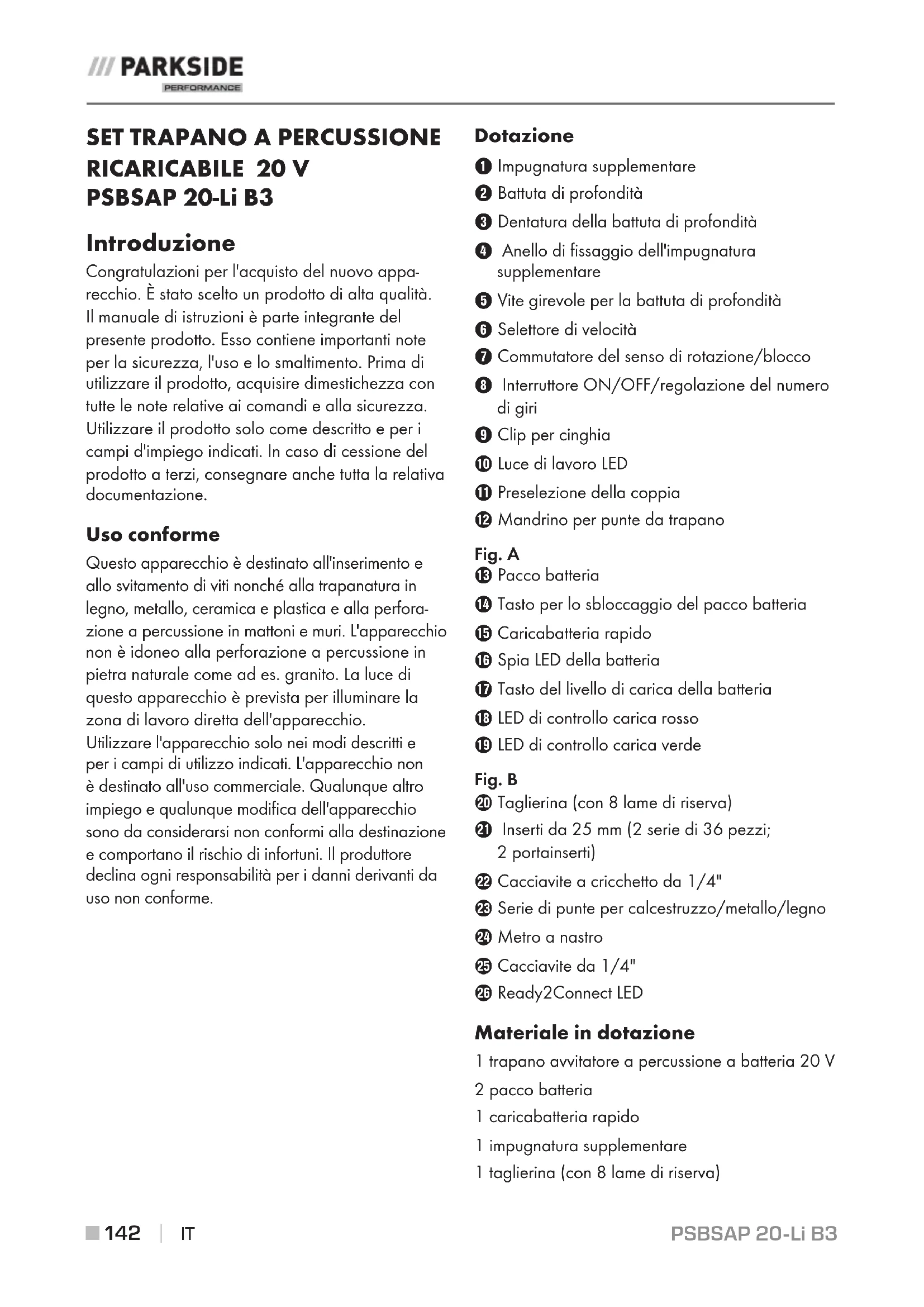 RICARICABILE 20 V PSBSAP 20-Li B3 Introduzione Congratulazioni per l'acquisto del nuovo appa- recchio. È stato scelto un prodotto di alta qualità. Il manuale di istruzioni è parte integrante del presente prodotto. Esso contiene importanti note per la sicurezza, l'uso e lo smaltimento. Prima di utilizzare il prodotto, acquisire dimestichezza con tutte le note relative ai comandi e alla sicurezza. Utilizzare il prodotto solo come descritto e per i campi d'impiego indicati. In caso di cessione del prodotto a terzi, consegnare anche tutta la relativa documentazione. Uso conforme Questo apparecchio è destinato all'inserimento e allo svitamento di viti nonché alla trapanatura in legno, metallo, ceramica e plastica e alla perfora- zione a percussione in mattoni e muri. L'apparecchio non è idoneo alla perforazione a percussione in pietra naturale come ad es. granito. La luce di questo apparecchio è prevista per illuminare la zona di lavoro diretta dell'apparecchio. Utilizzare l'apparecchio solo nei modi descritti e per i campi di utilizzo indicati. L'apparecchio non è destinato all'uso commerciale. Qualunque altro impiego e qualunque modifica dell'apparecchio sono da considerarsi non conformi alla destinazione e comportano il rischio di infortuni. Il produttore declina ogni responsabilità per i danni derivanti da uso non conforme. Dotazione 1 Impugnatura supplementare 2 Battuta di profondità 3 Dentatura della battuta di profondità 4 Anello di fissaggio dell'impugnatura supplementare 5 Vite girevole per la battuta di profondità 6 Selettore di velocità 7 Commutatore del senso di rotazione/blocco 8 Interruttore ON/OFF/regolazione del numero di giri 9 Clip per cinghia 0 Luce di lavoro LED q Preselezione della coppia w Mandrino per punte da trapano Fig. A e Pacco batteria r Tasto per lo sbloccaggio del pacco batteria t Caricabatteria rapido z Spia LED della batteria u Tasto del livello di carica della batteria i LED di controllo carica rosso o LED di controllo carica verde Fig. B p Taglierina (con 8 lame di riserva) a Inserti da 25 mm (2 serie di 36 pezzi; 2 portainserti) s Cacciavite a cricchetto da 1/4" d Serie di punte per calcestruzzo/metallo/legno f Metro a nastro g Cacciavite da 1/4" h Ready2Connect LED Materiale in dotazione 1 trapano avvitatore a percussione a batteria 20 V 2 pacco batteria 1 caricabatteria rapido 1 impugnatura supplementare 1 taglierina (con 8 lame di riserva)PSBSAP 20-Li B3 IT