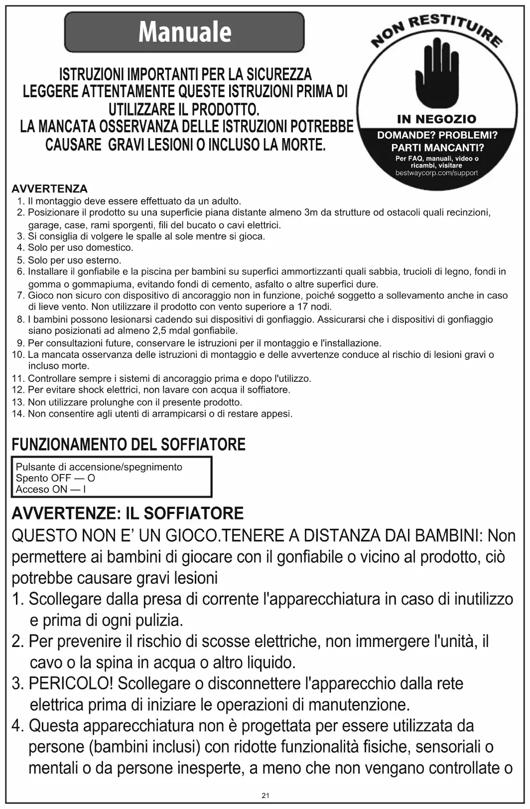 DOMANDE? PROBLEMI?PARTI MANCANTI?Per FAQ, manuali, video oricambi, visitarebestwaycorp.com/support IN NEGOZIO ManualeAVVERTENZE: IL SOFFIATORE QUESTO NON E’ UN GIOCO.TENERE A DISTANZA DAI BAMBINI: Non permettere ai bambini di giocare con il gonfiabile o vicino al prodotto, ciò potrebbe causare gravi lesioni