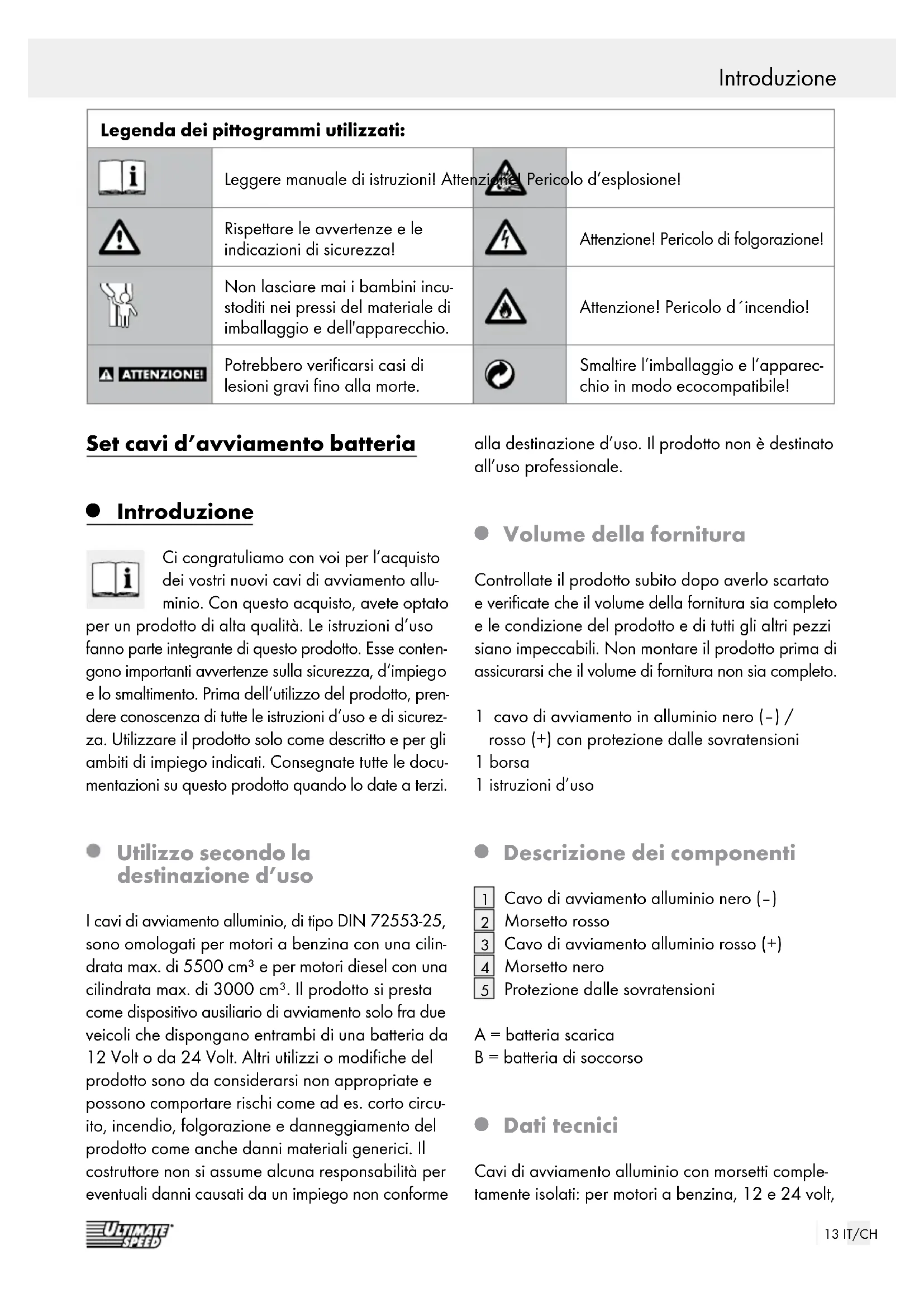 Dati tecnici Cavi di avviamento alluminio con morsetti comple- tamente isolati: per motori a benzina, 12 e 24 volt, Legenda dei pittogrammi utilizzati: Leggere manuale di istruzioni! Attenzione! Pericolo d’esplosione! Rispettare le avvertenze e le indicazioni di sicurezza! Attenzione! Pericolo di folgorazione! Non lasciare mai i bambini incu- stoditi nei pressi del materiale di imballaggio e dell'apparecchio. Attenzione! Pericolo d´incendio! Potrebbero verificarsi casi di lesioni gravi fino alla morte. Smaltire l’imballaggio e l’apparec- chio in modo ecocompatibile!14 IT/CH Introduzione / Sicurezza fino a 5500 cm