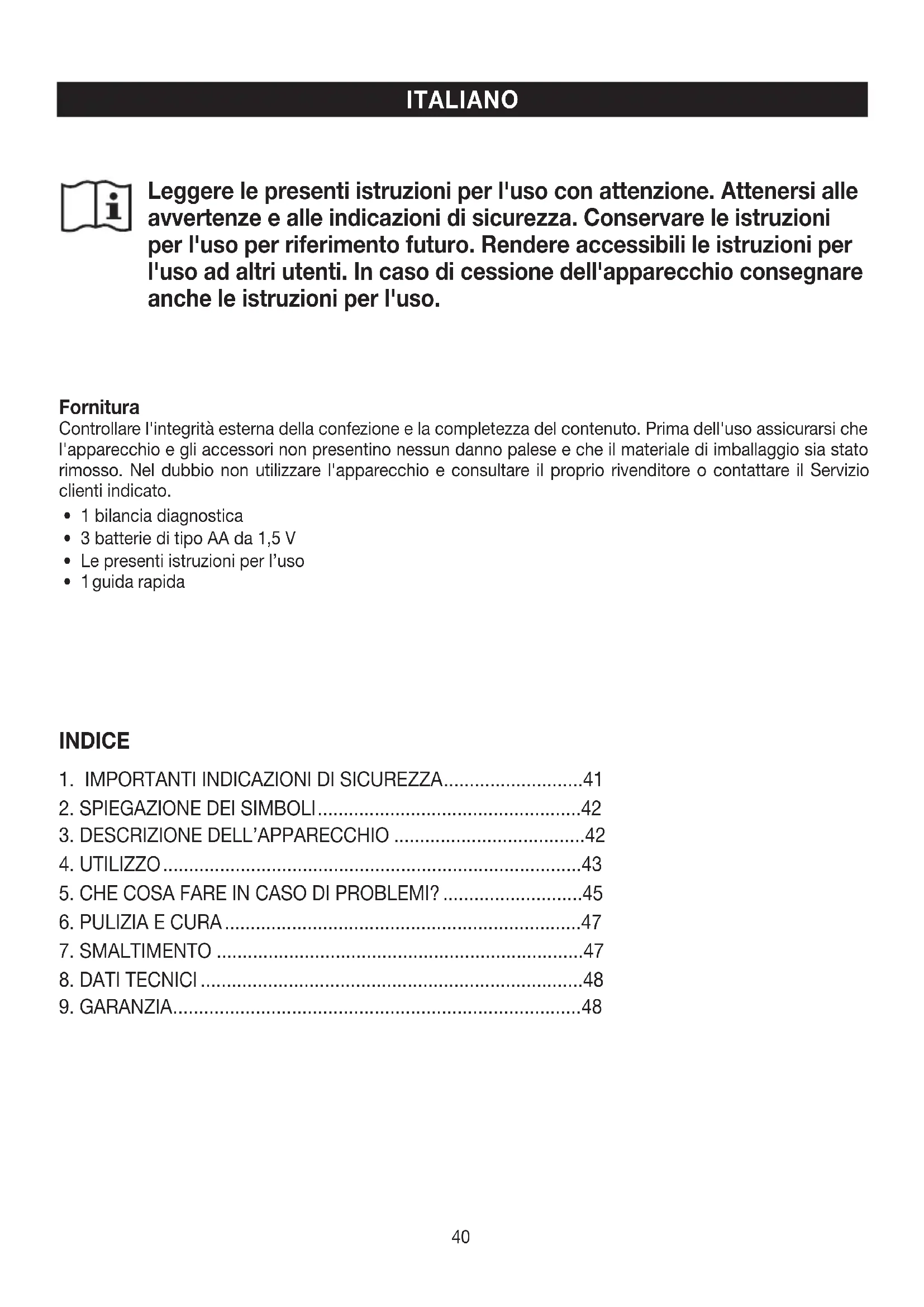 INDICE Fornitura Controllare l'integrità esterna della confezione e la completezza del contenuto. Prima dell'uso assicurarsi che l'apparecchio e gli accessori non presentino nessun danno palese e che il materiale di imballaggio sia stato rimosso. Nel dubbio non utilizzare l'apparecchio e consultare il proprio rivenditore o contattare il Servizio clienti indicato.