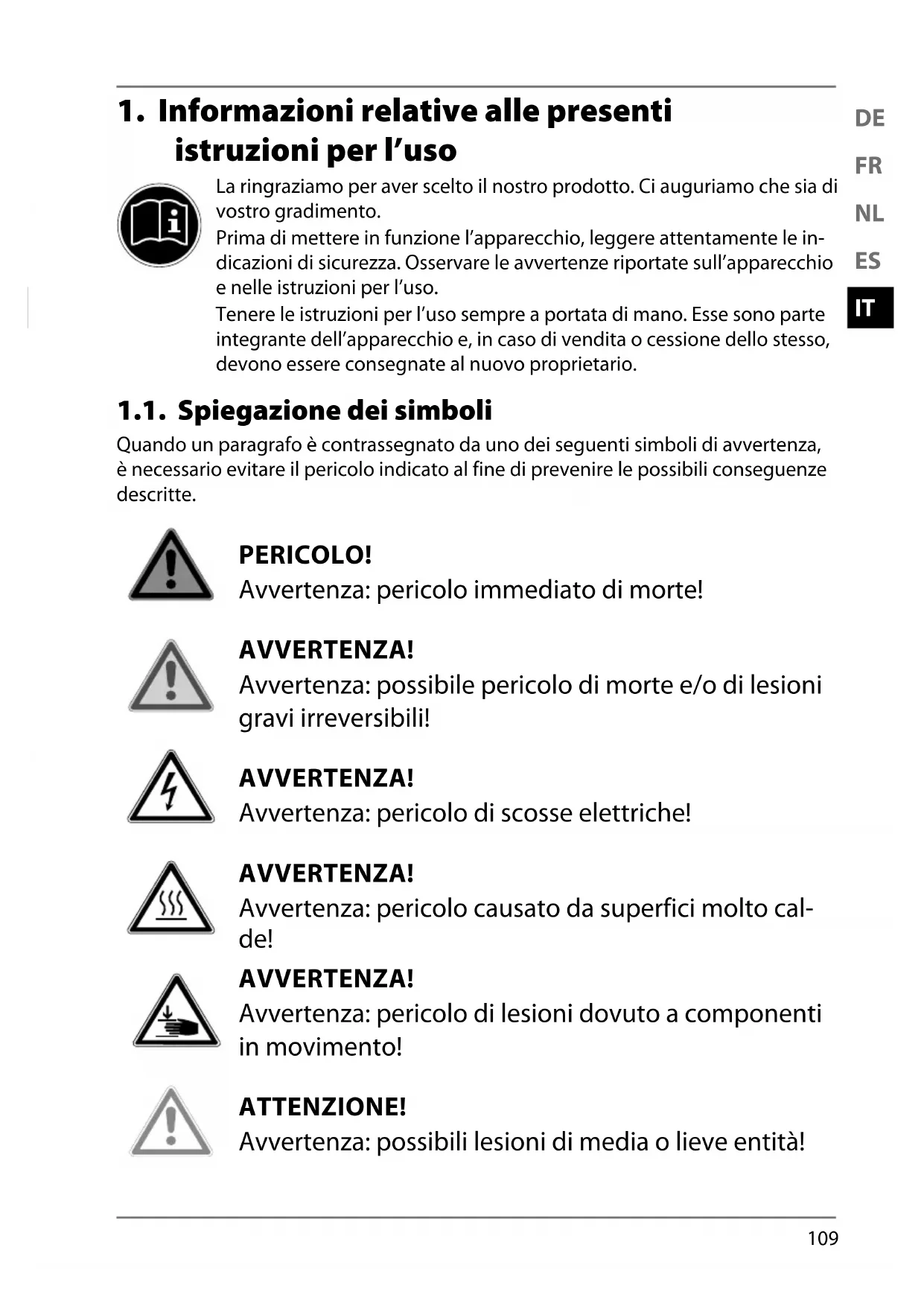 istruzioni per l’uso La ringraziamo per aver scelto il nostro prodotto. Ci auguriamo che sia di vostro gradimento. Prima di mettere in funzione l’apparecchio, leggere attentamente le in- dicazioni di sicurezza. Osservare le avvertenze riportate sull’apparecchio e nelle istruzioni per l’uso. Tenere le istruzioni per l’uso sempre a portata di mano. Esse sono parte integrante dell’apparecchio e, in caso di vendita o cessione dello stesso, devono essere consegnate al nuovo proprietario. 1.1. Spiegazione dei simboli Quando un paragrafo è contrassegnato da uno dei seguenti simboli di avvertenza, è necessario evitare il pericolo indicato al fine di prevenire le possibili conseguenze descritte. PERICOLO! Avvertenza: pericolo immediato di morte! AVVERTENZA! Avvertenza: possibile pericolo di morte e/o di lesioni gravi irreversibili! AVVERTENZA! Avvertenza: pericolo di scosse elettriche! AVVERTENZA! Avvertenza: pericolo causato da superfici molto cal- de! AVVERTENZA! Avvertenza: pericolo di lesioni dovuto a componenti in movimento! ATTENZIONE! Avvertenza: possibili lesioni di media o lieve entità!110 AVVISO! Seguire le indicazioni al fine di evitare danni mate- riali! Ulteriori informazioni sull’utilizzo dell’apparecchio! Osservare le indicazioni contenute nelle istruzioni per l’uso!
