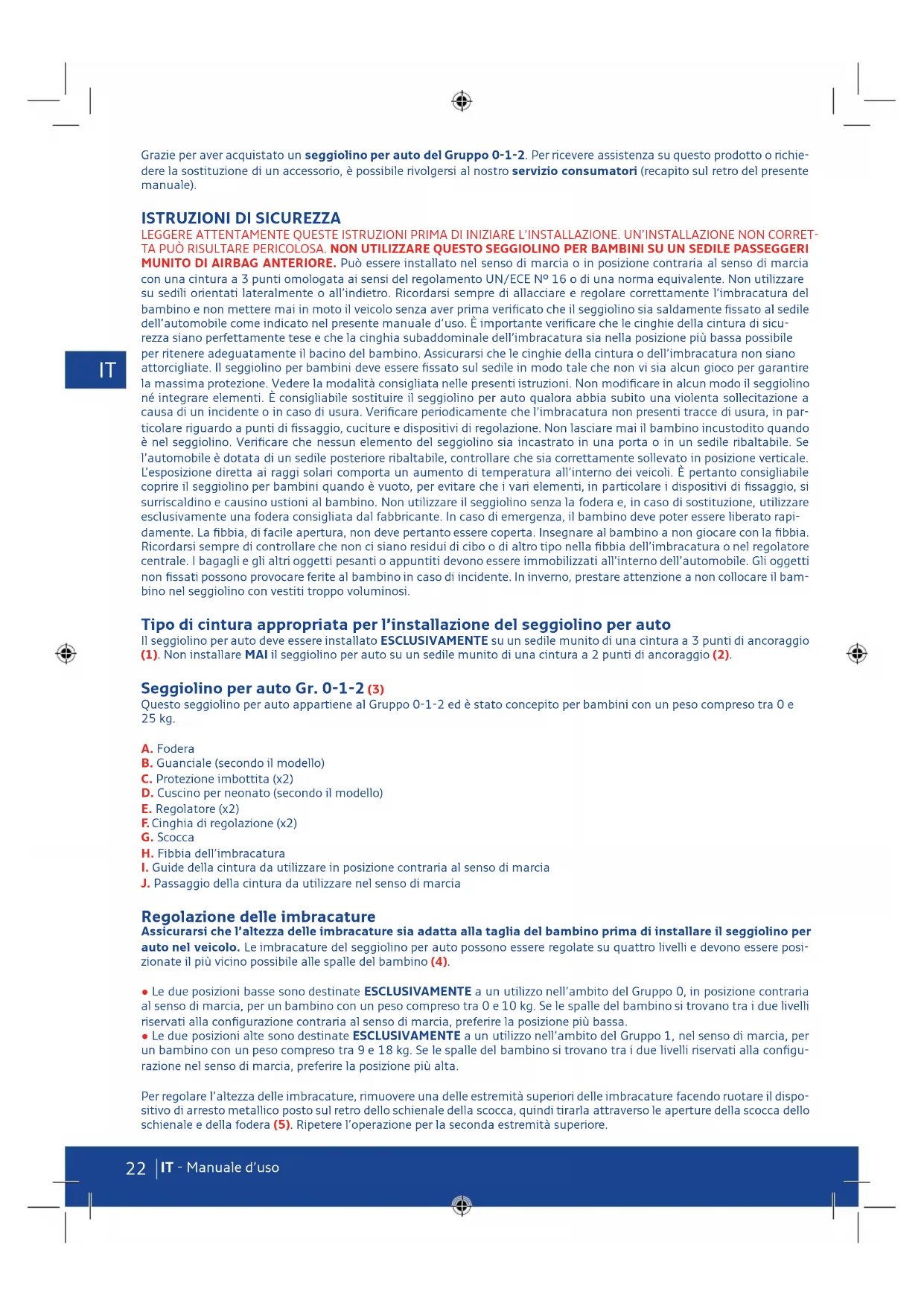 LEGGERE ATTENTAMENTE QUESTE ISTRUZIONI PRIMA DI INIZIARE L’INSTALLAZIONE. UN’INSTALLAZIONE NON CORRET- TA PUÒ RISULTARE PERICOLOSA. NON UTILIZZARE QUESTO SEGGIOLINO PER BAMBINI SU UN SEDILE PASSEGGERI MUNITO DI AIRBAG ANTERIORE. Può essere installato nel senso di marcia o in posizione contraria al senso di marcia con una cintura a 3 punti omologata ai sensi del regolamento UN/ECE N° 16 o di una norma equivalente. Non utilizzare su sedili orientati lateralmente o all’indietro. Ricordarsi sempre di allacciare e regolare correttamente l’imbracatura del bambino e non mettere mai in moto il veicolo senza aver prima verificato che il seggiolino sia saldamente fissato al sedile dell’automobile come indicato nel presente manuale d’uso. È importante verificare che le cinghie della cintura di sicu- rezza siano perfettamente tese e che la cinghia subaddominale dell’imbracatura sia nella posizione più bassa possibile per ritenere adeguatamente il bacino del bambino. Assicurarsi che le cinghie della cintura o dell’imbracatura non siano attorcigliate. Il seggiolino per bambini deve essere fissato sul sedile in modo tale che non vi sia alcun gioco per garantire la massima protezione. Vedere la modalità consigliata nelle presenti istruzioni. Non modificare in alcun modo il seggiolino né integrare elementi. È consigliabile sostituire il seggiolino per auto qualora abbia subito una violenta sollecitazione a causa di un incidente o in caso di usura. Verificare periodicamente che l’imbracatura non presenti tracce di usura, in par- ticolare riguardo a punti di fissaggio, cuciture e dispositivi di regolazione. Non lasciare mai il bambino incustodito quando è nel seggiolino. Verificare che nessun elemento del seggiolino sia incastrato in una porta o in un sedile ribaltabile. Se l’automobile è dotata di un sedile posteriore ribaltabile, controllare che sia correttamente sollevato in posizione verticale. L’esposizione diretta ai raggi solari comporta un aumento di temperatura all’interno dei veicoli. È pertanto consigliabile coprire il seggiolino per bambini quando è vuoto, per evitare che i vari elementi, in particolare i dispositivi di fissaggio, si surriscaldino e causino ustioni al bambino. Non utilizzare il seggiolino senza la fodera e, in caso di sostituzione, utilizzare esclusivamente una fodera consigliata dal fabbricante. In caso di emergenza, il bambino deve poter essere liberato rapi- damente. La fibbia, di facile apertura, non deve pertanto essere coperta. Insegnare al bambino a non giocare con la fibbia. Ricordarsi sempre di controllare che non ci siano residui di cibo o di altro tipo nella fibbia dell’imbracatura o nel regolatore centrale. I bagagli e gli altri oggetti pesanti o appuntiti devono essere immobilizzati all’interno dell’automobile. Gli oggetti non fissati possono provocare ferite al bambino in caso di incidente. In inverno, prestare attenzione a non collocare il bam- bino nel seggiolino con vestiti troppo voluminosi. Tipo di cintura appropriata per l’installazione del seggiolino per auto Il seggiolino per auto deve essere installato ESCLUSIVAMENTE su un sedile munito di una cintura a 3 punti di ancoraggio (1). Non installare MAI il seggiolino per auto su un sedile munito di una cintura a 2 punti di ancoraggio (2). Seggiolino per auto Gr. 0-1-2 (3) Questo seggiolino per auto appartiene al Gruppo 0-1-2 ed è stato concepito per bambini con un peso compreso tra 0 e 25 kg. A. Fodera B. Guanciale (secondo il modello) C. Protezione imbottita (x2) D. Cuscino per neonato (secondo il modello) E. Regolatore (x2) F. Cinghia di regolazione (x2) G. Scocca H. Fibbia dell’imbracatura