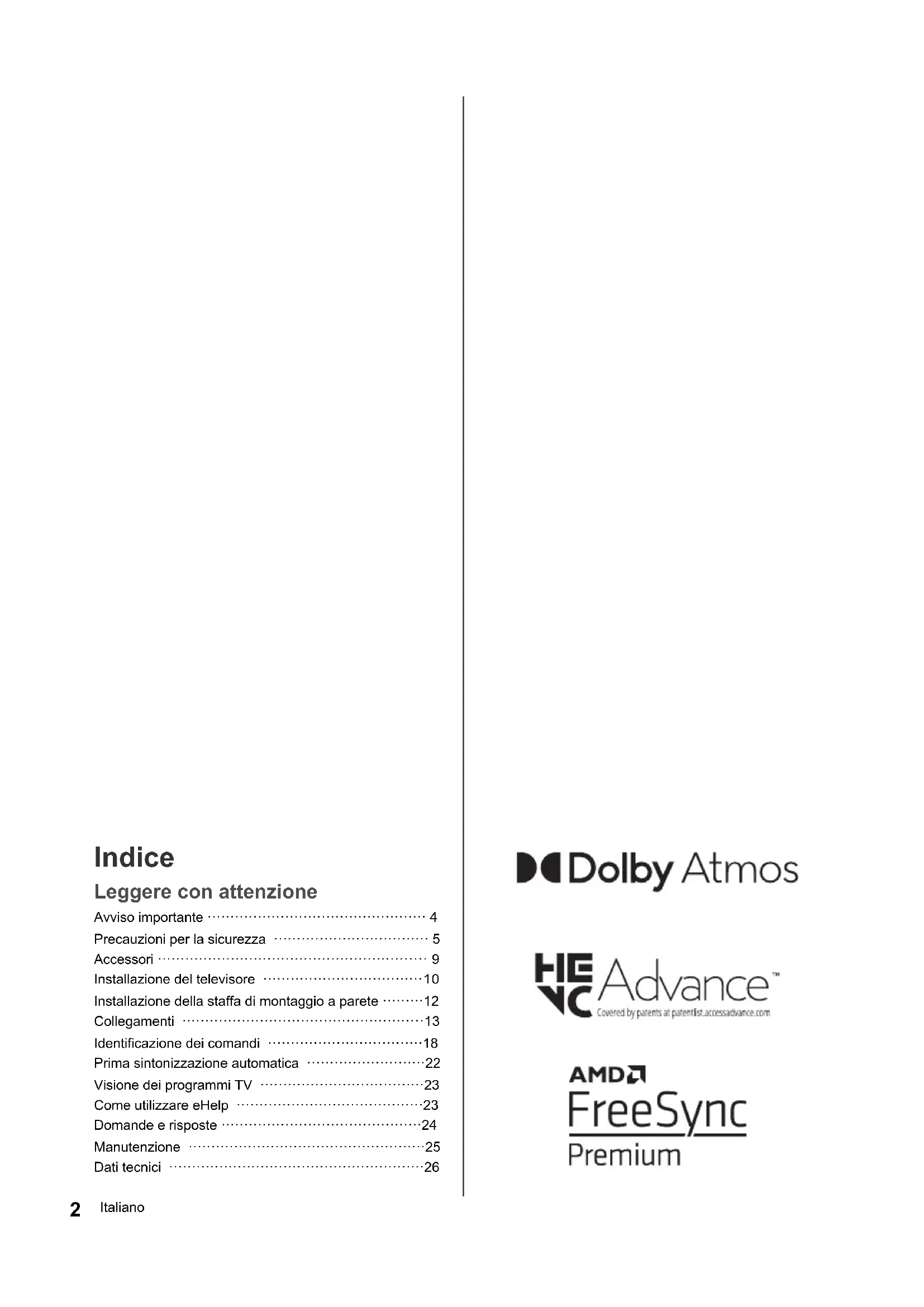 e i loghi sono marchi registrati di proprietà di Bluetooth SIG, Inc. Qualsiasi utilizzo di tali marchi da parte di Panasonic Corporation viene concesso in licenza. DVB e i loghi DVB sono marchi di DVB Project. x.v.Colour™ è un marchio. DiSEqC™ è un marchio di EUTELSAT. Google è un marchio di Google LLC. YouTube e il logo YouTube sono marchi di Google LLC. Amazon, Prime Video, Alexa e tutti i loghi correlati sono marchi di Amazon.com, Inc. o dei suoi affiliati. © Disney Questo prodotto è conforme alle specifiche tecniche di UHD Alliance: Modalità di riferimento specificata UHDA, Versione 1.0. Il logo FILMMAKER MODE™ è un marchio di UHD Alliance, Inc. negli Stati Uniti e in altri paesi. © 2020 Advanced Micro Devices, Inc. Tutti i diritti riservati. AMD e FreeSync nonché le loro combinazioni sono marchi di Advanced Micro Devices, Inc. ≥ Per informazioni sui marchi, vedere [eHelp] (Ricerca per criterio > Leggere prima > Prima dell’uso > Licenza). Salvo diversa indicazione, in questo manuale vengono utilizzate le immagini relative a TX-65LX940E. Le immagini mostrate potrebbero differire a seconda del modello. TX-43_49_55_65LX940E_TQB4GA0108_ita.book 3 ページ 2022年1月7日 金曜日 午後4時1分4 Italiano Avviso importante Avviso per le funzioni DVB / trasmissioni di dati / IPTV ≥ Questo televisore è progettato in conformità agli standard (informazioni aggiornate a gennaio 2022) DVB-T / T2 (MPEG2, MPEG4-AVC(H.264) e MPEG HEVC(H.265)) relativi ai servizi digitali terrestri, DVB- C (MPEG2, MPEG4-AVC(H.264) e MPEG HEVC(H.265)) relativi ai servizi digitali via cavo e DVB-S (MPEG2, MPEG4-AVC(H.264) e MPEG HEVC(H.265)) relativi ai servizi digitali satellitari. Per la disponibilità dei servizi DVB-T / T2 o DVB-S nella propria area, rivolgersi al proprio rivenditore locale. Per la disponibilità dei servizi DVB-C con questo televisore, rivolgersi al proprio fornitore di servizi via cavo. ≥ Questo televisore potrebbe non funzionare correttamente con segnali non conformi agli standard DVB-T / T2, DVB-C o DVB-S. ≥ La disponibilità delle caratteristiche varia a seconda del paese, dell’area geografica, dell’emittente, del fornitore di servizi e dell’ambiente di rete e satellitare. ≥ Non tutti i moduli CI funzionano correttamente con questo televisore. Rivolgersi al proprio fornitore di servizi per informazioni sui moduli CI disponibili.