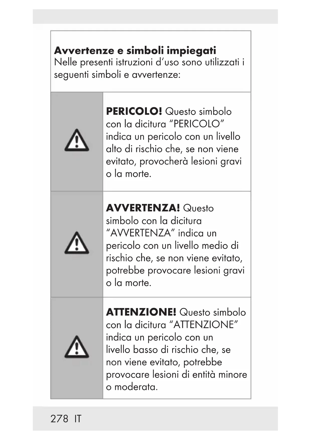 Avvertenze e simboli impiegati ..... Pagina 278 Introduzione ........................................... Pagina 281 Uso consigliato ...................................... Pagina 281 Avvisi sui marchi ................................... Pagina 282 Note sulla sicurezza ............................ Pagina 282 Istruzioni per la sicurezza delle batterie/batterie ricaricabili................... Pagina 286 Descrizione delle parti ...................... Pagina 289 Dati tecnici .............................................. Pagina 289 Contenuto della confezione ............. Pagina 292 Prima dell’uso ........................................ Pagina 292 Funzionamento...................................... Pagina 292 Risoluzione dei problemi .................. Pagina 299 Conservazione dopo l’utilizzo ........ Pagina 300 Pulizia ........................................................ Pagina 301 Smaltimento ........................................... Pagina 301 Dichiarazione di conformità UE semplificata ..................................... Pagina 303 Garanzia e assistenza ....................... Pagina 304 Garanzia ................................................. Pagina 304 Gestione dei casi in garanzia ................ Pagina 305 Assistenza ............................................... Pagina 306278 IT Avvertenze e simboli impiegati Nelle presenti istruzioni d‘uso sono utilizzati i seguenti simboli e avvertenze: PERICOLO! Questo simbolo con la dicitura “PERICOLO” indica un pericolo con un livello alto di rischio che, se non viene evitato, provocherà lesioni gravi o la morte. AVVERTENZA! Questo simbolo con la dicitura “AVVERTENZA” indica un pericolo con un livello medio di rischio che, se non viene evitato, potrebbe provocare lesioni gravi o la morte. ATTENZIONE! Questo simbolo con la dicitura “ATTENZIONE” indica un pericolo con un livello basso di rischio che, se non viene evitato, potrebbe provocare lesioni di entità minore o moderata.279