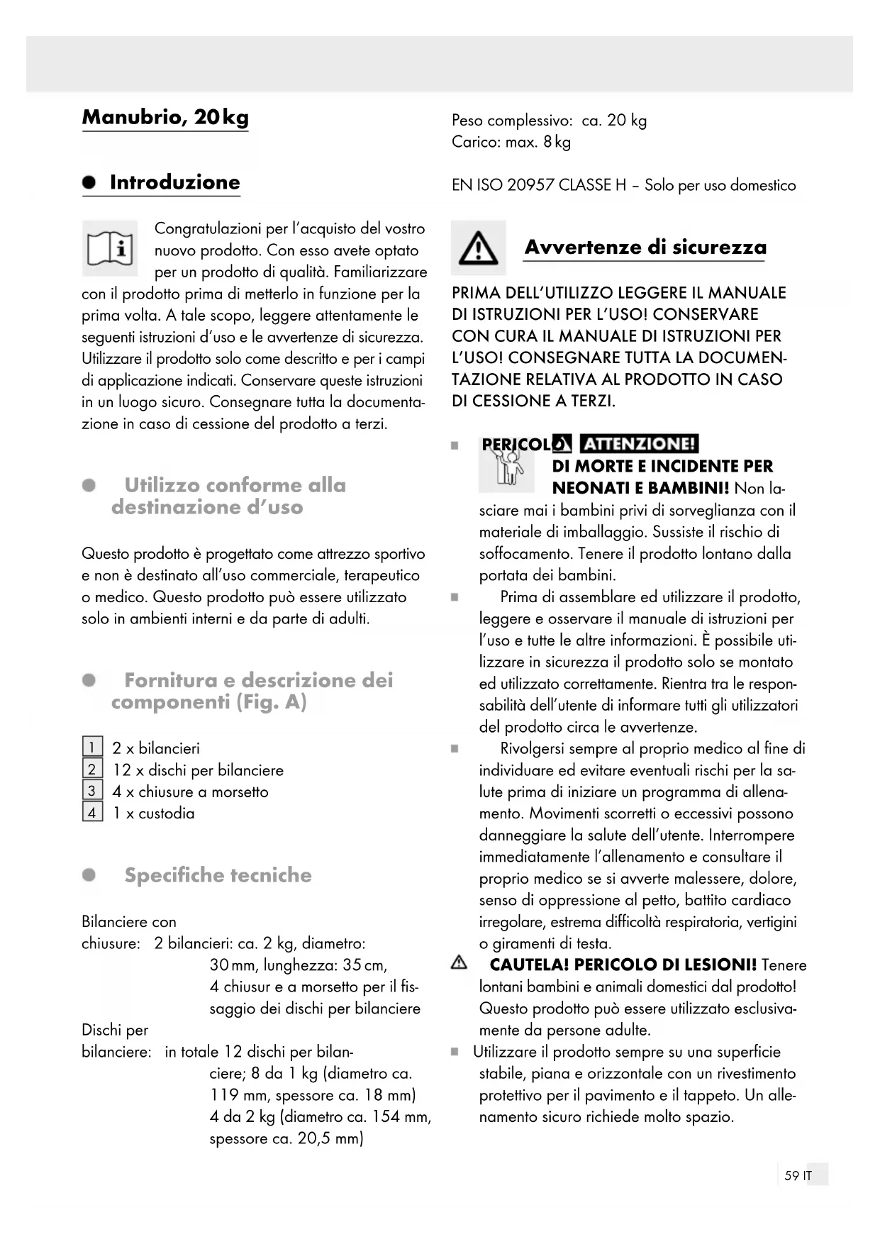1 x custodia Specifiche tecniche Bilanciere con chiusure: 2 bilancieri: ca. 2 kg, diametro: 30 mm, lunghezza: 35 cm, 4 chiusur e a morsetto per il fis- saggio dei dischi per bilanciere Dischi per bilanciere: in totale 12 dischi per bilan- ciere; 8 da 1 kg (diametro ca. 119 mm, spessore ca. 18 mm) 4 da 2 kg (diametro ca. 154 mm, spessore ca. 20,5 mm) Peso complessivo: ca. 20 kg Carico: max. 8 kg EN ISO 20957 CLASSE H – Solo per uso domestico Avvertenze di sicurezza
