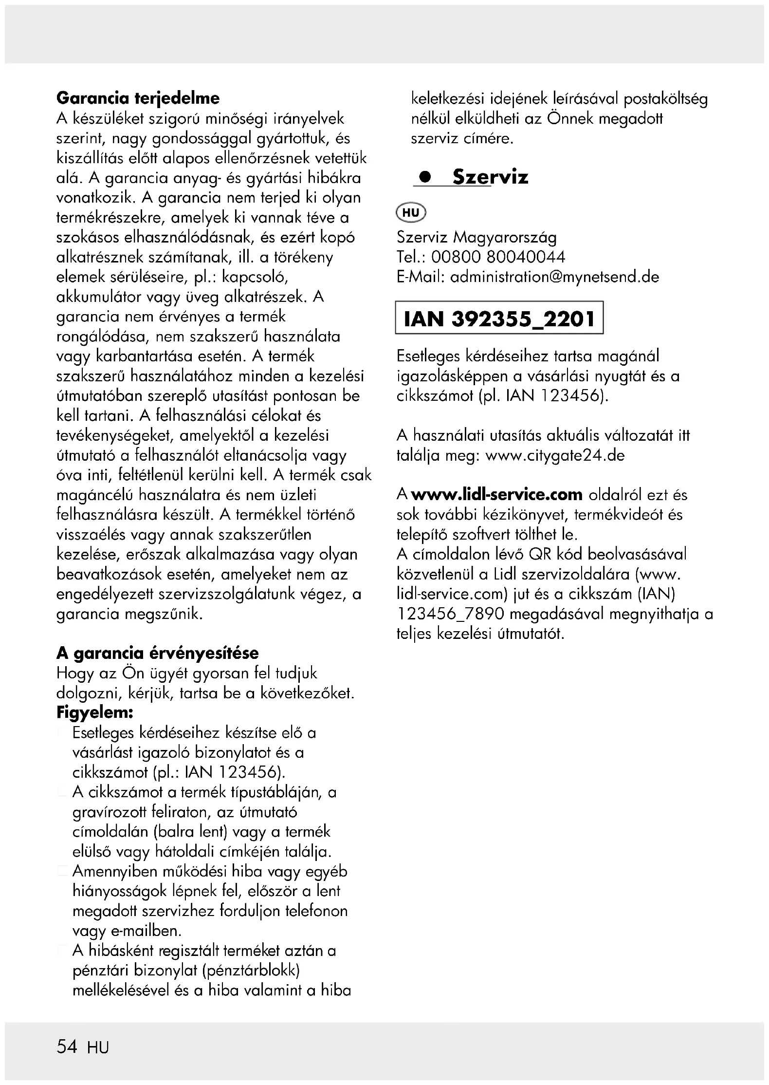 Assistenza Svizzera Tel.: 00800 80040044 E-Mail: administration@mynetsend.de IAN 392355_2201 Per qualsiasi richiesta si prega di conservare lo scontrino e il codice dell‘articolo (ad es. IAN 123456) da esibire come prova d‘acquisto. La versione aggiornata delle istruzioni per l’uso è disponibile nel sito: www.citygate24.de Dalla pagina www.lidl-service.com