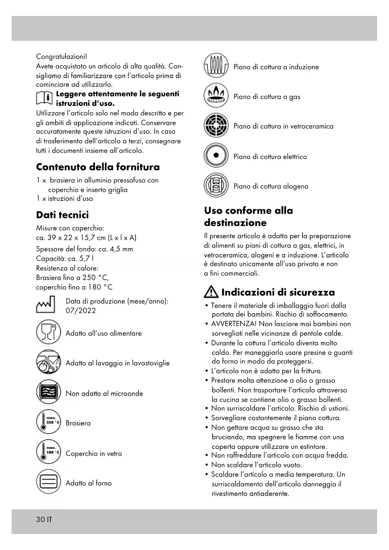 - IMPORTANTE! Non utilizzare mai detergenti aggressivi. Smaltimento Smaltire l’articolo e i materiali dell’imballaggio in conformità con le direttive locali in vigore. I materiali di imballaggio, come ad esempio le pellicole, non devono essere alla portata dei bambini. Conservare i materiali di imballaggio in un luogo non raggiungibile per i bambini. Smaltire i prodotti e gli imballaggi in modo ecologico. Il codice di riciclaggio ha lo scopo di contrassegnare i diversi materiali al fine di introdurli nel ciclo di riutilizzo (recycling). Il codice è composto dal simbolo del riciclo, che dovrebbe rappresentare il ciclo del riutilizzo, e un numero che indica di che materiale si tratta. IT32 IT Avvertenze sulla garanzia e sulla gestione dei servizi di assistenza L’articolo è stato prodotto con la massima cura e sotto un continuo controllo. DELTA-SPORT HANDELS KONTOR GmbH concede ai clienti finali privati, su questo articolo, tre anni di garanzia dalla data di acquisto (termine di garanzia) sulla base delle seguenti disposizioni. La garanzia vale solo per i vizi di materiale e di lavorazione. La garanzia non si estende alle parti soggette ad un normale degradamento e che siano quindi da considerarsi come pezzi soggetti ad usura (ad es. le batterie) né ai pezzi fragili come ad es. interruttori, batterie ricaricabi- li oppure pezzi in vetro. Dalla presente garanzia sono escluse le richieste legate a casi di utilizzo non conforme oppure di abuso dell’articolo, oppure di utilizzo avvenuto non nell’ambito delle condizioni previste oppure del campo di impiego previsto, oppure in caso di non osservanza delle direttive riportate nelle istruzioni d’uso, a meno che il cliente non dimostri che sussista un vizio di materiale o di lavorazione che non sia riconducibile ad una delle circostanze riportate sopra. Le richieste di garanzia possono essere avanza- te solo entro il relativo termine, su presentazione dello scontrino originale di acquisto. Si prega quindi di conservare lo scontrino originale. Il ter- mine di garanzia non sarà prolungato a seguito di eventuali riparazioni effettuate sulla base della garanzia, della garanzia obbligatoria prevista per legge oppure di accondiscendenza. Ciò vale anche per le parti sostituite oppure riparate. In caso di contestazione rivolgersi dapprima alla hotline di assistenza sotto indicata oppure mettersi in contatto con noi via e-mail. Laddove sussista un caso coperto dalla garanzia, l’artico- lo sarà – a nostra discrezione – da noi riparato gratuitamente, sostituito oppure sarà rimborsato il prezzo di acquisto. Non sussistono ulteriori diritti derivanti dalla garanzia. I vostri diritti giuridici, in particolare i diritti di garanzia obbligatoria prevista dalla legge nei confronti del relativo venditore, non sono limitati dalla presente garanzia. IAN: 390017_2201 Assistenza Italia Tel.: 800781188 E-Mail: deltasport@lidl.it33 Szívből gratulálunk! Vásárlásával kiváló minőségű terméket válasz- tott. Használatba vétele előtt ismerkedjen meg a termékkel. Figyelmesen olvassa el az alábbi használati útmutatót. A terméket kizárólag az itt ismertetett módon, a rendeltetésének megfelelően használja. Gondo- san őrizze meg a használati útmutatót. A termék továbbadásakor adja át az összes kapcsolódó dokumentumot is. Csomag tartalma 1 x öntött alumínium sütőedény fedővel és behelyezhető ráccsal 1 x használati útmutató 1 x rövid útmutató Műszaki adatok Méret, fedővel: kb. 39 x 22 x 15,7 cm (H x SZÉ x MA) Aljvastagság: kb. 4,5 mm Űrtartalom: kb. 5,7 l Hőállóság: Sütőedény max. 250 °C, fedő max. 180 °C Gyártási dátum (hónap/év): 07/2022 Élelmiszerekhez használható Mosogatógépben tisztítható Nem használható mikrohullámú sütőben Sütőedény Üvegfedő Sütőben használható Indukciós tűzhely Gáztűzhely Üvegkerámia főzőlap Elektromos tűzhely Halogén tűzhely Rendeltetésszerű használat Ez a termék ételek gáz-, elektromos, üvegkerámia, halogén és indukciós tűzhelyen történő elkészítésére alkalmas. A termék csak magáncélú felhasználásra alkalmas, üzleti, kereskedelmi célú használatra nem. Biztonsági utasítások