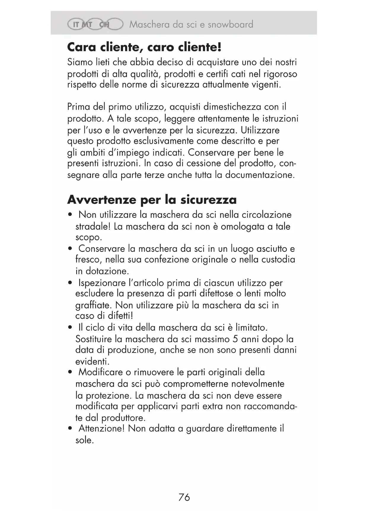 Garanzia ed espletamento del servizio di assistenza Egregio Cliente, questo apparecchio ha una garanzia di 3 anni dalla data di acquisto. Qualora questo prodotto presentasse vizi, Le spettano diritti legali nei confronti del venditore del prodotto. La garanzia qui di seguito descritta non costituisce alcun limite a tali diritti legali. Condizioni di garanzia l periodo di garanzia decorre dalla data di acquisto. Si prega di conservare bene lo scontrino di cassa. Quest‘ul- timo è necessario come prova d‘acquisto. Qualora entro tre anni a partire dalla data d‘acquisto del prodotto si presentasse un difetto del materiale o di fabbricazio- ne, provvederemo a nostra discrezione a riparare o a sostituire gratuitamente il prodotto oppure a rimborsare il prezzo d‘acquisto. Questa prestazione di garanzia ha come presupposto che l‘apparecchio guasto e la prova d‘acquisto (scontrino di cassa) vengano presentati entro il termine di tre anni e che si descriva per iscritto in cosa consiste il difetto e quando si è evidenziato. Se il vizio rientra nell’ambito della nostra garanzia, il Suo prodotto verrà riparato o sostituito da uno nuovo. Con la riparazione o la sostituzione del prodotto non decorre un nuovo periodo di garanzia. Periodo di garanzia e diritti legali di rivendicazione di vizi Il periodo di garanzia non viene prolungato da interventi in garanzia. Ciò vale anche per le parti sostituite e ripa- rate. Danni e vizi eventualmente già presenti al momento dell‘acquisto devono venire segnalati immediatamente dopo che l‘apparecchio è stato disimballato. Le riparazi- oni eseguite dopo la scadenza del periodo di garanzia sono a pagamento.Maschera da sci e snowboard IT MT CH IT MT CH Maschera da sci e snowboard