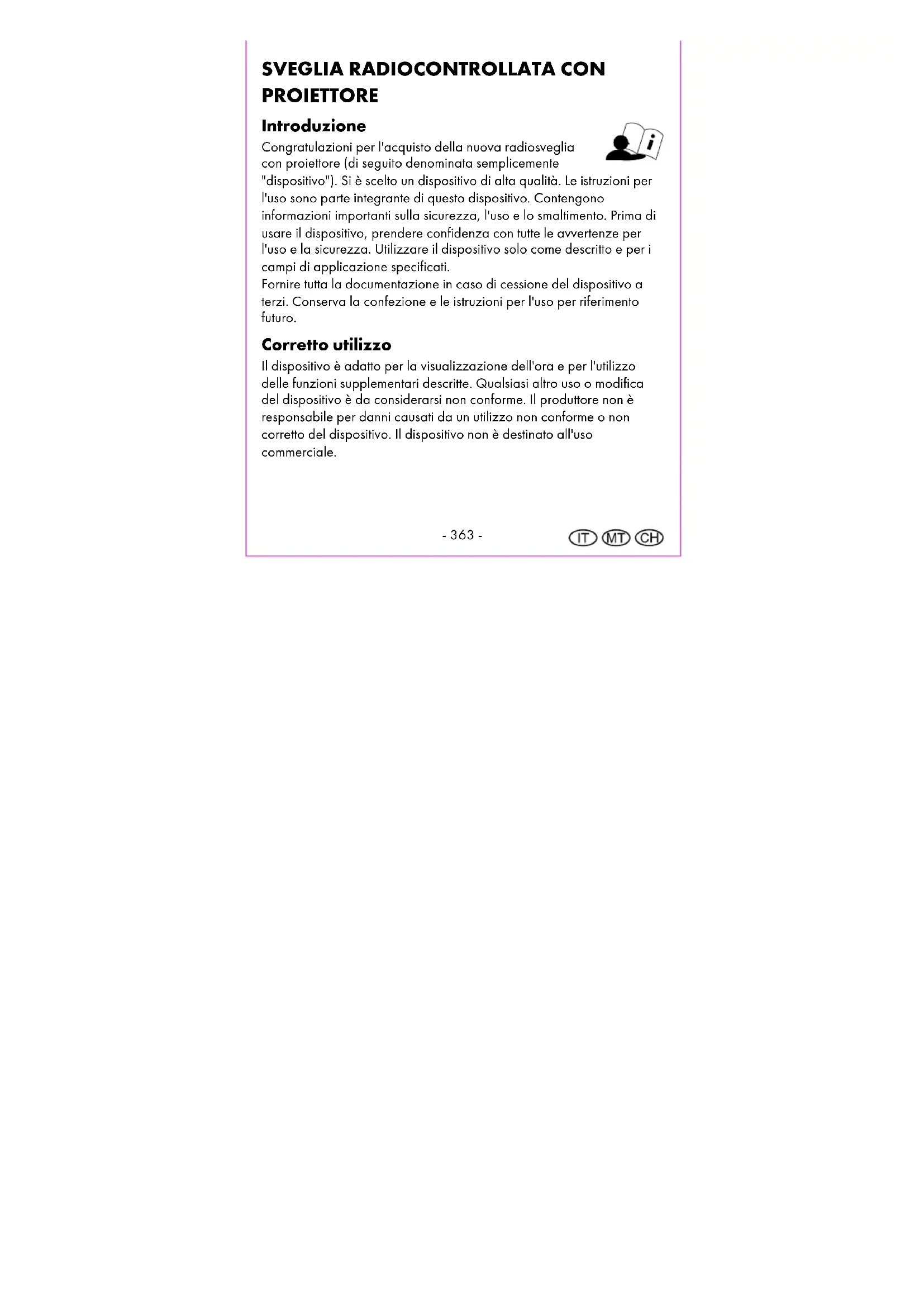 PROIETTORE Introduzione Congratulazioni per l'acquisto della nuova radiosveglia con proiettore (di seguito denominata semplicemente "dispositivo"). Si è scelto un dispositivo di alta qualità. Le istruzioni per l'uso sono parte integrante di questo dispositivo. Contengono informazioni importanti sulla sicurezza, l'uso e lo smaltimento. Prima di usare il dispositivo, prendere confidenza con tutte le avvertenze per l'uso e la sicurezza. Utilizzare il dispositivo solo come descritto e per i campi di applicazione specificati. Fornire tutta la documentazione in caso di cessione del dispositivo a terzi. Conserva la confezione e le istruzioni per l'uso per riferimento futuro. Corretto utilizzo Il dispositivo è adatto per la visualizzazione dell'ora e per l'utilizzo delle funzioni supplementari descritte. Qualsiasi altro uso o modifica del dispositivo è da considerarsi non conforme. Il produttore non è responsabile per danni causati da un utilizzo non conforme o non corretto del dispositivo. Il dispositivo non è destinato all'uso commerciale.- 364 - Contenuto della confezione Nota: Si prega di controllare il contenuto della confezione dopo l'acquisto. Assicurarsi che tutti i componenti siano presenti e non danneggiati. Se il contenuto della confezione è incompleto e/o presenta parti danneggiate, non utilizzare il dispositivo. Contattare il servizio di assistenza (vedere "Trattamento in caso di garanzia"). 1 x radiosveglia con proiezione 1 x alimentatore a spina 2 batterie da 1,5 V AA LR6 1 manuale di istruzioni Dati tecnici Radiosveglia con proiezione Orologio radiocontrollato DCF77 Frequenza di trasmissione: 77,5 kHz Dimensioni: circa 130 x 96 x 50 mm Peso: ca. Modello 1: 177 g (escl. batteria) Modello 2: 173 g (escl. batteria) Ingresso: 5,0 V 1,0 A, 5,0 W Condizioni climatiche per la conservazione: -10 °C ~ 60 °C Funzionamento con 2 batterie AA LR6/R6 da 1,5 V - simbolo di tensione continua Funzionamento con l'alimentatore a spina, modello: YJTH05- 365 - Alimentatore a spina Modello: YJTH05 Produttore: Putian Yijia Electronic Co., Ltd. Dimensioni: circa 63,6 x 37,7 x 65,1 mm Peso: Modello 1: 71 g Modello 2: 67 g Lunghezza cavo: circa 1,5 m Ingresso: 100 – 240 V, ~50/60 Hz, 0,3 A max Uscita: 5,0 V 1,0 A, 5,0 W Rendimento medio durante il funzionamento: 74,1 % Efficienza a carico leggero (10%): 73,63% Consumo energetico a vuoto: 0,07 W Classe di protezione: II Grado di protezione: IP20- 366 - Legenda PERICOLO! Questa parola di segnalazione indica un pericolo con un elevato livello di rischio che, se non viene evitato, porta a conseguenze letali o a gravi ferite. AVVERTENZA! Tale simbolo/parola di avvertenza indica un pericolo con un livello di rischio medio che, se non evitato, può provocare la morte o lesioni gravi.