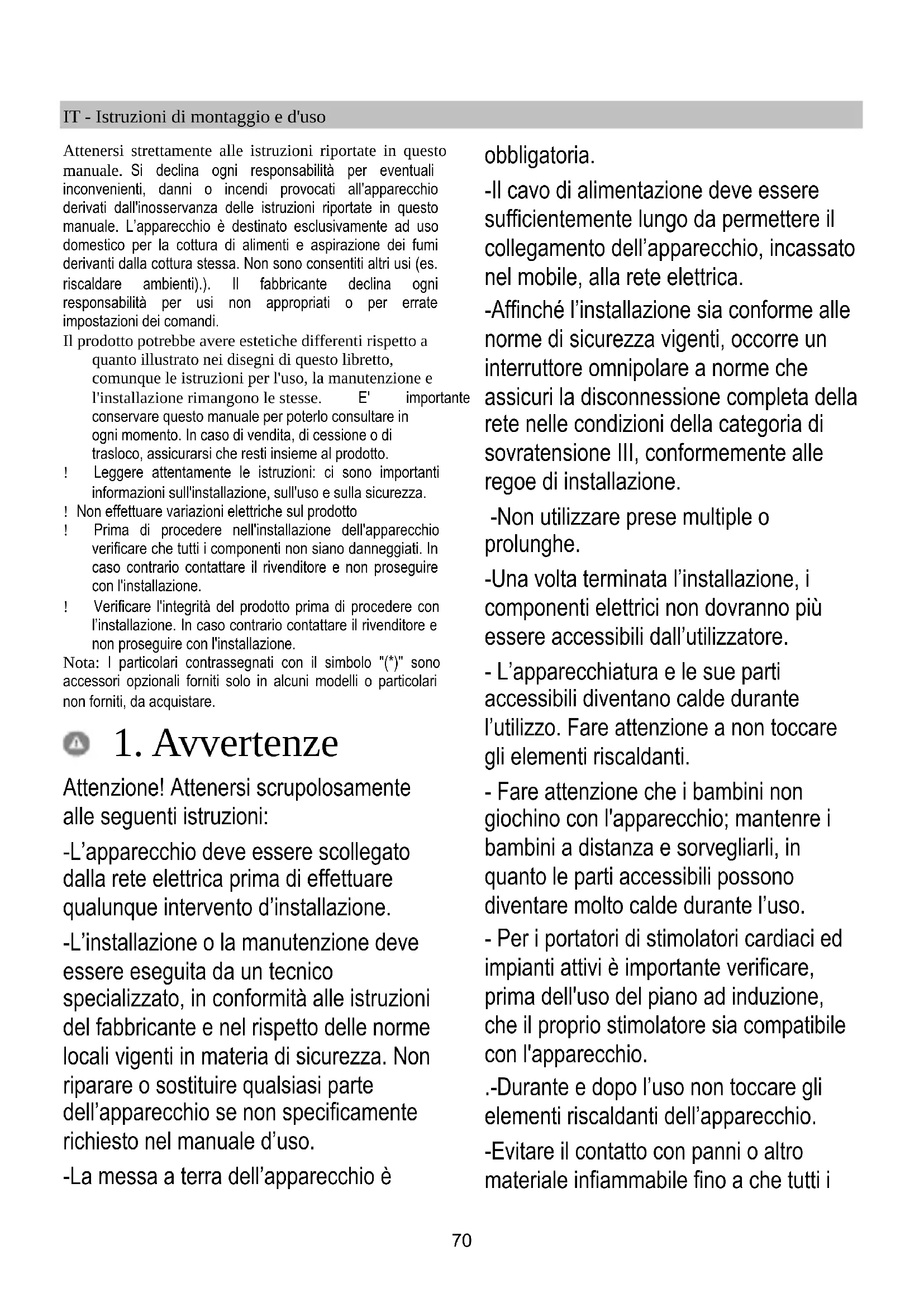 Attenzione! Attenersi scrupolosamente alle seguenti istruzioni: -L’apparecchio deve essere scollegato dalla rete elettrica prima di effettuare qualunque intervento d’installazione. -L’installazione o la manutenzione deve essere eseguita da un tecnico specializzato, in conformità alle istruzioni del fabbricante e nel rispetto delle norme locali vigenti in materia di sicurezza. Non riparare o sostituire qualsiasi parte dell’apparecchio se non specificamente richiesto nel manuale d’uso. -La messa a terra dell’apparecchio è obbligatoria. -Il cavo di alimentazione deve essere sufficientemente lungo da permettere il collegamento dell’apparecchio, incassato nel mobile, alla rete elettrica. -Affinché l’installazione sia conforme alle norme di sicurezza vigenti, occorre un interruttore omnipolare a norme che assicuri la disconnessione completa della rete nelle condizioni della categoria di sovratensione III, conformemente alle regoe di installazione. -Non utilizzare prese multiple o prolunghe. -Una volta terminata l’installazione, i componenti elettrici non dovranno più essere accessibili dall’utilizzatore. - L’apparecchiatura e le sue parti accessibili diventano calde durante l’utilizzo. Fare attenzione a non toccare gli elementi riscaldanti. - Fare attenzione che i bambini non giochino con l'apparecchio; mantenre i bambini a distanza e sorvegliarli, in quanto le parti accessibili possono diventare molto calde durante l’uso. - Per i portatori di stimolatori cardiaci ed impianti attivi è importante verificare, prima dell'uso del piano ad induzione, che il proprio stimolatore sia compatibile con l'apparecchio. .-Durante e dopo l’uso non toccare gli elementi riscaldanti dell’apparecchio. -Evitare il contatto con panni o altro materiale infiammabile fino a che tutti i71 componenti dell’apparecchio non si siano sufficientemente raffreddati. -Non riporre materiale infiammabile sull’apparecchio o nelle sue vicinanze. -I grassi e gli oli surriscaldati prendono facilmente fuoco. Sorvegliare la cottura di alimenti ricchi di grasso e di olio. -Se la superficie è incrinata, spegnere l’apparecchio per evitare la possibilità di scossa elettrica. -L’apparecchio non è destinato ad essere messo in funzione per mezzo di un temporizzatore esterno oppure di un sistema di comando a distanza separato. -La cottura non sorvegliata su un piano cottura con olio o grasso può essere pericolosa e generare incendi. - Il processo di cottura deve essere sorvegliato. Un processo di cottura a breve termine deve essere sorvegliato continuamente. - Non tentare MAI di spegnere le fiamme con acqua. Al contrario, spegnere l’apparecchio e soffocare le fiamme, ad esempio con un coperchio o una coperta antincendio. Pericolo di incendio: non poggiare oggetti sulle superfici di cottura. -Non usare pulitrici a vapore. -Non appoggiare oggetti metallici come coltelli, forchette, cucchiai e coperchi sulla superficie del piano di cottura perché potrebbero surriscaldarsi. - Prima di allacciare il modello alla rete elettrica: controllare la targa dati (posta nella parte inferiore dell'apparecchio) per accertarsi che la tensione e potenza siano corrispondenti a quella della rete e la presa di collegamento sia idonea. In caso di dubbio interpellare un elettricista qualificato. Importante: - Dopo l'uso, spegnere il piano di cottura tramite il suo dispositivo di comando e non fare affidamento sul rivelatore di pentole. - Evitare le fuoriuscite di liquido, pertanto per bollire o riscaldare liquidi, ridurre l’alimentazione di calore. - Non lasciare gli elementi riscaldanti accesi con pentole e padelle vuote oppure senza recipienti. - Una volta terminato di cucinare, spegnere la relativa zona. - Per la cottura non utilizzate mai dei fogli di carta d'alluminio, oppure non posate mai direttamente dei prodotti imballati con alluminio. L'alluminio fonderebbe e danneggerebbe irrimediabilmente il vostro apparecchio. - Non riscaldare mai una scatoletta o un barattolo di latta contenente alimenti senza prima averlo aperto: potrebbe esplodere! Questa avvertenza si applica a tutti gli altri tipi di piani cottura. - L'utilizzo di una potenza elevata come la funzione Booster non è adatta per il riscaldamento di alcuni liquidi come ad esempio l'olio per friggere. L'eccessivo calore potrebbe essere pericoloso. In questi casi si consiglia l'utilizzo di una potenza meno elevata.72 - l recipienti devono esser posti direttamente sul piano cottura e devono essere centrati. In nessun caso inserire altri oggetti tra la pentola e il piano di cottura. - In situazione di elevate temperature l'apparecchio diminuisce automaticamente il livello di potenza delle zone di cottura. Prima di qualsiasi operazione di pulizia o manutenzione, disinserire il prodotto dalla rete elettrica togliendo la spina o staccando l’interruttore generale dell’abitazione. Per tutte le operazioni di installazione e manutenzione utilizzare guanti da lavoro. L’apparecchio può essere utilizzato da bambini di età non inferiore a 8 anni e da persone con ridotte capacità fisiche, sensoriali o mentali, o prive di esperienza o della necessaria conoscenza, purchè sotto sorveglianza oppure dopo che le stesse abbiano ricevuto istruzioni relative all’uso sicuro dell’apparecchio e alla comprensione dei pericoli ad esso inerenti. I bambini devono essere controllati affinché non giochino con l’apparecchio. La pulizia e la manutenzione non deve essere effettuata da bambini senza sorveglianza. Il locale deve disporre di sufficiente ventilazione, quando la cappa da cucina viene utilizzata contemporaneamente ad altri apparecchi a combustione di gas o altri combustibili. La cappa va frequentemente pulita sia internamente che esternamente (ALMENO UNA VOLTA AL MESE), rispettare comunque quanto espressamente indicato nelle istruzioni di manutenzione. L’inosservanza delle norme di pulizia della cappa e della sostituzione e pulizia dei filtri comporta risch