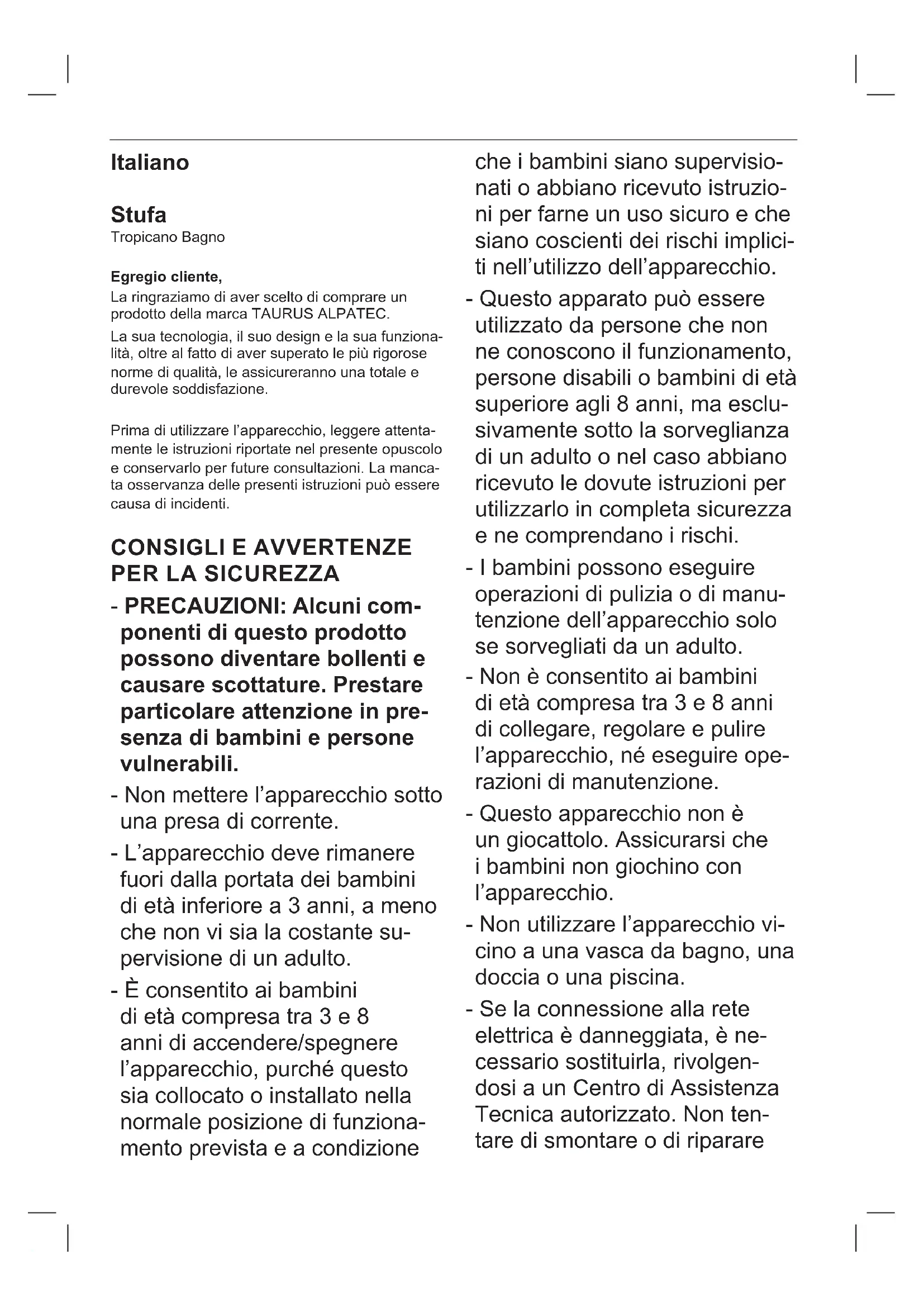 Scarica le istruzioni per il tuo Riscaldamento in formato PDF gratuitamente! Trova il tuo manuale Tropicano Bagno - TAURUS e riprendi in mano il tuo dispositivo elettronico. In questa pagina sono pubblicati tutti i documenti necessari per l'utilizzo del tuo dispositivo. Tropicano Bagno del marchio TAURUS.