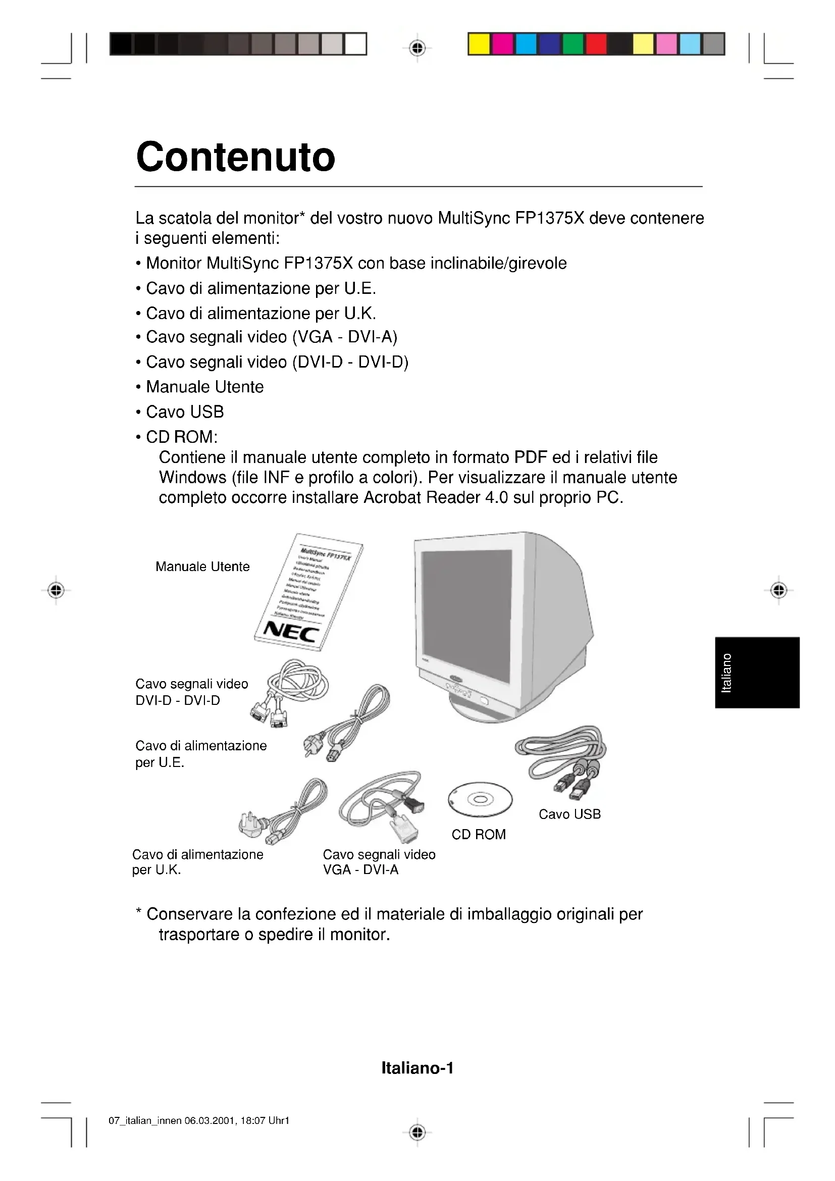 Cavo di alimentazione per U.K. 07_italian_innen 06.03.2001, 18:07 Uhr1Italiano-2 Guida rapida Per collegare il monitor MultiSync FP1375X al sistema, attenersi alle seguenti istruzioni: