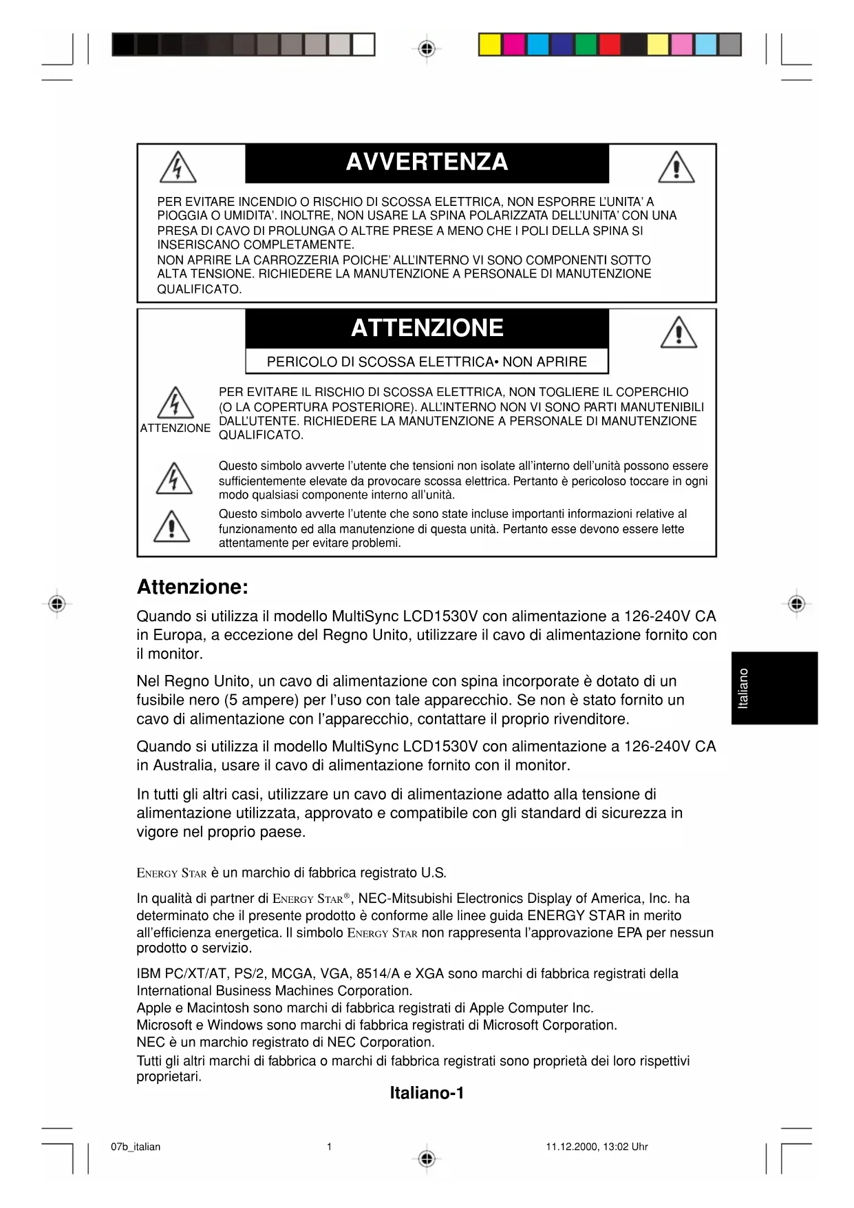 , NEC-Mitsubishi Electronics Display of America, Inc. ha determinato che il presente prodotto è conforme alle linee guida ENERGY STAR in merito all’efficienza energetica. Il simbolo ENERGY STAR non rappresenta l’approvazione EPA per nessun prodotto o servizio. IBM PC/XT/AT, PS/2, MCGA, VGA, 8514/A e XGA sono marchi di fabbrica registrati della International Business Machines Corporation. Apple e Macintosh sono marchi di fabbrica registrati di Apple Computer Inc. Microsoft e Windows sono marchi di fabbrica registrati di Microsoft Corporation. NEC è un marchio registrato di NEC Corporation. Tutti gli altri marchi di fabbrica o marchi di fabbrica registrati sono proprietà dei loro rispettivi proprietari. Attenzione: Quando si utilizza il modello MultiSync LCD1530V con alimentazione a 126-240V CA in Europa, a eccezione del Regno Unito, utilizzare il cavo di alimentazione fornito con il monitor. Nel Regno Unito, un cavo di alimentazione con spina incorporate è dotato di un fusibile nero (5 ampere) per l’uso con tale apparecchio. Se non è stato fornito un cavo di alimentazione con l’apparecchio, contattare il proprio rivenditore. Quando si utilizza il modello MultiSync LCD1530V con alimentazione a 126-240V CA in Australia, usare il cavo di alimentazione fornito con il monitor. In tutti gli altri casi, utilizzare un cavo di alimentazione adatto alla tensione di alimentazione utilizzata, approvato e compatibile con gli standard di sicurezza in vigore nel proprio paese. 07b_italian 11.12.2000, 13:02 Uhr1Italiano-2 Dichiarazione Dichiarazione del Costruttore. Qui si certifica che i monitor a colori MultiSync LCD1530V (LA-15R01) sono conformi a Direttiva del Consiglio Europeo73/23/EEC: - EN 60950 Direttiva del Consiglio Europeo 89/336/EEC: - EN 55022 - EN 61000-3-2 - EN 61000-3-3 - EN 55024 e sono contrassegnati con NEC-Mitsubishi Electric Visual Systems, Corp.