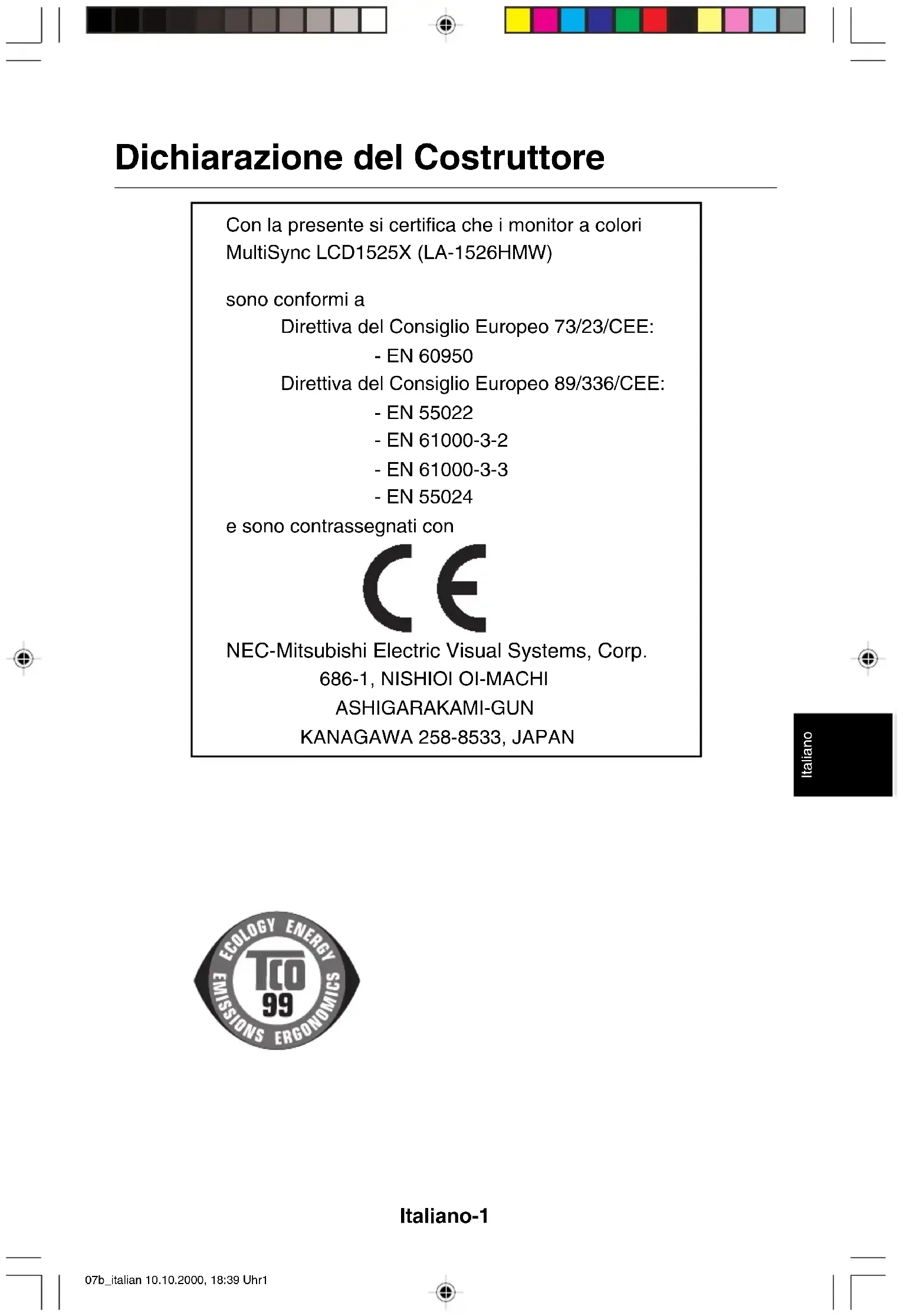 , NEC-Mitsubishi Electronics Display of America, Inc. ha determinato che il presente prodotto è conforme alle linee guida ENERGY STAR in merito all’efficienza energetica. Il simbolo ENERGY STAR non rappresenta l’approvazione EPA per nessun prodotto o servizio. IBM PC/XT/AT, PS/2, MCGA, VGA, 8514/A e XGA sono marchi di fabbrica registrati della International Business Machines Corporation. Apple e Macintosh sono marchi di fabbrica registrati di Apple Computer Inc. Microsoft e Windows sono marchi di fabbrica registrati di Microsoft Corporation. NEC è un marchio registrato di NEC Corporation. Tutti gli altri marchi di fabbrica o marchi di fabbrica registrati sono proprietà dei loro rispettivi proprietari. Istruzioni di sicurezza 07b_italian 10.10.2000, 18:39 Uhr12Nederlands-1 Nederlands Kennisgeving van de fabrikant Hierbij verklaren wij dat de kleurenmonitor MultiSync LCD1525X (LA-1526HMW) in overeenstemming is met 73/23/EEC van de Europese Commissie: - EN 60950 89/336/EEC van de Europese Commissie: - EN 55022 - EN 61000-3-2 - EN 61000-3-3 - EN 55024 en het volgende keurmerk heeft: NEC-Mitsubishi Electric Visual Systems, Corp.