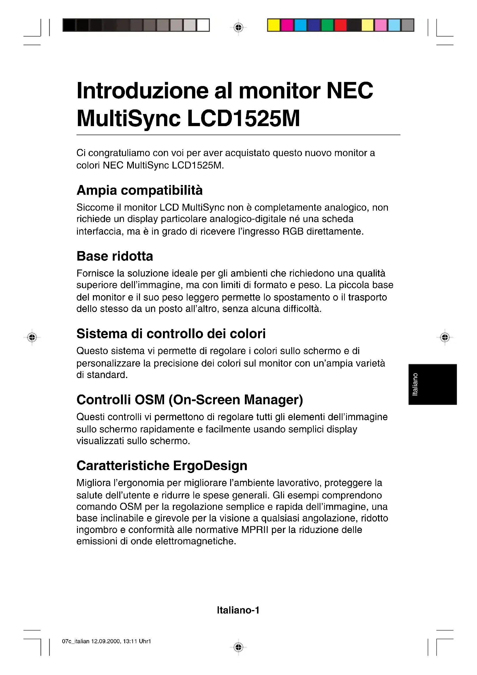 - Regolazione automatica Per una descrizione più completa di questi comandi OSM, consultare la sezione di questo manuale sui controlli. NOTA: Se avete dei problemi, fate riferimento alla sezione “Localizzazione dei guasti” di questo Manuale utente. 07c_italian 12.09.2000, 13:11 Uhr7Italiano-8 Controlli Controlli OSM I controlli OSM sulla parte anteriore del monitor offrono le seguenti funzioni: Per accedere ai controlli OSM, premete uno qualunque dei tasti di controllo ( , , , ) oppure il tasto PROCEED. Per silenziare il suono agire sul tasto RESET. Menù secondario Per uscire al menù principale OSM. Per spostare l’area evidenziata sù/giù per selezionare uno dei controlli. Per spostare la barra sinistra/ destra per aumentare o diminuire la regolazione. Attiva la caratteristica di regolazione automatica. Nel modo degli utensili ed in quello dell’informazione, apre una finestra addizionale. Ripristina il controllo evidenziato all’impostazione di fabbrica. EXIT CONTROL / CONTROL / PROCEED RESET Menù principale Per uscire dai controlli OSM. Per spostare l’area evidenziata sù/giù per selezionare uno dei controlli. Per spostare l’area evidenziata verso sinistra/ destra per selezionare i menù di controllo. Nessun funzionamento. Ripristina il menù di controllo evidenziato alle impostazioni di fabbrica. NOTA: Se viene premuto RESET, un dialogo di avvertenza appare permettendovi di cancellare la funzione RESET stessa. 07c_italian 12.09.2000, 13:11 Uhr8Italiano-9 Italiano Luminosità e contrasto Luminosità Regola la luminosità dell’immagine complessiva e dello sfondo. Contrasto Regola la luminosità dell’immagine in relazione allo sfondo. Regolazione automatica Corregge l’immagine visualizzata nel caso di segnale in ingresso non standard. Regolazione automatica Regola automaticamente la posizione, la dimensione orizzontale e la regolazione Fine. Posizione Controlla la posizione verticale ed orizzontale dell’immagine entro il display a cristalli liquidi. LEFT/RIGHT Regola la posizione orizzontale dell’immagine entro il display a cristalli liquidi. UP/DOWN Regola la posizione verticale dell’immagine entro il display a cristalli liquidi. Regolazione automatica Regola automaticamente la posizione orizzontale e verticale dell’immagine entro il display a cristalli liquidi. Regolazione immagine Dimensione orizzontale Aumentando o diminuendo questo parametro si regola la dimensione orizzontale dell’immagine. Fine Aumentando o diminuendo questo parametro si migliorano la messa a fuoco, la chiarezza e la stabilità dell’immagine. 07c_italian 12.09.2000, 13:11 Uhr9Italiano-10 Regolazione automatica Regola automaticamente la dimensione orizzontale e la regolazione Fine. Utensili Lingua: i controlli OSM sono disponibili in sette lingue diverse. AVVERTENZA ATTENZIONE:PER RIDURRE IL RISCHIO DI FOLGORAZIONE, ASSICURARSI CHE IL CAVO SIASTATO STACCATO DALLA PRESA DI ALIMENTAZIONE A MURO. PER STACCARE COMPLETAMENTE L’ALIMENTAZIONE DALL’UNITÀ, STACCARE IL CAVO DI ALIMENTAZIONE DALLA PRESA DI ALIMENTAZIONE. NON RIMUOVERE LACOPERTURA (O IL FONDO). ALL’INTERNO NON VI SONO PARTI LA CUI MANUTENZIONE È AFFIDATA ALL’UTENTE. PER LA MANUTENZIONE, FARE RIFERIMENTO A TECNICI DI SERVIZIO QUALIFICATI. Questo simbolo avverte che all’interno dell’unità potrebbero trovarsi parti in tensione non isolare in grado di causare folgorazioni. È quindi pericoloso ogni contatto con qualsiasi parte all’interno dell’unità. Questo simbolo avverte l’utente che è stata fornita documentazione importante riguardante l’uso è la manutenzione dell’unità. Tale documentazione deve quindi essere letta attentamente per evitare qualsiasi problema. ATTENZIONE Istruzioni per la sicurezza Attenzione: Quando si utilizza il modello MultiSync LCD1525M con alimentazione a 220-240V CA in Europa, a eccezione del Regno Unito, utilizzare il cavo di alimentazione fornito con il monitor. Nel Regno Unito, un cavo di alimentazione con spina incorporate è dotato di un fusibile nero (5 ampere) per l’uso con tale apparecchio. Se non è stato fornito un cavo di alimentazione con l’apparecchio, contattare il proprio rivenditore. Quando si utilizza il modello MultiSync LCD1525M con alimentazione a 220-240V CA in Australia, usare il cavo di alimentazione fornito con il monitor. In tutti gli altri casi, utilizzare un cavo di alimentazione adatto alla tensione di alimentazione utilizzata, approvato e compatibile con gli standard di sicurezza in vigore nel proprio paese. PER EVITARE INCENDI O FOLGORAZIONI, NON ESPORRE QUESTA UNITÀ ALLA PIOGGIA O ALL’UMIDITÀ. INOLTRE, NON UTILIZZARE LA SPINA POLARIZZATA DI QUESTA UNITÀ CON UNA PROLUNGA, PRESA MULTIPLA O DI ALTRO TIPO, SE I CONNETTORI NON POSSONOESSERE INSERITI COMPLETAMENTE.EVITARE DI APRIRE LO CHASSIS IN QUANTO CONTIENE COMPONENTI AD ALTA TENSIONE.PER LA MANUTENZIONE, FARE RIFERIMENTO A TECNICI DI SERVIZIO QUALIFICATI.07c_italian 12.09.2000, 13:11 Uhr10Nederlands-1 Nederlands Aan de slag met de NEC MultiSync LCD1525M Hartelijk gefeliciteerd met uw aankoop van de kleurenmonitor NEC MultiSync LCD1525M met ware kleuren! Ruimere compatibiliteit Aangezien de MultiSync LCD-monitor volledig analoog is, kan deze rechtstreeks RGB-input accepteren, zodat u geen speciale analoog- naar-digitaal video- of interfacekaart nodig hebt. Klein voetstuk De ideale oplossing voor omgevingen waar superieure beeldkwaliteit een vereiste is, maar waar gewicht en omvang aan beperkingen onderhevig zijn. Dankzij het smalle voetstuk van de monitor en het geringe gewicht kunt u deze gemakkelijk tussen verschillende locaties verplaatsen of transporteren. Kleurenbeheersysteem Hiermee kunt u de kleuren op uw scherm aanpassen en de kleurjuistheid van uw monitor aanpassen aan een groot aantal standaarden. OSM (On-Screen Manager)-besturingselementen Hiermee kunt u snel en gemakkelijk alle aspecten van uw scherm instellen via eenvoudige menu’s op het scherm. ErgoDesign-kenmerken Ontwor