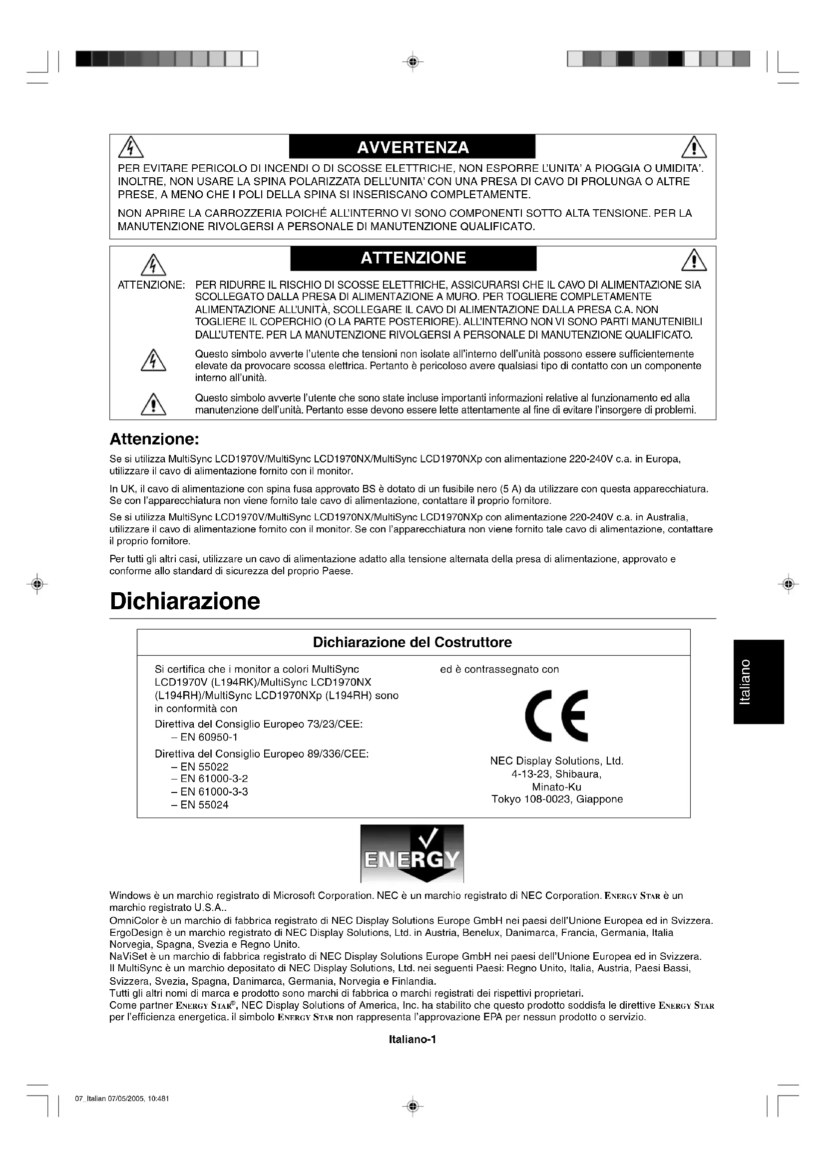 - Pour nettoyer le boîtier, imbiber le chiffon avec un détergent neutre et de l’eau, essuyez le boîtier et séchez avec un chiffon sec. REMARQUE : La surface du boîtier contient de nombreuses matières plastiques. N’UTILISEZ PAS de benzène, diluant, détergent alcalin, détergent à base d’alcool, nettoyant pour vitres, cire, vernis, lessive ou insecticide. Ne posez pas de matières en caoutchouc ou en vinyle sur le boîtier pendant de longues périodes. Ces types de liquides et de tissus peuvent abîmer, craqueler ou écailler la peinture. 06_French 07/05/2005, 10:4810Italiano Italiano-1 AVVERTENZA ATTENZIONE ATTENZIONE: PER RIDURRE IL RISCHIO DI SCOSSE ELETTRICHE, ASSICURARSI CHE IL CAVO DI ALIMENTAZIONE SIA SCOLLEGATO DALLA PRESA DI ALIMENTAZIONE A MURO. PER TOGLIERE COMPLETAMENTE ALIMENTAZIONE ALL’UNITÀ, SCOLLEGARE IL CAVO DI ALIMENTAZIONE DALLA PRESA C.A. NON TOGLIERE IL COPERCHIO (O LA PARTE POSTERIORE). ALL’INTERNO NON VI SONO PARTI MANUTENIBILI DALL’UTENTE. PER LA MANUTENZIONE RIVOLGERSI A PERSONALE DI MANUTENZIONE QUALIFICATO. Questo simbolo avverte l’utente che tensioni non isolate all’interno dell’unità possono essere sufficientemente elevate da provocare scossa elettrica. Pertanto è pericoloso avere qualsiasi tipo di contatto con un componente interno all’unità. Questo simbolo avverte l’utente che sono state incluse importanti informazioni relative al funzionamento ed alla manutenzione dell’unità. Pertanto esse devono essere lette attentamente al fine di evitare l’insorgere di problemi. Attenzione: Se si utilizza MultiSync LCD1970V/MultiSync LCD1970NX/MultiSync LCD1970NXp con alimentazione 220-240V c.a. in Europa,utilizzare il cavo di alimentazione fornito con il monitor. In UK, il cavo di alimentazione con spina fusa approvato BS è dotato di un fusibile nero (5 A) da utilizzare con questa apparecchiatura. Se con l’apparecchiatura non viene fornito tale cavo di alimentazione, contattare il proprio fornitore. Se si utilizza MultiSync LCD1970V/MultiSync LCD1970NX/MultiSync LCD1970NXp con alimentazione 220-240V c.a. in Australia, utilizzare il cavo di alimentazione fornito con il monitor. Se con l’apparecchiatura non viene fornito tale cavo di alimentazione, contattare il proprio fornitore. Per tutti gli altri casi, utilizzare un cavo di alimentazione adatto alla tensione alternata della presa di alimentazione, approvato e conforme allo standard di sicurezza del proprio Paese. PER EVITARE PERICOLO DI INCENDI O DI SCOSSE ELETTRICHE, NON ESPORRE L’UNITA’ A PIOGGIA O UMIDITA’. INOLTRE, NON USARE LA SPINA POLARIZZATA DELL’UNITA’ CON UNA PRESA DI CAVO DI PROLUNGA O ALTRE PRESE, A MENO CHE I POLI DELLA SPINA SI INSERISCANO COMPLETAMENTE. NON APRIRE LA CARROZZERIA POICHÉ ALL’INTERNO VI SONO COMPONENTI SOTTO ALTA TENSIONE. PER LA MANUTENZIONE RIVOLGERSI A PERSONALE DI MANUTENZIONE QUALIFICATO. Dichiarazione Dichiarazione del Costruttore Si certifica che i monitor a colori MultiSync LCD1970V (L194RK)/MultiSync LCD1970NX (L194RH)/MultiSync LCD1970NXp (L194RH) sono in conformità con Direttiva del Consiglio Europeo 73/23/CEE: – EN 60950-1 Direttiva del Consiglio Europeo 89/336/CEE: – EN 55022 – EN 61000-3-2 – EN 61000-3-3 – EN 55024 ed è contrassegnato con NEC Display Solutions, Ltd. 4-13-23, Shibaura, Minato-Ku Tokyo 108-0023, Giappone Windows è un marchio registrato di Microsoft Corporation. NEC è un marchio registrato di NEC Corporation. ENERGY STAR è un marchio registrato U.S.A.. OmniColor è un marchio di fabbrica registrato di NEC Display Solutions Europe GmbH nei paesi dell’Unione Europea ed in Svizzera. ErgoDesign è un marchio registrato di NEC Display Solutions, Ltd. in Austria, Benelux, Danimarca, Francia, Germania, Italia Norvegia, Spagna, Svezia e Regno Unito. NaViSet è un marchio di fabbrica registrato di NEC Display Solutions Europe GmbH nei paesi dell’Unione Europea ed in Svizzera. Il MultiSync è un marchio depositato di NEC Display Solutions, Ltd. nei seguenti Paesi: Regno Unito, Italia, Austria, Paesi Bassi, Svizzera, Svezia, Spagna, Danimarca, Germania, Norvegia e Finlandia.Tutti gli altri nomi di marca e prodotto sono marchi di fabbrica o marchi registrati dei rispettivi proprietari. Come partner ENERGY STAR