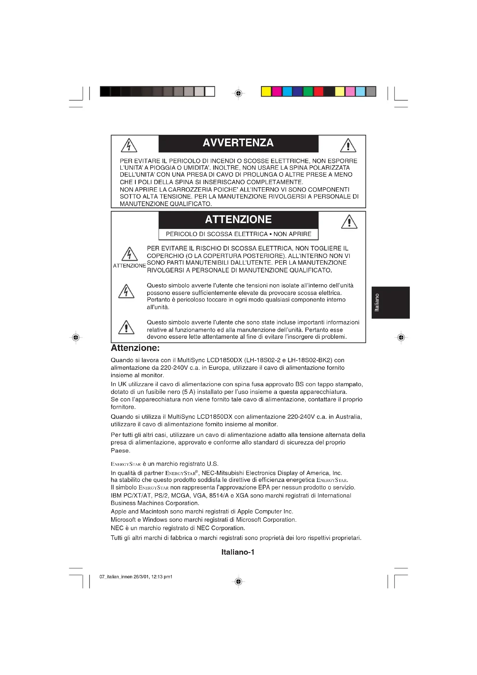 , NEC-Mitsubishi Electronics Display of America, Inc. ha stabilito che questo prodotto soddisfa le direttive di efficienza energetica ENERGYSTA R. Il simbolo ENERGYSTAR non rappresenta l’approvazione EPA per nessun prodotto o servizio. IBM PC/XT/AT, PS/2, MCGA, VGA, 8514/A e XGA sono marchi registrati di International Business Machines Corporation. Apple and Macintosh sono marchi registrati di Apple Computer Inc. Microsoft e Windows sono marchi registrati di Microsoft Corporation. NEC è un marchio registrato di NEC Corporation. Tutti gli altri marchi di fabbrica o marchi registrati sono proprietà dei loro rispettivi proprietari. 07_italian_innen 26/3/01, 12:13 pm1Italiano-2 Dichiarazione Dichiarazione del Costruttore Si certifica che il monitor a colori MultiSync LCD1850DX (LH-18S02-2) MultiSync LCD1850DX (LH-18S02-BK2) è conforme a Direttiva del Consiglio Europeo 73/23/CEE: – EN 60950 Direttiva del Consiglio Europeo 89/336/CEE: – EN 55022 – EN 61000-2-3 – EN 61000-3-3 – EN 55024 ed è contrassegnato con NEC-Mitsubishi Electric Visual Systems, Corp. MS Shibaura Bldg., 13-23, Shibaura 4-chome, Minato-Ku, Tokyo 108-0023, Japan Il consumo di potenza del monitor è inferiore a 3 W quando in modalità di risparmio energetico. 07_italian_innen 26/3/01, 12:13 pm2Italiano-3 Italiano Per l’uso da parte di clienti in U.S.A. o Canada Dichiarazione di conformità del Ministero Canadese delle Comunicazioni DOC: La presente apparecchiatura digitale di classe B è conforme a tutti i requisiti dei regolamenti canadesi per apparecchiature generatrici di interferenze. Cet appareil numérique de la classe B respecte toutes les exigences du Règlement sur le matériel brouiller du Canada. C-UL: Riporta la marcatura C-UL ed è conforme ai regolamenti di sicurezza canadesi secondo CSA C22.2 #950. Ce produit porte la marque ‘C-UL’ et se conforme aux règlements de sûrele Canadiens selon CAN/CSA C22.2 No. Informazioni FCC