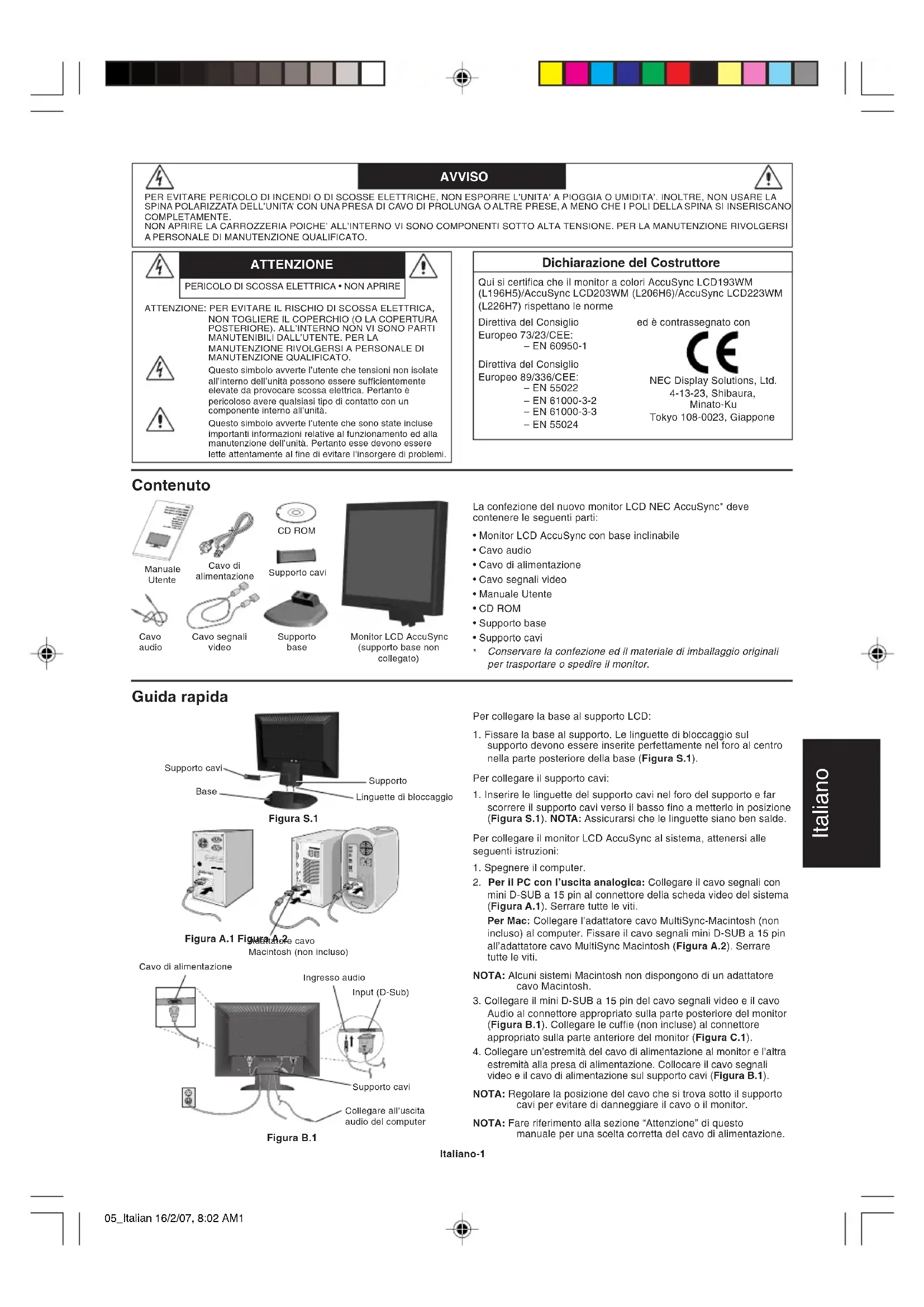 Scarica le istruzioni per il tuo Monitor in formato PDF gratuitamente! Trova il tuo manuale AccuSync LCD193WM - NEC e riprendi in mano il tuo dispositivo elettronico. In questa pagina sono pubblicati tutti i documenti necessari per l'utilizzo del tuo dispositivo. AccuSync LCD193WM del marchio NEC.
