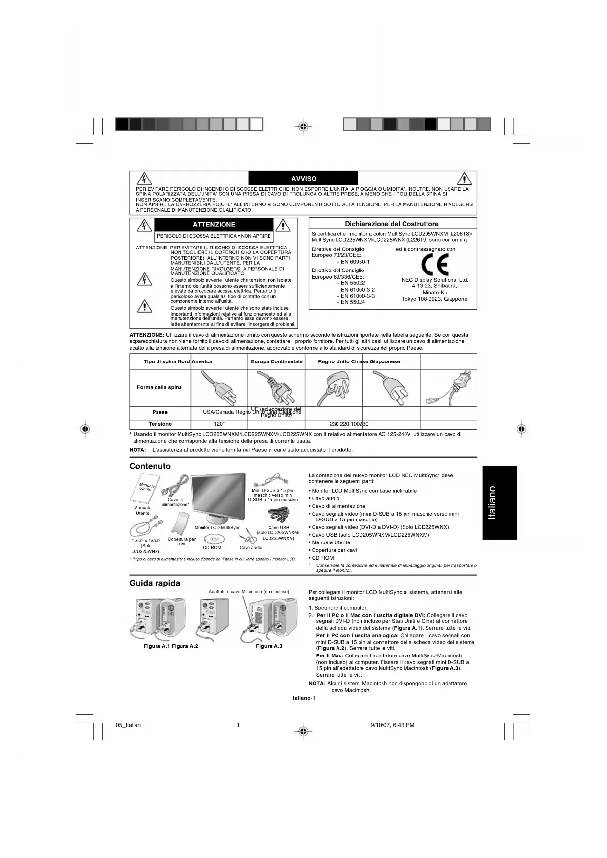 segnali DVI-D (non incluso per Stati Uniti e Cina) al connettore della scheda video del sistema (Figura A.1). Serrare tutte le viti. Per il PC con l’uscita analogica: Collegare il cavo segnali con mini D-SUB a 15 pin al connettore della scheda video del sistema (Figura A.2). Serrare tutte le viti. Per il Mac: Collegare l’adattatore cavo MultiSync-Macintosh (non incluso) al computer. Fissare il cavo segnali mini D-SUB a 15 pin all’adattatore cavo MultiSync Macintosh (Figura A.3). Serrare tutte le viti. NOTA: Alcuni sistemi Macintosh non dispongono di un adattatore cavo Macintosh. Figura A.1 Figura A.2 Adattatore cavo Macintosh (non incluso)CD ROM Figura A.3 ManualeUtente* Il tipo di cavo di alimentazione incluso dipende dal Paese in cui verrà spedito il monitor LCD.Cavo USB(solo LCD205WNXM/LCD225WNXM)Copertura per cavi 05_Italian 9/10/07, 6:43 PM1Italiano-2 Italiano