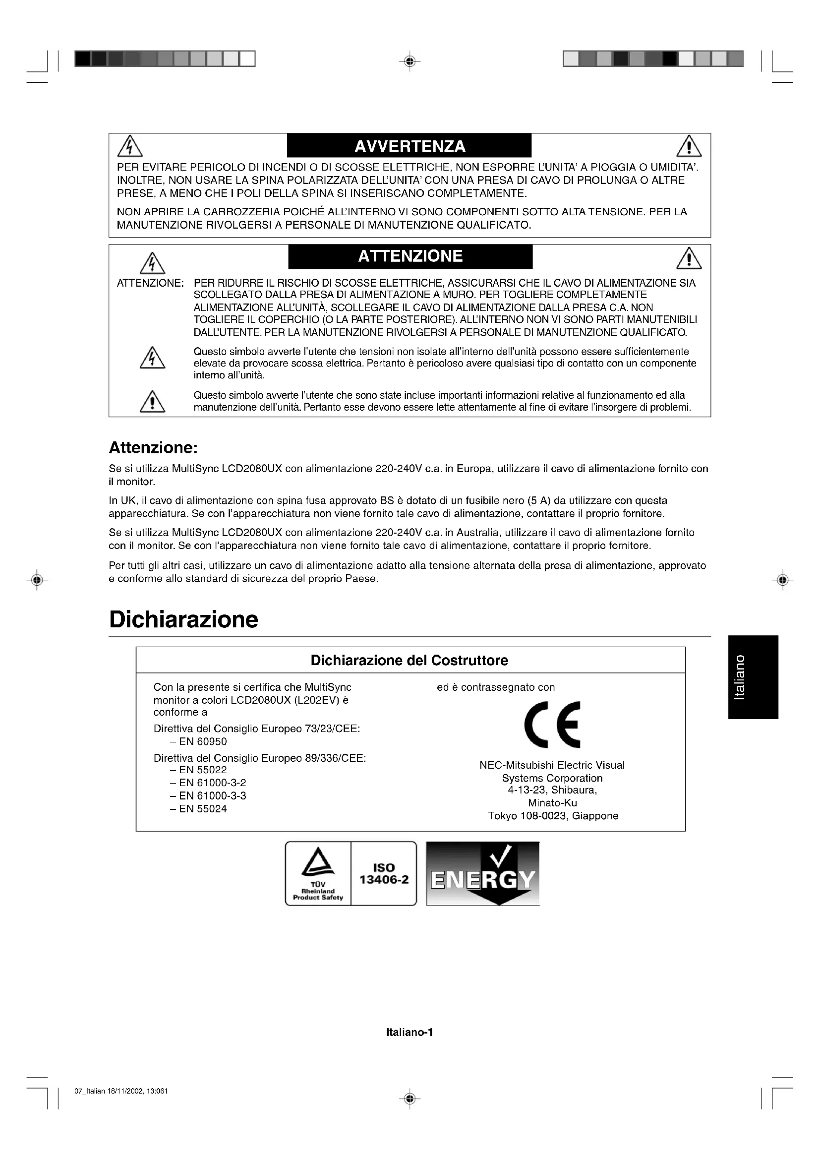 - N’utilisez pas du bleu primaire sur un fond sombre car cela rend la lecture difficile et peut occasionner une fatigue oculaire due à l’insuffisance du contraste. 06_French 18/11/2002, 13:0610Italiano Italiano-1 AVVERTENZA ATTENZIONE ATTENZIONE: PER RIDURRE IL RISCHIO DI SCOSSE ELETTRICHE, ASSICURARSI CHE IL CAVO DI ALIMENTAZIONE SIA SCOLLEGATO DALLA PRESA DI ALIMENTAZIONE A MURO. PER TOGLIERE COMPLETAMENTE ALIMENTAZIONE ALL’UNITÀ, SCOLLEGARE IL CAVO DI ALIMENTAZIONE DALLA PRESA C.A. NON TOGLIERE IL COPERCHIO (O LA PARTE POSTERIORE). ALL’INTERNO NON VI SONO PARTI MANUTENIBILI DALL’UTENTE. PER LA MANUTENZIONE RIVOLGERSI A PERSONALE DI MANUTENZIONE QUALIFICATO. Questo simbolo avverte l’utente che tensioni non isolate all’interno dell’unità possono essere sufficientemente elevate da provocare scossa elettrica. Pertanto è pericoloso avere qualsiasi tipo di contatto con un componente interno all’unità. Questo simbolo avverte l’utente che sono state incluse importanti informazioni relative al funzionamento ed alla manutenzione dell’unità. Pertanto esse devono essere lette attentamente al fine di evitare l’insorgere di problemi. Attenzione: Se si utilizza MultiSync LCD2080UX con alimentazione 220-240V c.a. in Europa, utilizzare il cavo di alimentazione fornito con il monitor. In UK, il cavo di alimentazione con spina fusa approvato BS è dotato di un fusibile nero (5 A) da utilizzare con questa apparecchiatura. Se con l’apparecchiatura non viene fornito tale cavo di alimentazione, contattare il proprio fornitore. Se si utilizza MultiSync LCD2080UX con alimentazione 220-240V c.a. in Australia, utilizzare il cavo di alimentazione fornito con il monitor. Se con l’apparecchiatura non viene fornito tale cavo di alimentazione, contattare il proprio fornitore. Per tutti gli altri casi, utilizzare un cavo di alimentazione adatto alla tensione alternata della presa di alimentazione, approvato e conforme allo standard di sicurezza del proprio Paese. PER EVITARE PERICOLO DI INCENDI O DI SCOSSE ELETTRICHE, NON ESPORRE L’UNITA’ A PIOGGIA O UMIDITA’. INOLTRE, NON USARE LA SPINA POLARIZZATA DELL’UNITA’ CON UNA PRESA DI CAVO DI PROLUNGA O ALTRE PRESE, A MENO CHE I POLI DELLA SPINA SI INSERISCANO COMPLETAMENTE. NON APRIRE LA CARROZZERIA POICHÉ ALL’INTERNO VI SONO COMPONENTI SOTTO ALTA TENSIONE. PER LA MANUTENZIONE RIVOLGERSI A PERSONALE DI MANUTENZIONE QUALIFICATO. Dichiarazione Dichiarazione del Costruttore Con la presente si certifica che MultiSync monitor a colori LCD2080UX (L202EV) è conforme a Direttiva del Consiglio Europeo 73/23/CEE: – EN 60950 Direttiva del Consiglio Europeo 89/336/CEE: – EN 55022 – EN 61000-3-2 – EN 61000-3-3 – EN 55024 ed è contrassegnato con NEC-Mitsubishi Electric Visual Systems Corporation 4-13-23, Shibaura, Minato-Ku Tokyo 108-0023, Giappone 07_Italian 18/11/2002, 13:061Italiano-2 Indice La confezione del vostro nuovo monitor LCD NEC-Mitsubishi MultiSync* deve contenere quanto segue: