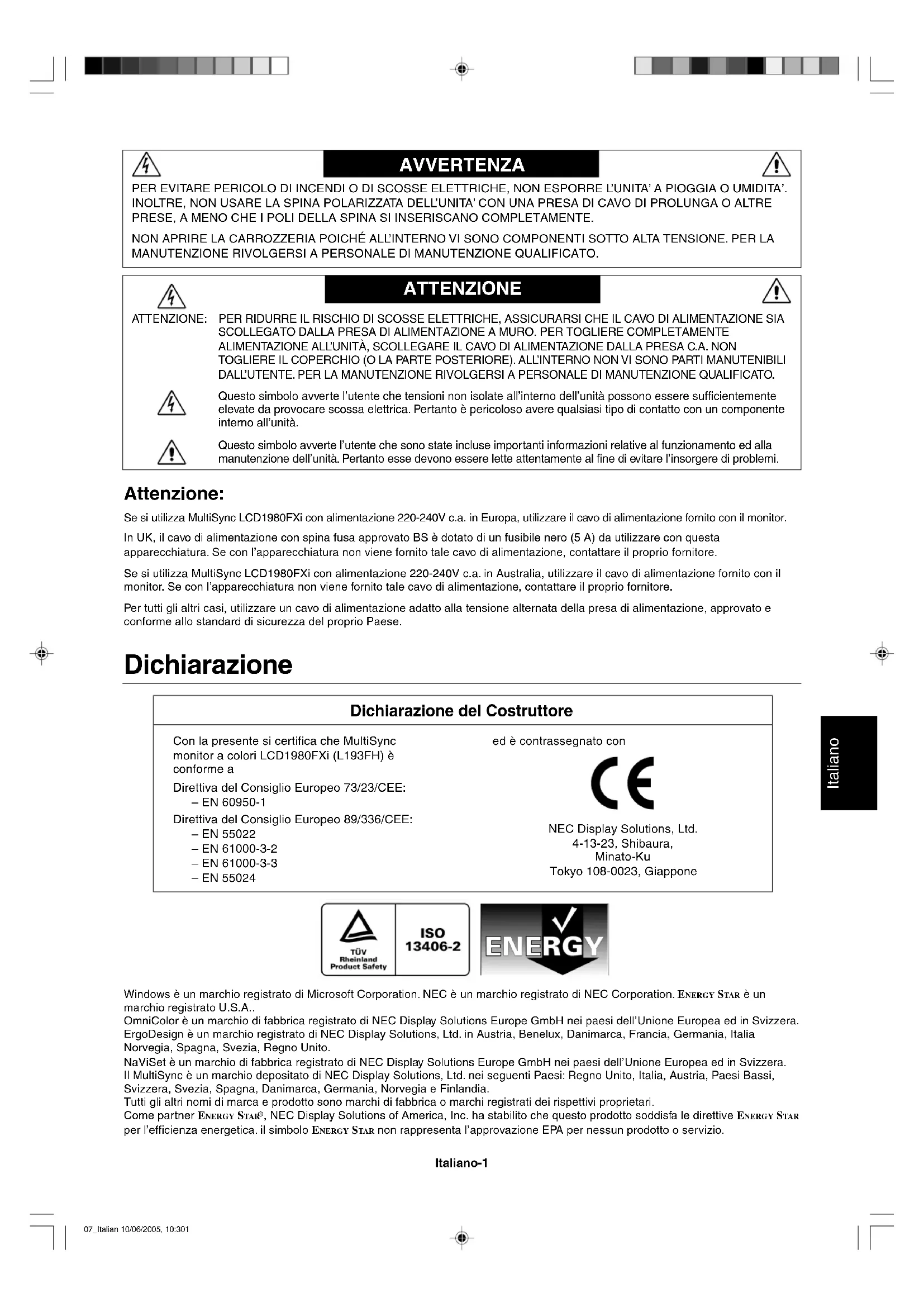 - N’utilisez pas du bleu primaire sur un fond sombre car cela rend la lecture difficile et peut occasionner une fatigue oculaire due à l’insuffisance du contraste. 06_French 10/06/2005, 10:2911Français-12 06_French 10/06/2005, 10:2912Italiano Italiano-1 AVVERTENZA ATTENZIONE ATTENZIONE: PER RIDURRE IL RISCHIO DI SCOSSE ELETTRICHE, ASSICURARSI CHE IL CAVO DI ALIMENTAZIONE SIA SCOLLEGATO DALLA PRESA DI ALIMENTAZIONE A MURO. PER TOGLIERE COMPLETAMENTE ALIMENTAZIONE ALL’UNITÀ, SCOLLEGARE IL CAVO DI ALIMENTAZIONE DALLA PRESA C.A. NON TOGLIERE IL COPERCHIO (O LA PARTE POSTERIORE). ALL’INTERNO NON VI SONO PARTI MANUTENIBILI DALL’UTENTE. PER LA MANUTENZIONE RIVOLGERSI A PERSONALE DI MANUTENZIONE QUALIFICATO. Questo simbolo avverte l’utente che tensioni non isolate all’interno dell’unità possono essere sufficientemente elevate da provocare scossa elettrica. Pertanto è pericoloso avere qualsiasi tipo di contatto con un componente interno all’unità. Questo simbolo avverte l’utente che sono state incluse importanti informazioni relative al funzionamento ed alla manutenzione dell’unità. Pertanto esse devono essere lette attentamente al fine di evitare l’insorgere di problemi. Attenzione: Se si utilizza MultiSync LCD1980FXi con alimentazione 220-240V c.a. in Europa, utilizzare il cavo di alimentazione fornito con il monitor. In UK, il cavo di alimentazione con spina fusa approvato BS è dotato di un fusibile nero (5 A) da utilizzare con questa apparecchiatura. Se con l’apparecchiatura non viene fornito tale cavo di alimentazione, contattare il proprio fornitore. Se si utilizza MultiSync LCD1980FXi con alimentazione 220-240V c.a. in Australia, utilizzare il cavo di alimentazione fornito con il monitor. Se con l’apparecchiatura non viene fornito tale cavo di alimentazione, contattare il proprio fornitore. Per tutti gli altri casi, utilizzare un cavo di alimentazione adatto alla tensione alternata della presa di alimentazione, approvato e conforme allo standard di sicurezza del proprio Paese. PER EVITARE PERICOLO DI INCENDI O DI SCOSSE ELETTRICHE, NON ESPORRE L’UNITA’ A PIOGGIA O UMIDITA’. INOLTRE, NON USARE LA SPINA POLARIZZATA DELL’UNITA’ CON UNA PRESA DI CAVO DI PROLUNGA O ALTRE PRESE, A MENO CHE I POLI DELLA SPINA SI INSERISCANO COMPLETAMENTE. NON APRIRE LA CARROZZERIA POICHÉ ALL’INTERNO VI SONO COMPONENTI SOTTO ALTA TENSIONE. PER LA MANUTENZIONE RIVOLGERSI A PERSONALE DI MANUTENZIONE QUALIFICATO. Dichiarazione Dichiarazione del Costruttore Con la presente si certifica che MultiSync monitor a colori LCD1980FXi (L193FH) è conforme a Direttiva del Consiglio Europeo 73/23/CEE: – EN 60950-1 Direttiva del Consiglio Europeo 89/336/CEE: – EN 55022 – EN 61000-3-2 – EN 61000-3-3 – EN 55024 ed è contrassegnato con NEC Display Solutions, Ltd. 4-13-23, Shibaura, Minato-Ku Tokyo 108-0023, Giappone Windows è un marchio registrato di Microsoft Corporation. NEC è un marchio registrato di NEC Corporation. ENERGY STAR è un marchio registrato U.S.A.. OmniColor è un marchio di fabbrica registrato di NEC Display Solutions Europe GmbH nei paesi dell’Unione Europea ed in Svizzera. ErgoDesign è un marchio registrato di NEC Display Solutions, Ltd. in Austria, Benelux, Danimarca, Francia, Germania, Italia Norvegia, Spagna, Svezia, Regno Unito. NaViSet è un marchio di fabbrica registrato di NEC Display Solutions Europe GmbH nei paesi dell’Unione Europea ed in Svizzera. Il MultiSync è un marchio depositato di NEC Display Solutions, Ltd. nei seguenti Paesi: Regno Unito, Italia, Austria, Paesi Bassi, Svizzera, Svezia, Spagna, Danimarca, Germania, Norvegia e Finlandia.Tutti gli altri nomi di marca e prodotto sono marchi di fabbrica o marchi registrati dei rispettivi proprietari. Come partner ENERGY STAR