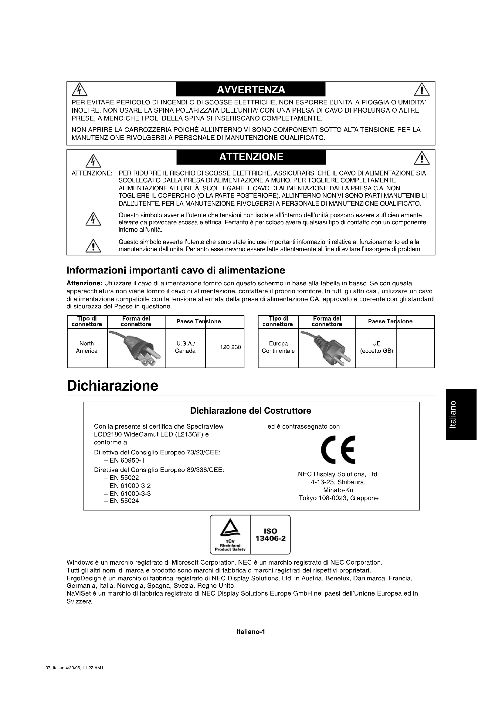- Imbibez le chiffon avec un détergent doux mélangé à de l’eau, essuyez le boîtier et séchez-le avec un chiffon doux. REMARQUE : La surface du boîtier contient de nombreuses matières plastiques. N'UTILISEZ PAS de benzène, détergent alcalin, détergent à base d’alcool, nettoyant pour vitres, cire, vernis, lessive ou insecticide. N’exposez pas de matières en caoutchouc ou en vinyle au contact du boîtier pendant de longues périodes. Ces types de liquides et de tissus peuvent abîmer, fissurer ou écailler la peinture. 06_French 4/20/05, 11:22 AM8Italiano Italiano-1 AVVERTENZA ATTENZIONE ATTENZIONE: PER RIDURRE IL RISCHIO DI SCOSSE ELETTRICHE, ASSICURARSI CHE IL CAVO DI ALIMENTAZIONE SIA SCOLLEGATO DALLA PRESA DI ALIMENTAZIONE A MURO. PER TOGLIERE COMPLETAMENTE ALIMENTAZIONE ALL’UNITÀ, SCOLLEGARE IL CAVO DI ALIMENTAZIONE DALLA PRESA C.A. NON TOGLIERE IL COPERCHIO (O LA PARTE POSTERIORE). ALL’INTERNO NON VI SONO PARTI MANUTENIBILI DALL’UTENTE. PER LA MANUTENZIONE RIVOLGERSI A PERSONALE DI MANUTENZIONE QUALIFICATO. Questo simbolo avverte l’utente che tensioni non isolate all’interno dell’unità possono essere sufficientemente elevate da provocare scossa elettrica. Pertanto è pericoloso avere qualsiasi tipo di contatto con un componente interno all’unità. Questo simbolo avverte l’utente che sono state incluse importanti informazioni relative al funzionamento ed alla manutenzione dell’unità. Pertanto esse devono essere lette attentamente al fine di evitare l’insorgere di problemi. PER EVITARE PERICOLO DI INCENDI O DI SCOSSE ELETTRICHE, NON ESPORRE L’UNITA’ A PIOGGIA O UMIDITA’. INOLTRE, NON USARE LA SPINA POLARIZZATA DELL’UNITA’ CON UNA PRESA DI CAVO DI PROLUNGA O ALTRE PRESE, A MENO CHE I POLI DELLA SPINA SI INSERISCANO COMPLETAMENTE. NON APRIRE LA CARROZZERIA POICHÉ ALL’INTERNO VI SONO COMPONENTI SOTTO ALTA TENSIONE. PER LA MANUTENZIONE RIVOLGERSI A PERSONALE DI MANUTENZIONE QUALIFICATO. Dichiarazione Dichiarazione del Costruttore Con la presente si certifica che SpectraView LCD2180 WideGamut LED (L215GF) è conforme a Direttiva del Consiglio Europeo 73/23/CEE: – EN 60950-1 Direttiva del Consiglio Europeo 89/336/CEE: – EN 55022 – EN 61000-3-2 – EN 61000-3-3 – EN 55024 ed è contrassegnato con NEC Display Solutions, Ltd. 4-13-23, Shibaura, Minato-Ku Tokyo 108-0023, Giappone Windows è un marchio registrato di Microsoft Corporation. NEC è un marchio registrato di NEC Corporation. Tutti gli altri nomi di marca e prodotto sono marchi di fabbrica o marchi registrati dei rispettivi proprietari. ErgoDesign è un marchio di fabbrica registrato di NEC Display Solutions, Ltd. in Austria, Benelux, Danimarca, Francia, Germania, Italia, Norvegia, Spagna, Svezia, Regno Unito. NaViSet è un marchio di fabbrica registrato di NEC Display Solutions Europe GmbH nei paesi dell’Unione Europea ed in Svizzera. Informazioni importanti cavo di alimentazione Attenzione: Utilizzare il cavo di alimentazione fornito con questo schermo in base alla tabella in basso. Se con questa apparecchiatura non viene fornito il cavo di alimentazione, contattare il proprio fornitore. In tutti gli altri casi, utilizzare un cavo di alimentazione compatibile con la tensione alternata della presa di alimentazione CA, approvato e coerente con gli standard di sicurezza del Paese in questione. EuropaContinentaleNorthAmericaForma delconnettorePaese Tensione120 230U.S.A./Canada (eccetto GB)Tipo diconnettoreForma delconnettorePaese TensioneTipo diconnettore07_Italian 4/20/05, 11:22 AM1Italiano-2