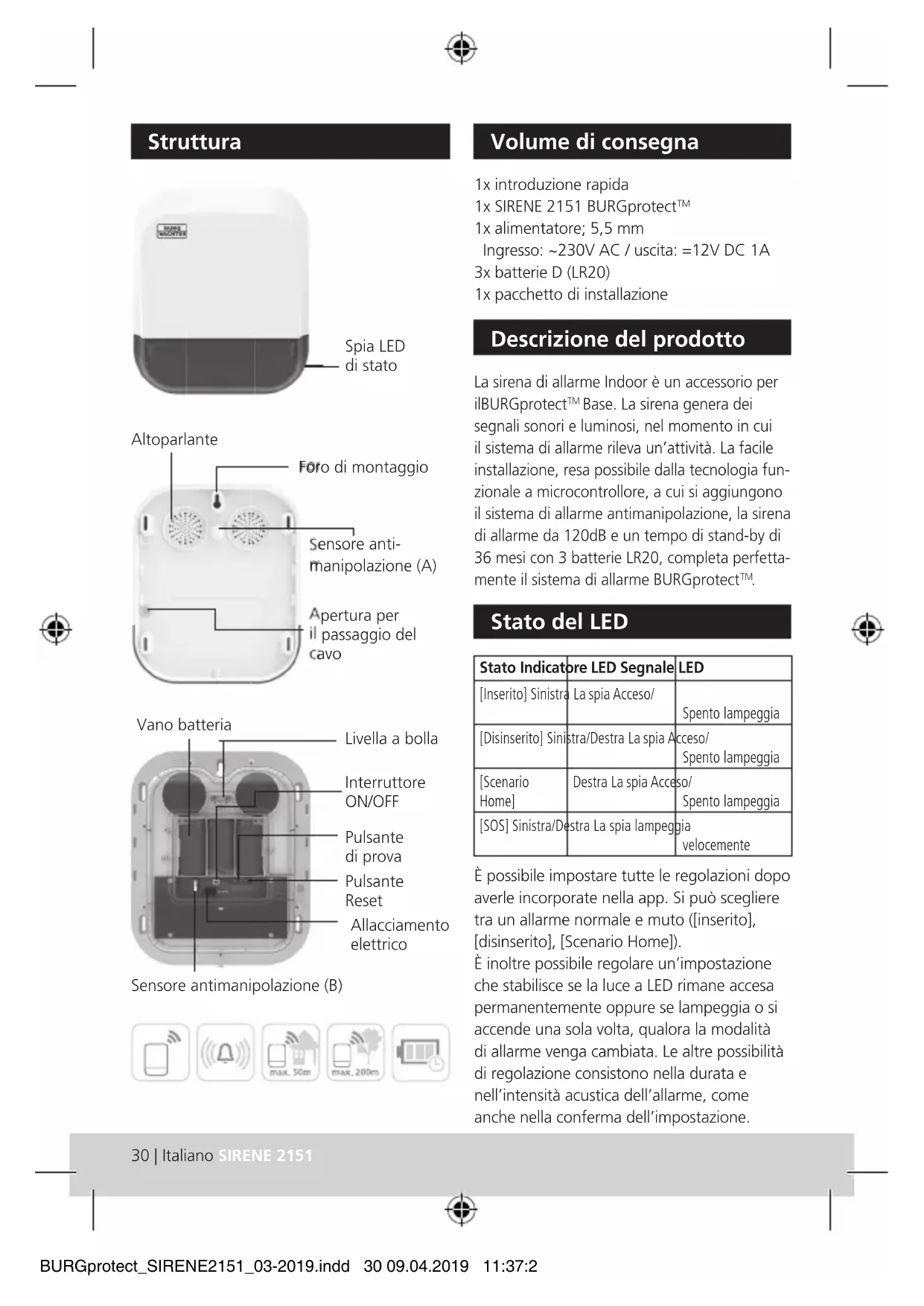 È possibile impostare tutte le regolazioni dopo averle incorporate nella app. Si può scegliere tra un allarme normale e muto ([inserito], [disinserito], [Scenario Home]). È inoltre possibile regolare un’impostazione che stabilisce se la luce a LED rimane accesa permanentemente oppure se lampeggia o si accende una sola volta, qualora la modalità di allarme venga cambiata. Le altre possibilità di regolazione consistono nella durata e nell’intensità acustica dell’allarme, come anche nella conferma dell’impostazione. Volume di consegna Descrizione del prodotto Stato del LED Stato Indicatore LED Segnale LED [Inserito] Sinistra La spia Acceso/ Spento lampeggia [Disinserito] Sinistra/Destra La spia Acceso/ Spento lampeggia [Scenario Home] Destra La spia Acceso/ Spento lampeggia [SOS] Sinistra/Destra La spia lampeggia velocemente BA BURGprotect_SIRENE2151_03-2019.indd 30 09.04.2019 11:37:27Italiano | 31 SIRENE 2151 Tensione di esercizio DC 12V 1A Batterie 3 unità D (LR20) Corrente di esercizio max. (allarme) 350 mA Standby max. 20μA Raggio d’azione max. esterno Raggio d’azione max. interno Senza ostacoli 200 m* 50 m* Banda di frequenza 433.05 – 434.79 MHz Potenza massima di trasmissione <10mW (10dBm) Livello di rumore massimo della sirena 120 dB @ 30 cm Spia LED di stato Rosso (sinistra) / Rosso (destra) Classe IP IP54 Gamma di temperature di lavoro da -10 °C a 40 C° Umidità dell’aria ≤ 90% rh (non  condensante) Peso 951 g (senza batterie)