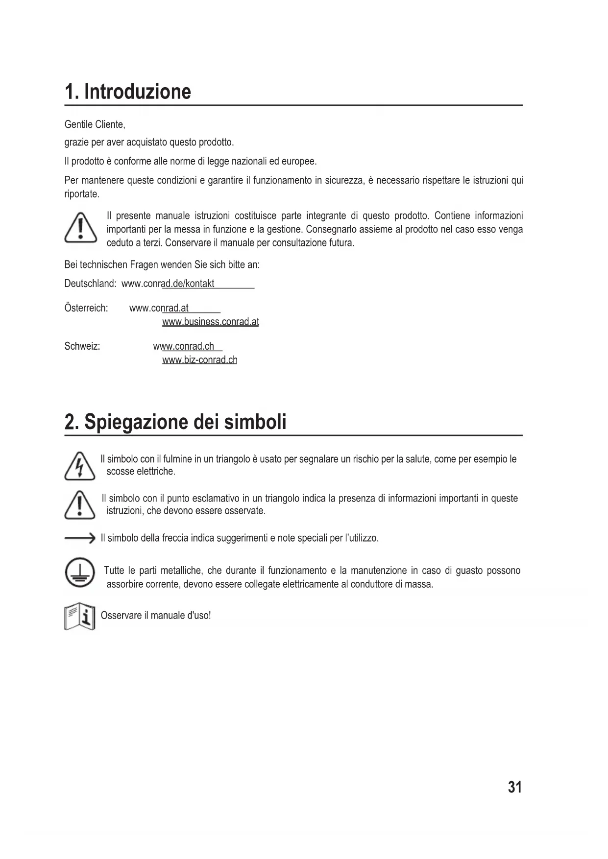Gentile Cliente, grazie per aver acquistato questo prodotto. Il prodotto è conforme alle norme di legge nazionali ed europee. Per mantenere queste condizioni e garantire il funzionamento in sicurezza, è necessario rispettare le istruzioni qui riportate. Il presente manuale istruzioni costituisce parte integrante di questo prodotto. Contiene informazioni importanti per la messa in funzione e la gestione. Consegnarlo assieme al prodotto nel caso esso venga ceduto a terzi. Conservare il manuale per consultazione futura. Bei technischen Fragen wenden Sie sich bitte an: Deutschland: www.conrad.de/kontakt Österreich: www.conrad.at www.business.conrad.at Schweiz: www.conrad.ch www.biz-conrad.ch