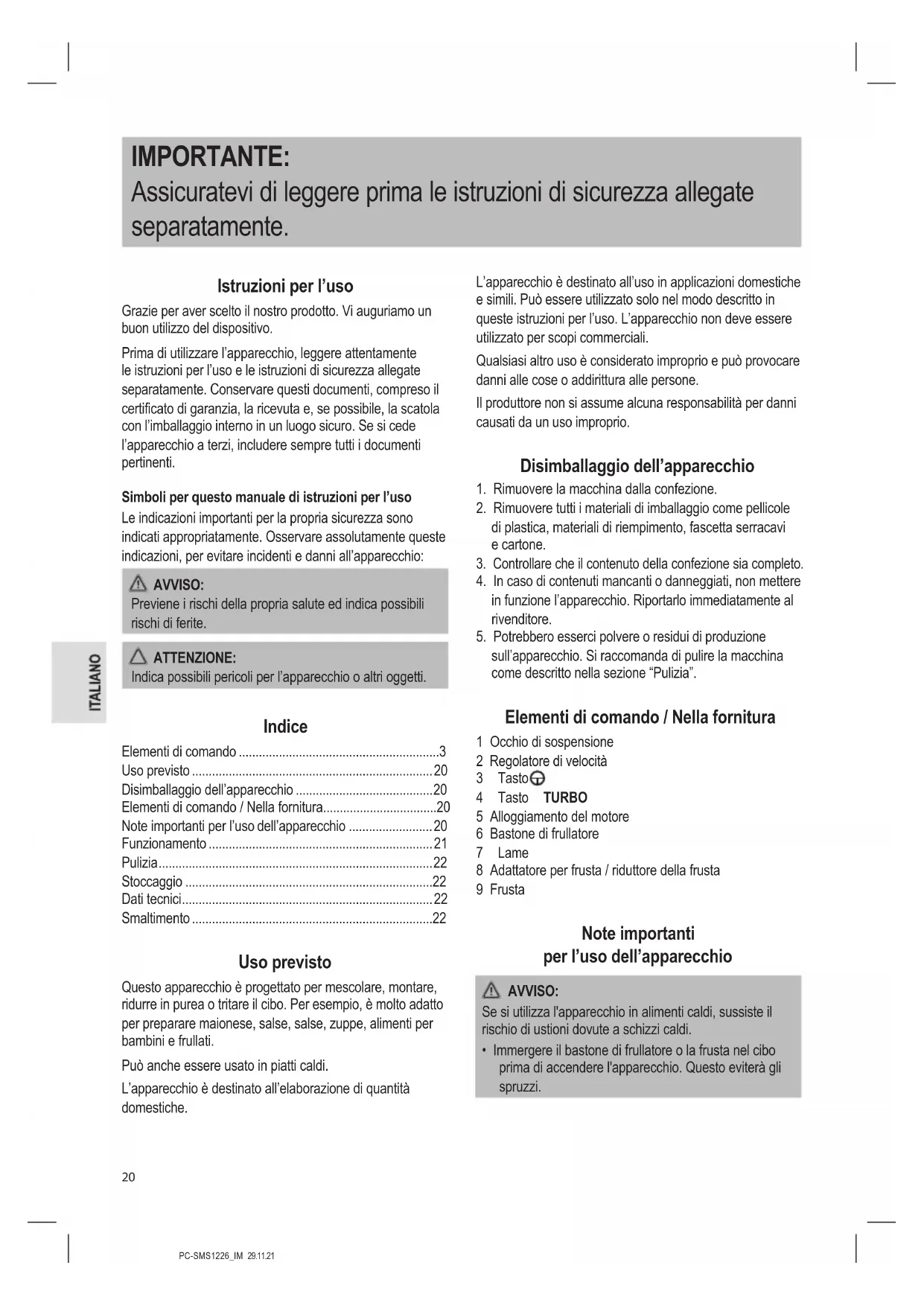 - Smaltimento Uso previsto Questo apparecchio è progettato per mescolare, montare, ridurre in purea o tritare il cibo. Per esempio, è molto adatto per preparare maionese, salse, salse, zuppe, alimenti per bambini e frullati. Può anche essere usato in piatti caldi. L’apparecchio è destinato all’elaborazione di quantità domestiche. L’apparecchio è destinato all’uso in applicazioni domestiche e simili. Può essere utilizzato solo nel modo descritto in queste istruzioni per l’uso. L’apparecchio non deve essere utilizzato per scopi commerciali. Qualsiasi altro uso è considerato improprio e può provocare danni alle cose o addirittura alle persone. Il produttore non si assume alcuna responsabilità per danni causati da un uso improprio. Disimballaggio dell’apparecchio p. 22