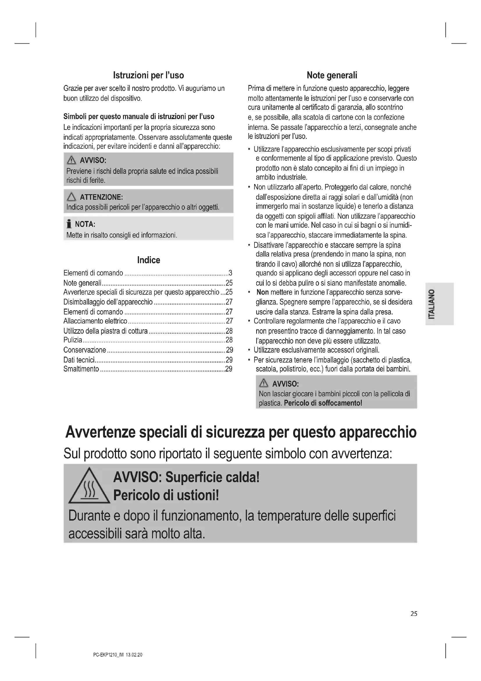 - Per sicurezza tenere l’imballaggio (sacchetto di plastica, scatola, polistirolo, ecc.) fuori dalla portata dei bambini. AVVISO: Non lasciar giocare i bambini piccoli con la pellicola di plastica. Pericolo di soffocamento! Avvertenze speciali di sicurezza per questo apparecchio Sul prodotto sono riportato il seguente simbolo con avvertenza: AVVISO: Superficie calda! Pericolo di ustioni! Durante e dopo il funzionamento, la temperature delle superfici accessibili sarà molto alta.PC-EKP1210_IM 13.02.20