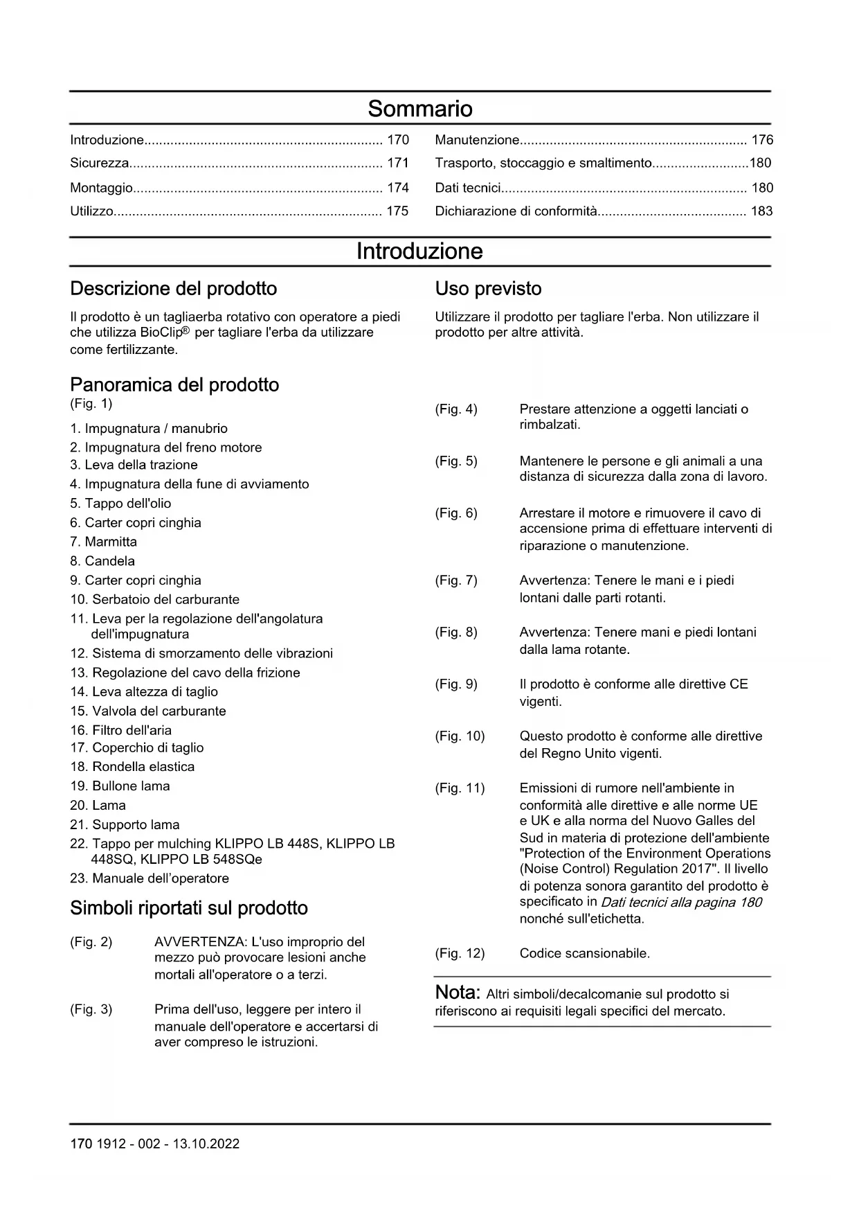 Simboli riportati sul prodotto (Fig. 2) AVVERTENZA: L'uso improprio del mezzo può provocare lesioni anche mortali all'operatore o a terzi. (Fig. 3) Prima dell'uso, leggere per intero il manuale dell'operatore e accertarsi di aver compreso le istruzioni. (Fig. 4) Prestare attenzione a oggetti lanciati o rimbalzati. (Fig. 5) Mantenere le persone e gli animali a una distanza di sicurezza dalla zona di lavoro. (Fig. 6) Arrestare il motore e rimuovere il cavo di accensione prima di effettuare interventi di riparazione o manutenzione. (Fig. 7) Avvertenza: Tenere le mani e i piedi lontani dalle parti rotanti. (Fig. 8) Avvertenza: Tenere mani e piedi lontani dalla lama rotante. (Fig. 9) Il prodotto è conforme alle direttive CE vigenti. (Fig. 10) Questo prodotto è conforme alle direttive del Regno Unito vigenti. (Fig. 11) Emissioni di rumore nell'ambiente in conformità alle direttive e alle norme UE e UK e alla norma del Nuovo Galles del Sud in materia di protezione dell'ambiente "Protection of the Environment Operations (Noise Control) Regulation 2017". Il livello di potenza sonora garantito del prodotto è specificato in Dati tecnici alla pagina 180 nonché sull'etichetta. (Fig. 12) Codice scansionabile. Nota: Altri simboli/decalcomanie sul prodotto si riferiscono ai requisiti legali specifici del mercato. 170 1912 - 002 - 13.10.2022Decalcomania sul prodotto, solo per Australia e Nuova Zelanda (Fig. 13) Tenere mani e piedi lontani dalla lama rotante. Emissioni Euro V AVVERTENZA: La manomissione del motore rende nulla l'omologazione UE del prodotto. Responsabilità del prodotto Come indicato nelle leggi vigenti in materia di responsabilità obbligatoria sul prodotto, non siamo responsabili per eventuali danni causati dal nostro prodotto se: