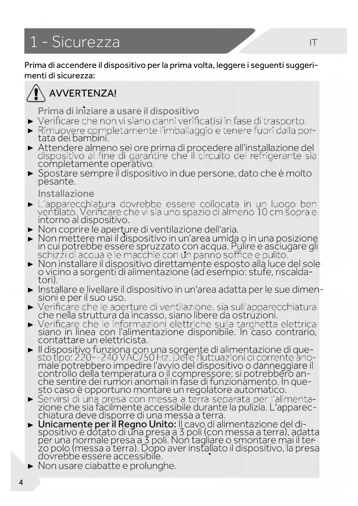 eezer. Attenzione: Le bottiglie possono esplodere. l’appare- , sensor- vicina- mentazione dell’app- Non conservare o utilizzare materiali in ammabili, esplosivi o corrosivi all'in- In modalità refrigerazione senza vano a 4 stelle: questo apparecchio fr- igoriferio non è adatto per congelare i prodotti alimentari; in modalità congelamento con vano a 4 stelle questo apparecchio di congelamen- to non è per la refrigerazione di alimenti.1 - Sicurezza
